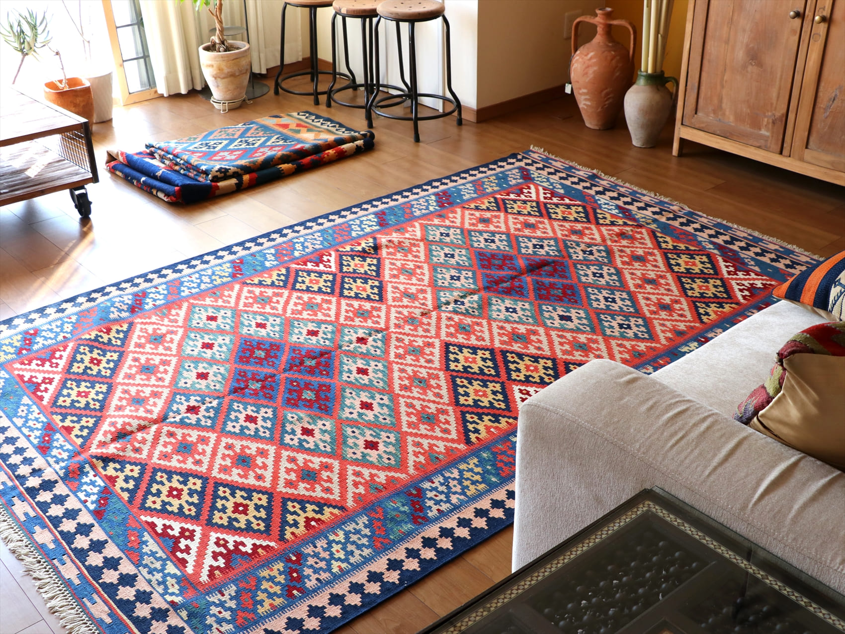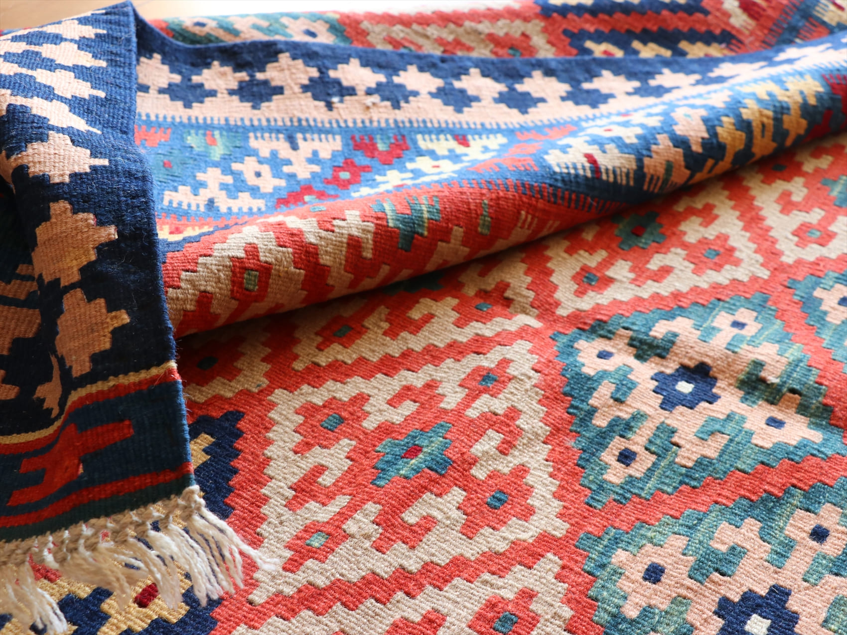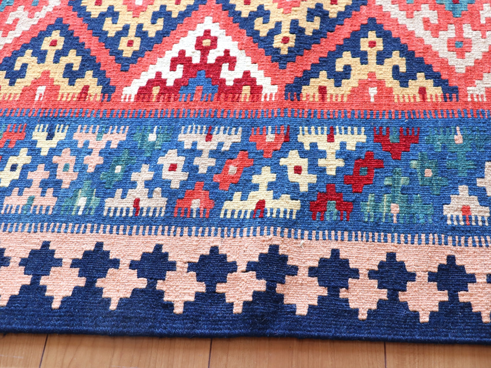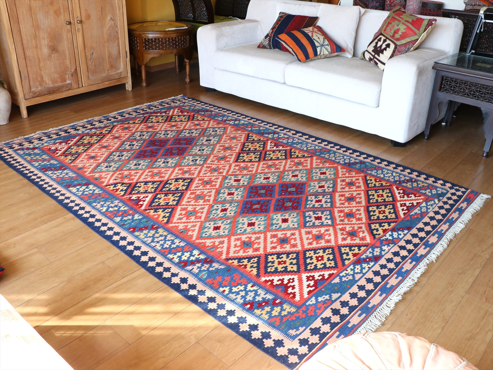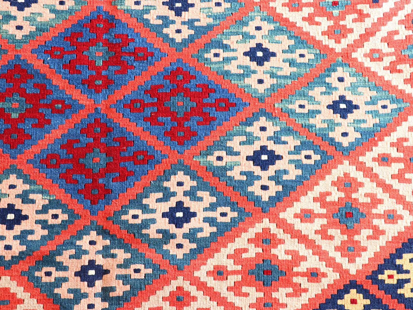 | 明るい発色がきれいな、手織りキリム。ギャッベを織ることで知られる、イラン南部の遊牧民「カシュカイ」の人々が現在も織り続けている、伝統的なデザインのキリムです。新しく織っているということもあり、かなり整った仕上がりですが、よく見ると手織りならではの個性的な表情が一枚一枚にあり、温かみのある印象です。 |