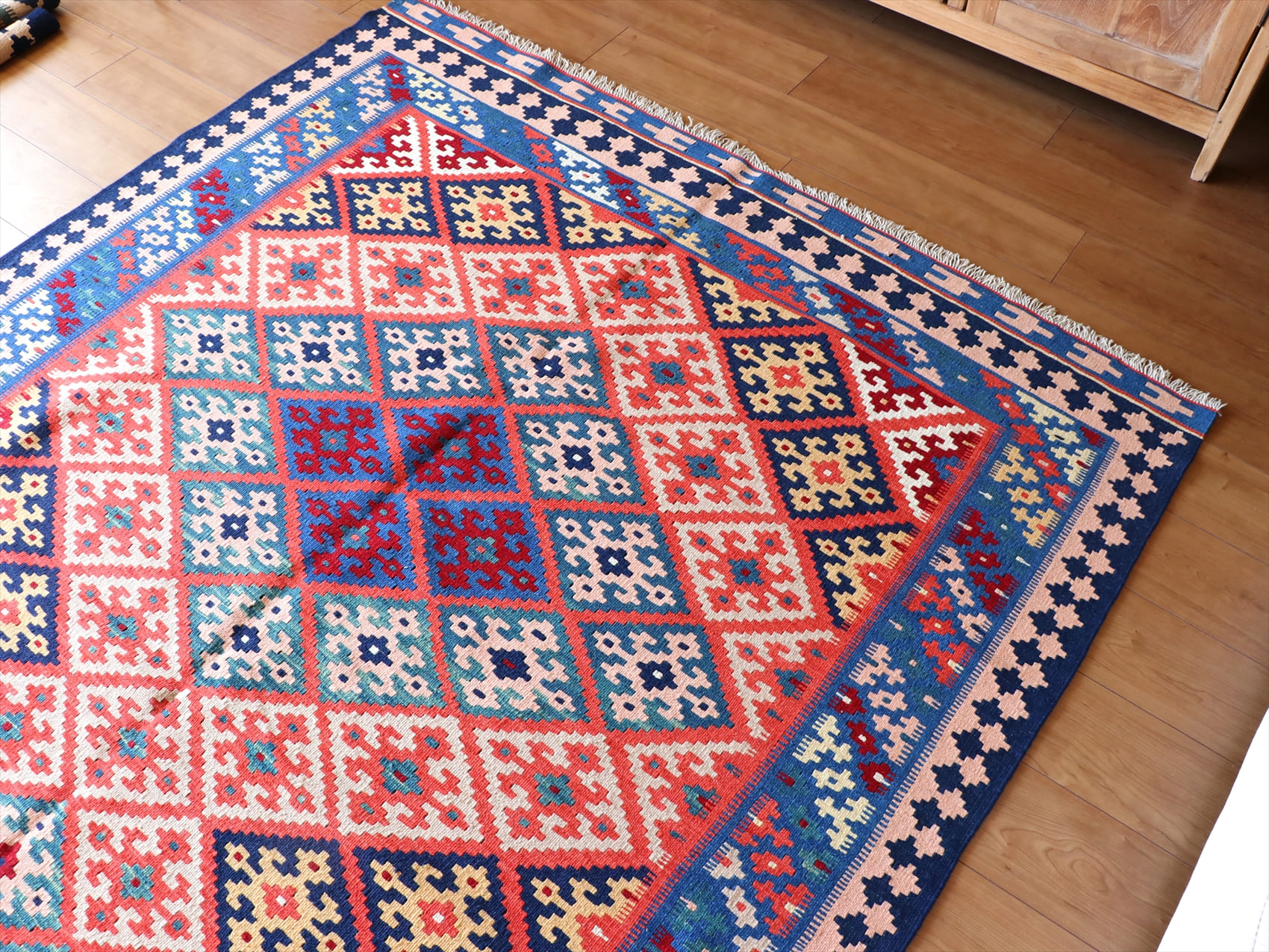| スリット織りで、色の切り替え部分に隙間はあるものの、織り目は引き締まっているので、あまり気になりません。ダイニングテーブルの下に敷くなどにおすすめです。 |