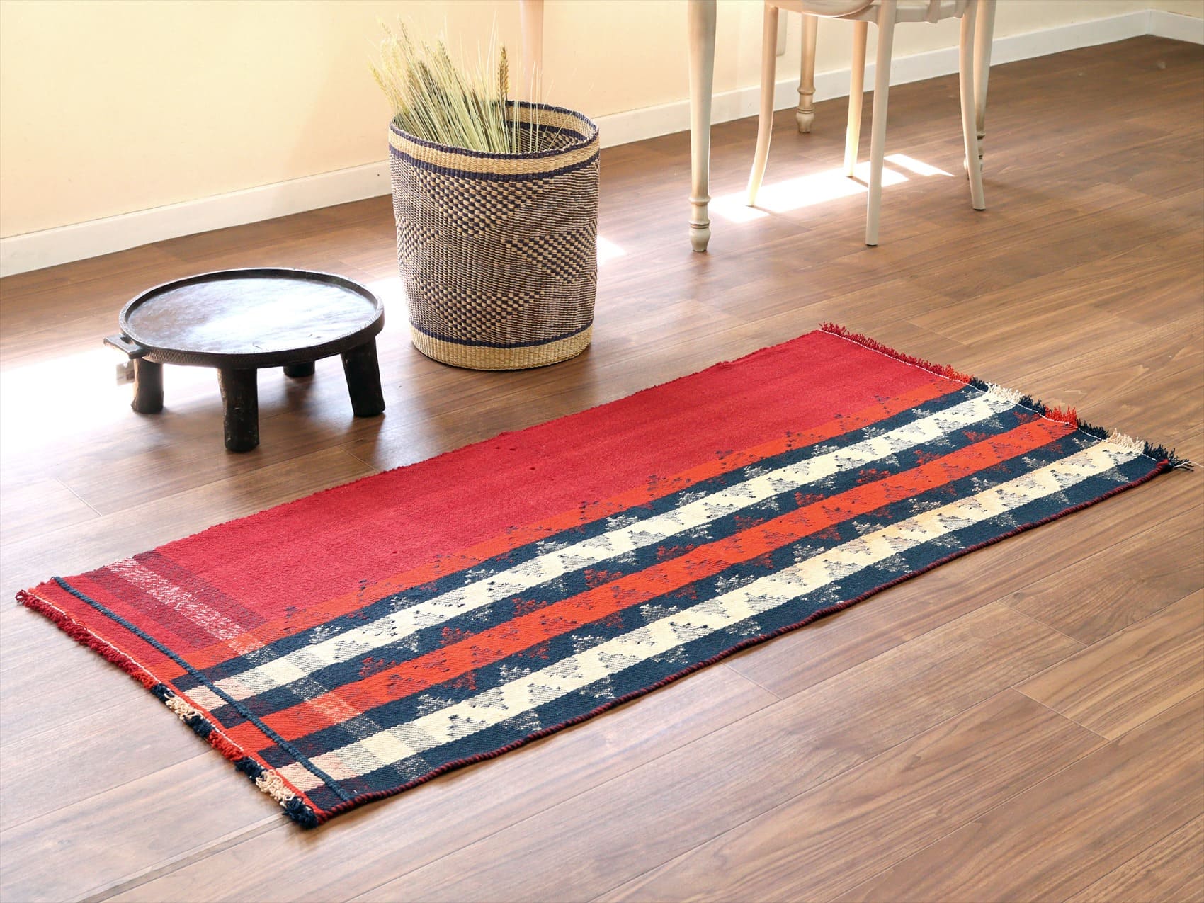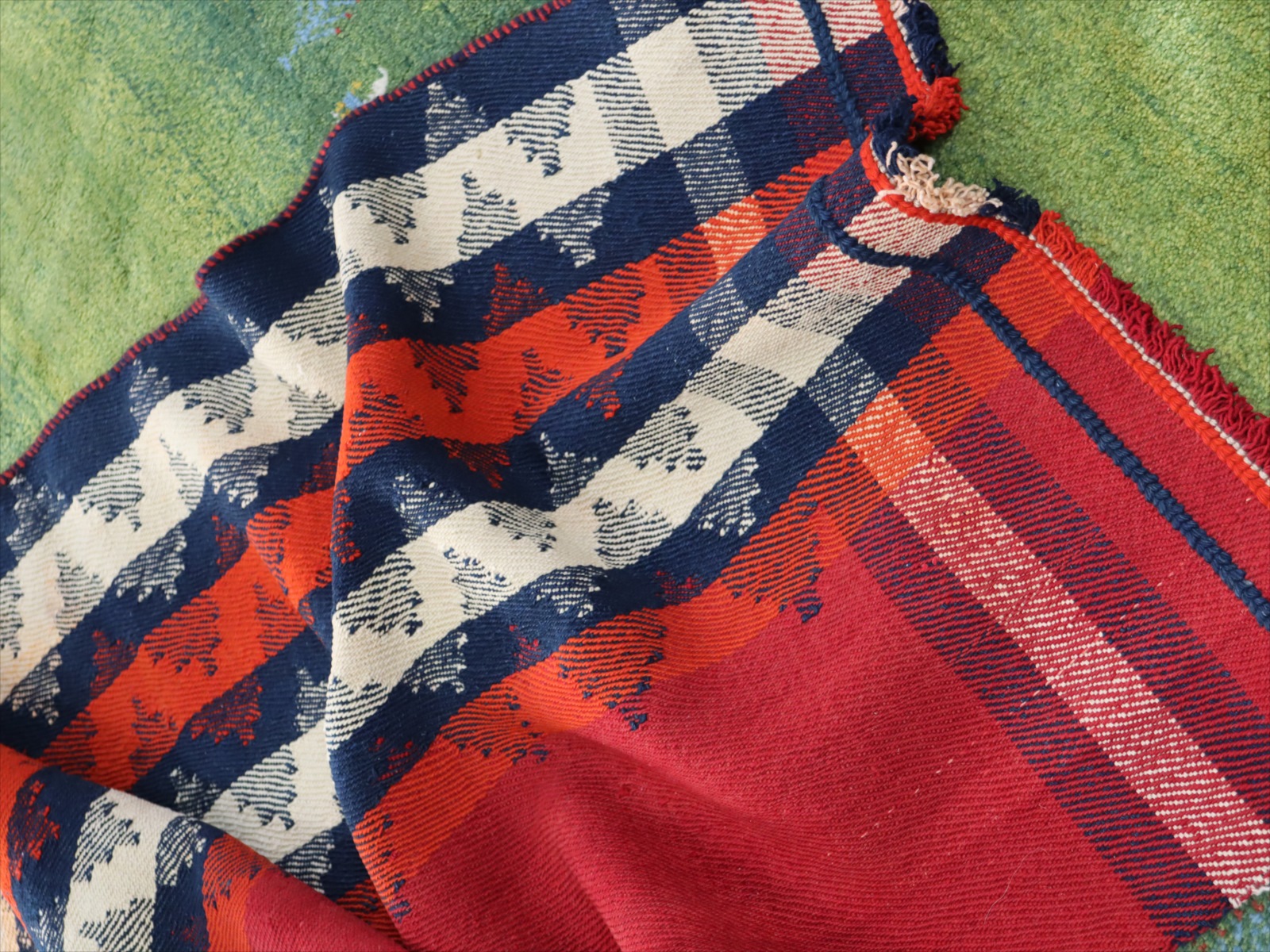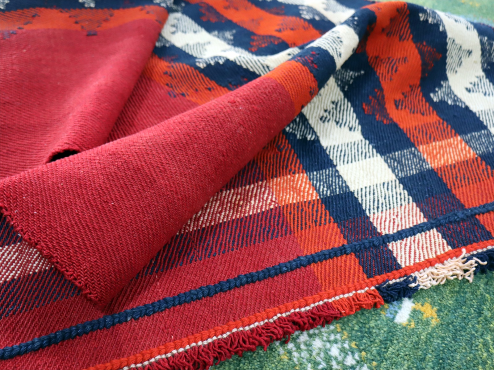 | ややゆがんでいます。 カシュカイ族の織るキリムは一般的にトルコキリムより厚みがありがっちりとした質感です。織り地は厚みがあり、ぎゅっと目が詰まって、固くしっかりとしています。 |