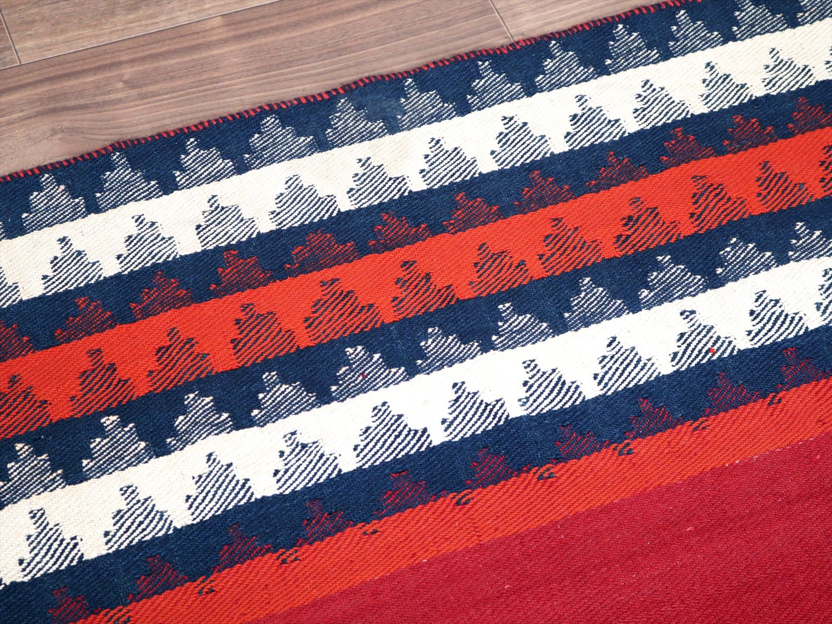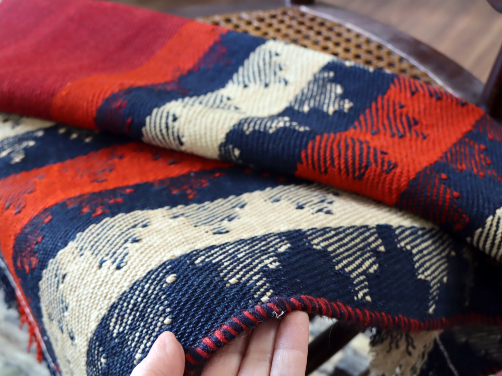 | カシュカイ族の織るキリムは一般的にトルコキリムより厚みがありがっちりとした質感です。織り地は厚みがあり、ぎゅっと目が詰まって、固くしっかりとしています。 |