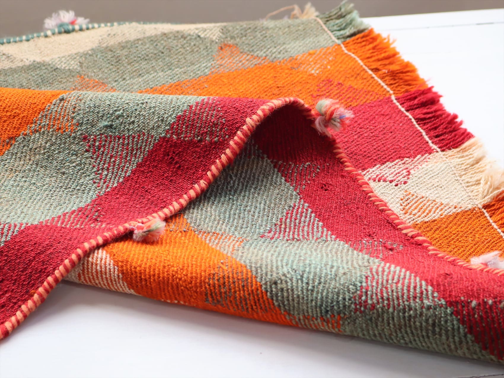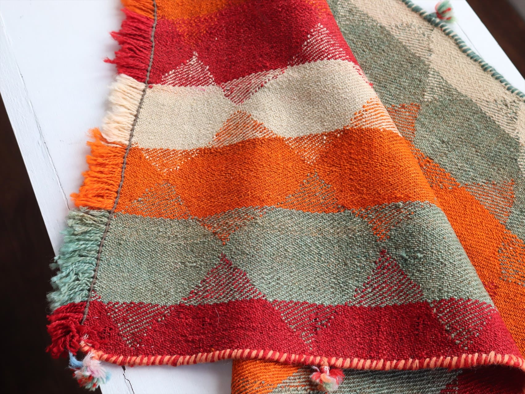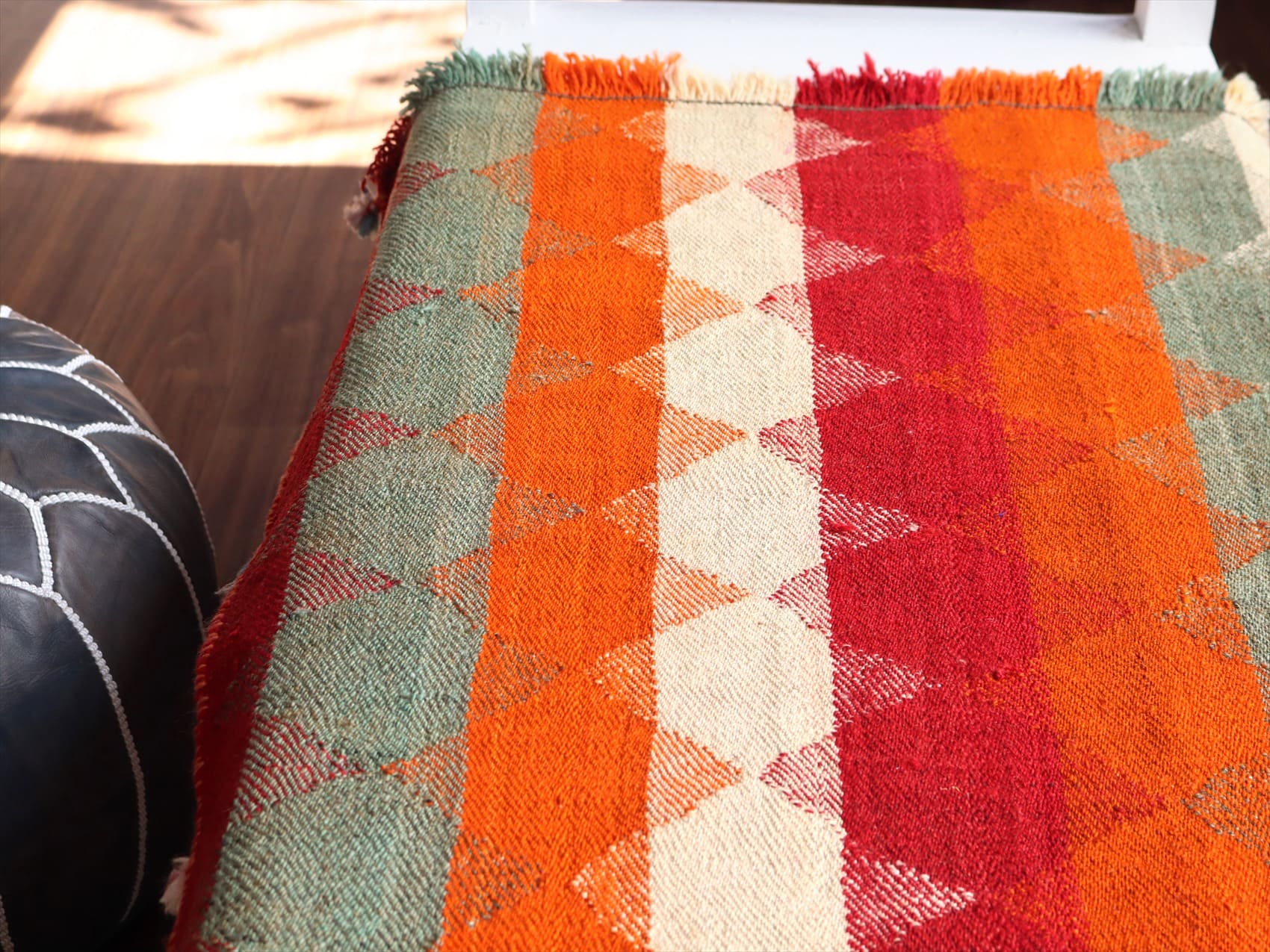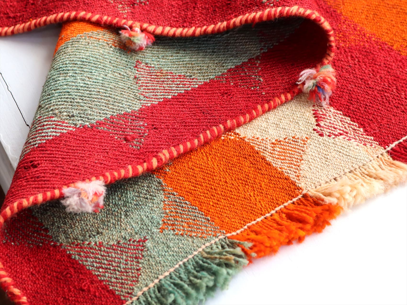 | カシュカイ族の織るキリムは一般的にトルコキリムより厚みがありがっちりとした質感です。織り地は厚みがあり、ぎゅっと目が詰まって、固くしっかりとしています。 |