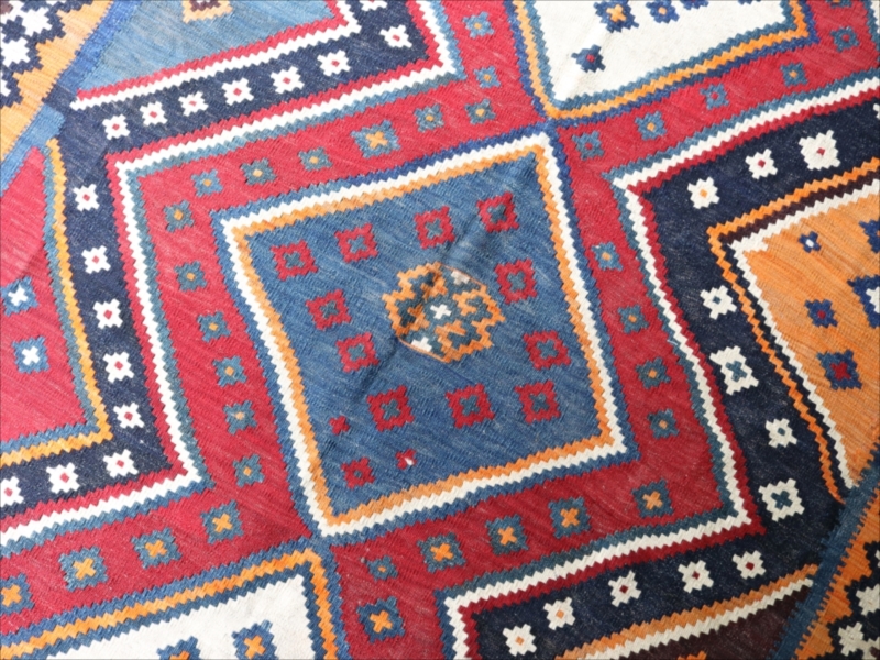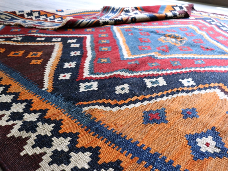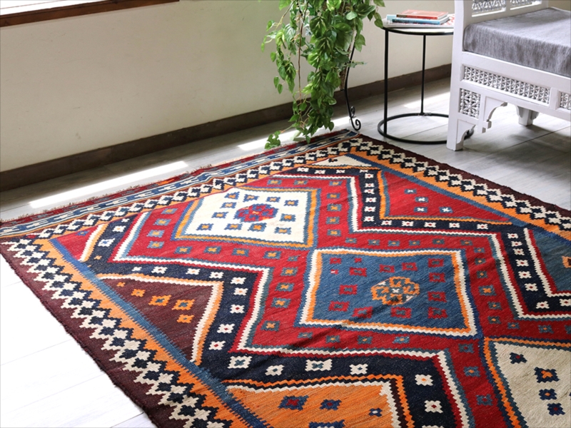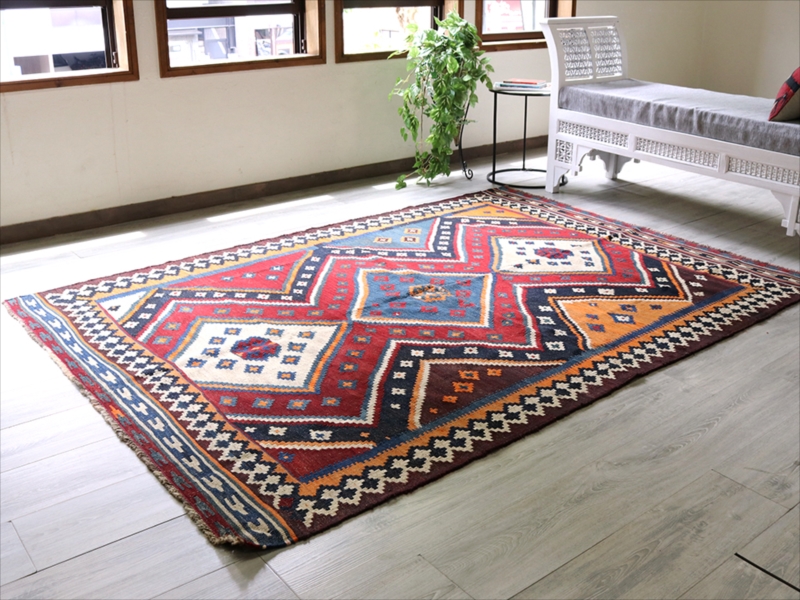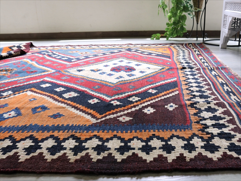 | イラン南部を中心に居住する遊牧民のルリ族のキリム。中央に3つのダイヤを配置した大胆なデザインです。全体に濃い色合いを残しています。 |