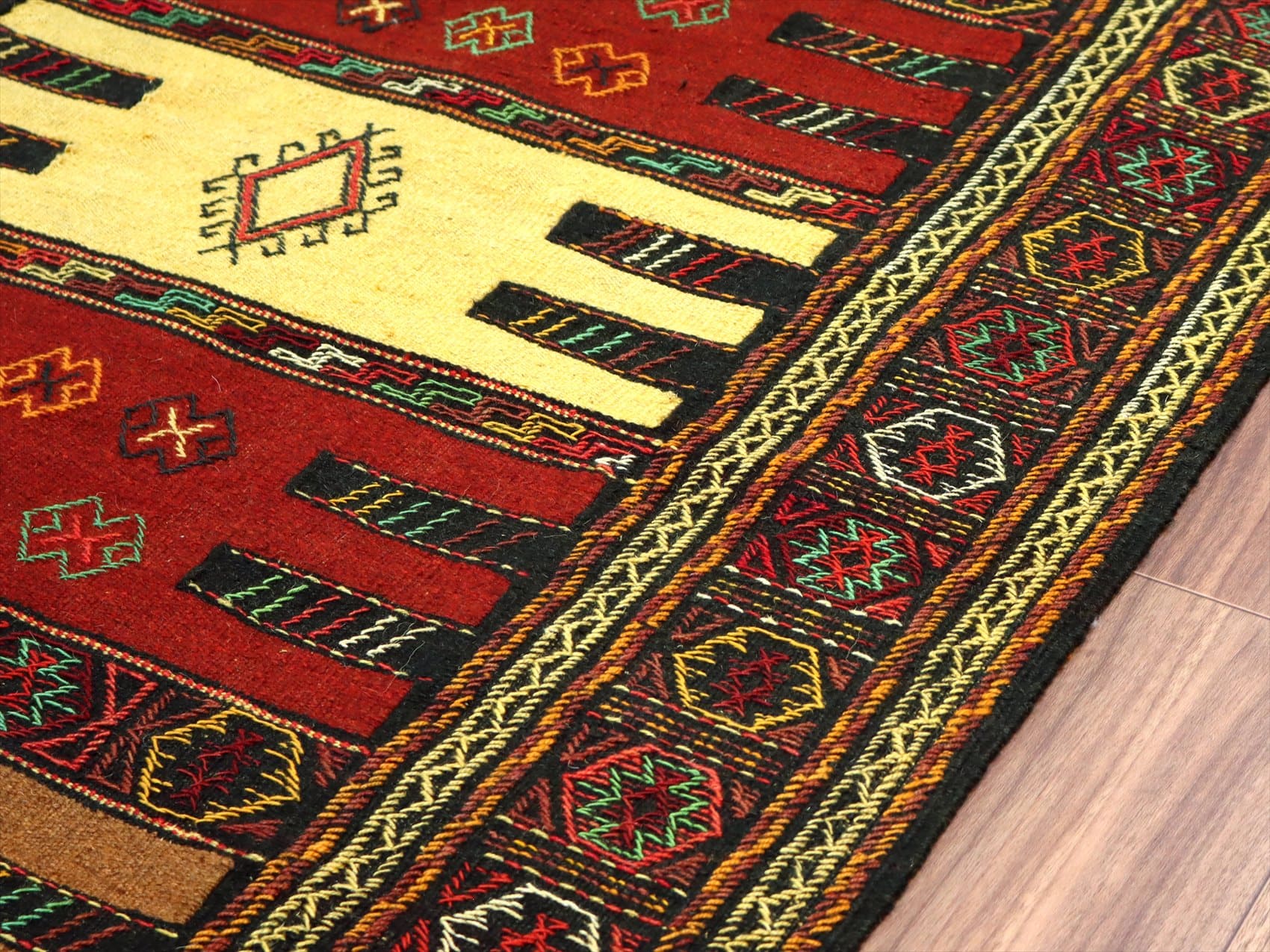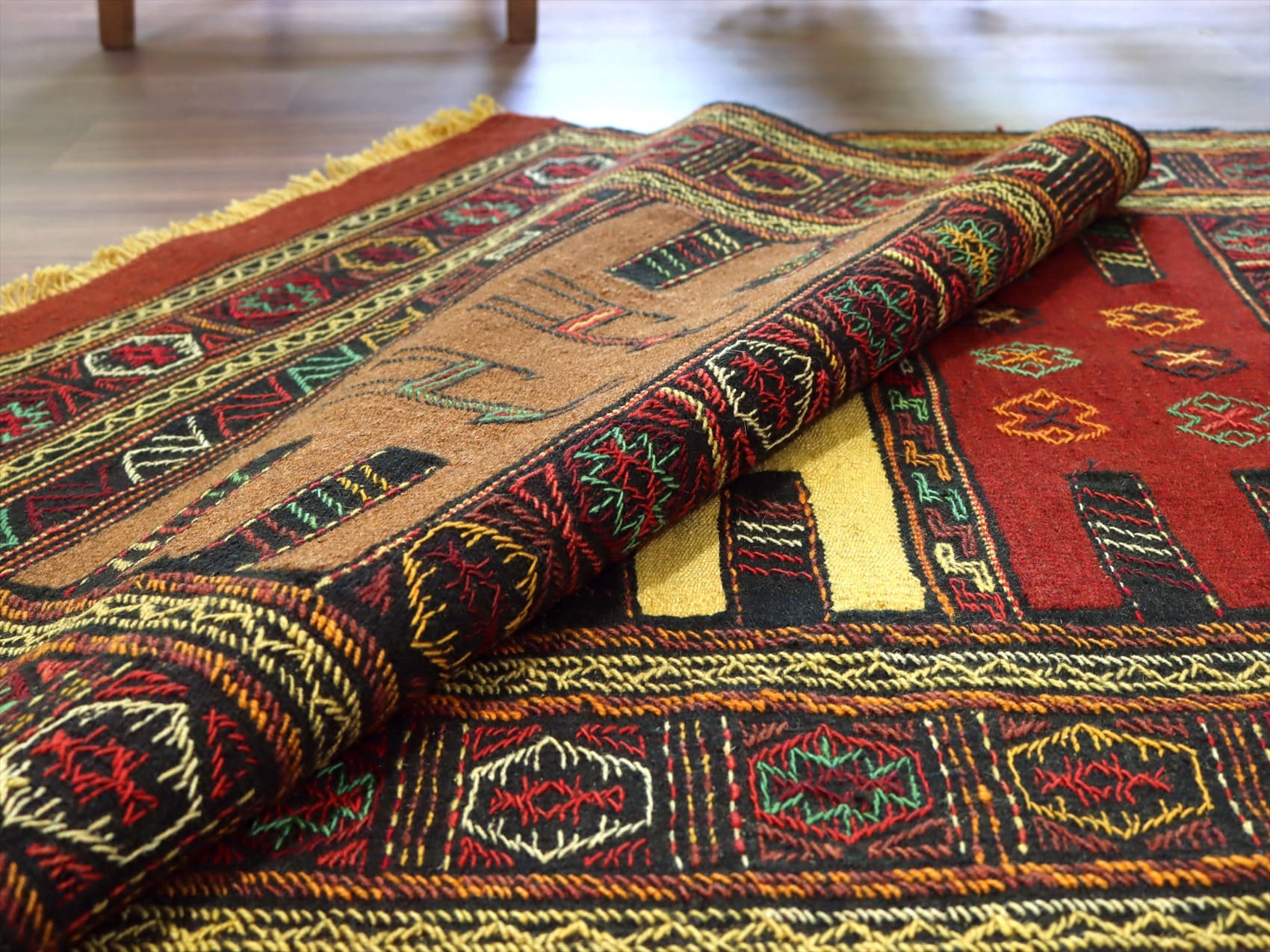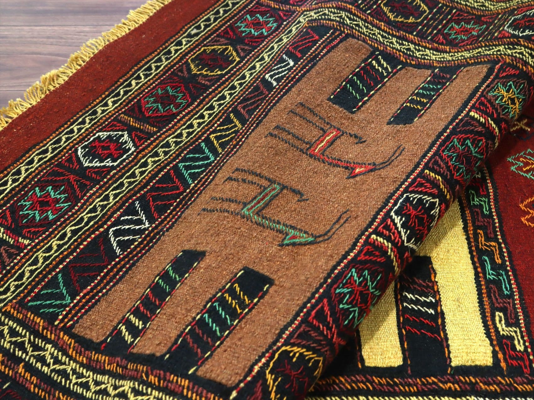 | イラン東北部、アフガニスタンに近い山間部のエリアに暮らすグチャン族の織ったキリム。素朴で力強いイメージで、シンプルな織りのキリムをベースに、動物や幾何学的にアレンジした様々なモチーフが立体的なジジム織りで、織り込まれています。 |