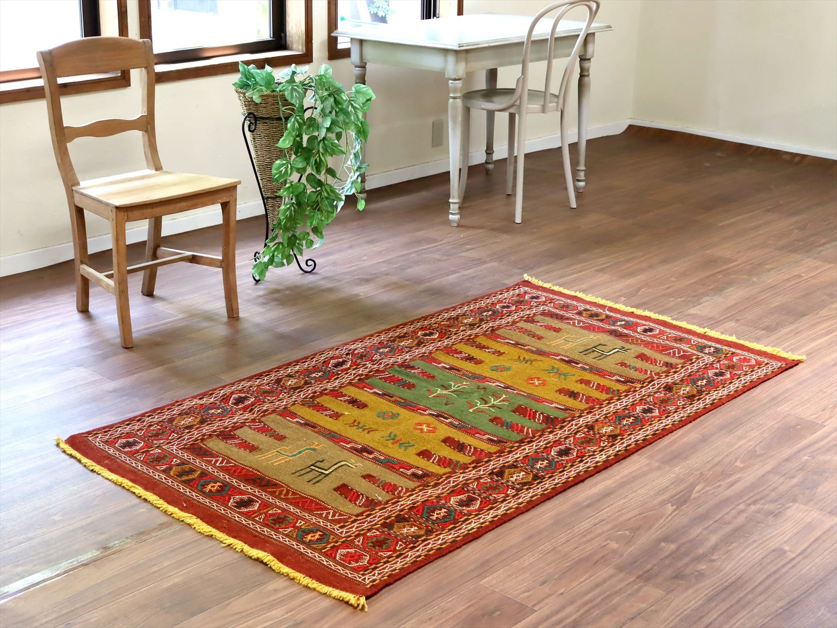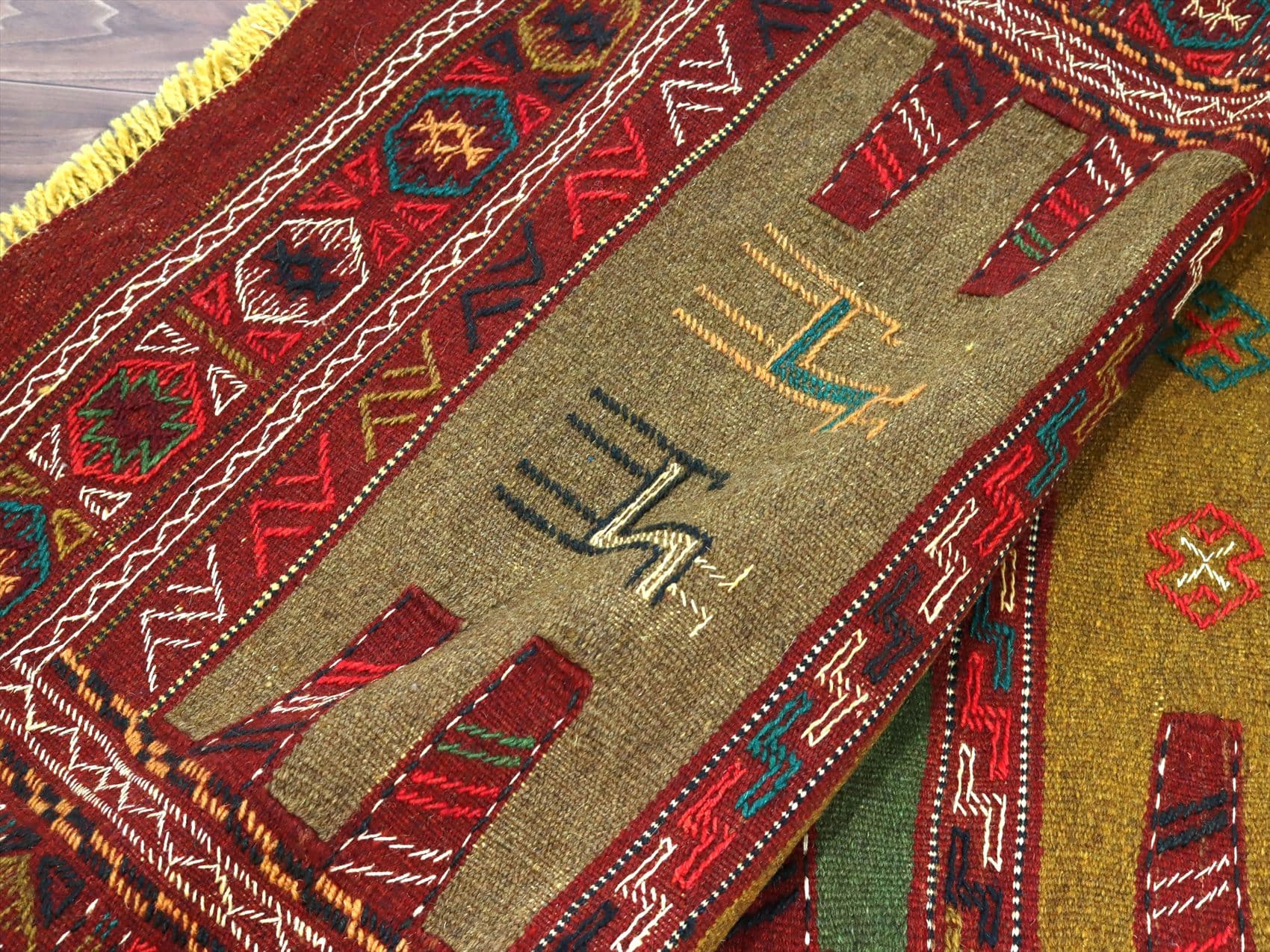| イラン東北部、アフガニスタンに近い山間部のエリアに暮らすグチャン族の織ったキリム。素朴で力強いイメージで、シンプルな織りのキリムをベースに、動物や幾何学的にアレンジした様々なモチーフが立体的なジジム織りで、織り込まれています。 |