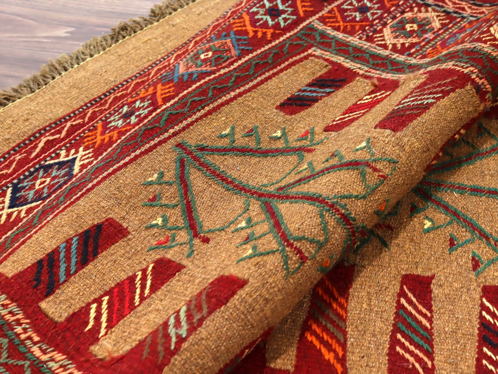 | イラン東北部、アフガニスタンに近い山間部のエリアに暮らすグチャン族の織ったキリム。素朴で力強いイメージで、シンプルな織りのキリムをベースに、動物や幾何学的にアレンジした様々なモチーフが立体的なジジム織りで、織り込まれています。 |