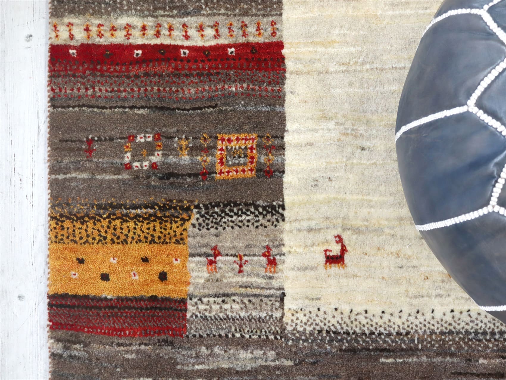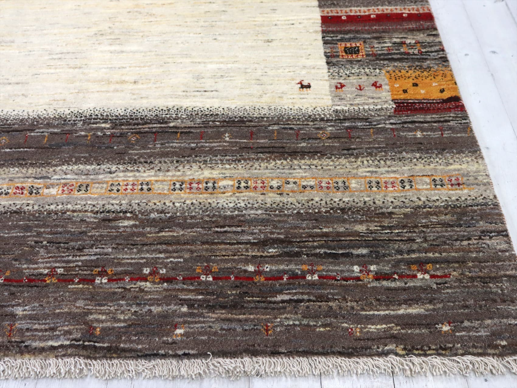 | ナチュラルアイボリーとブラウンをメインに使って織られたギャッベ。素朴なデザインながらも、細かな織りでシカや生命の樹などのモチーフが繊細に表現されています。 |