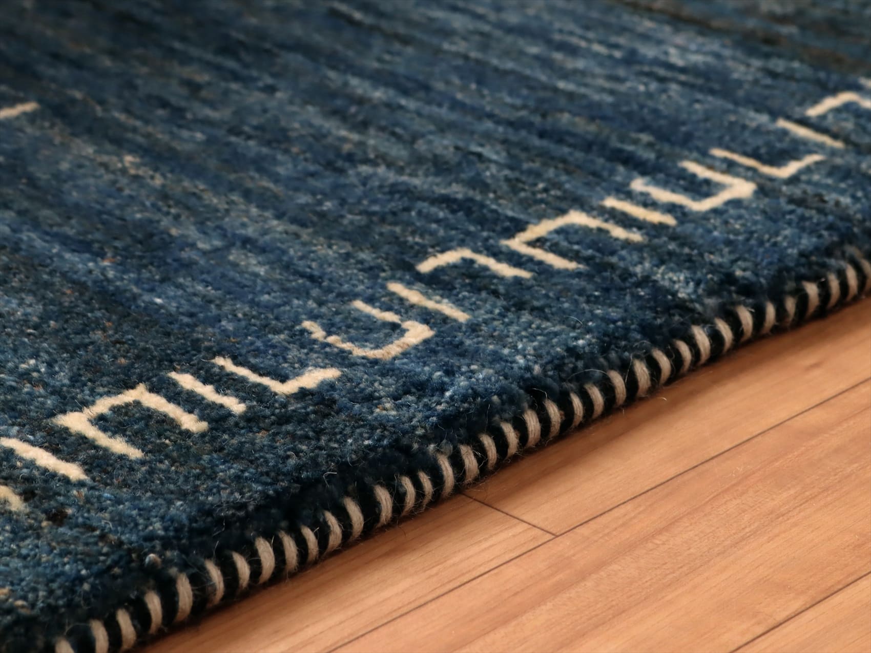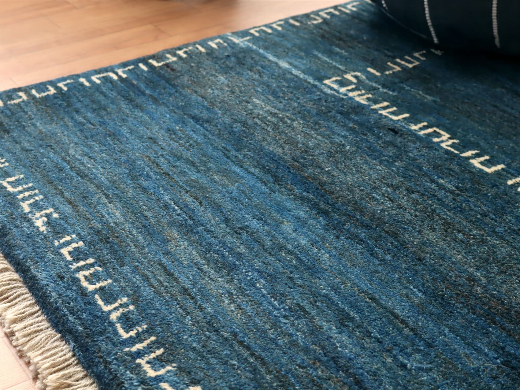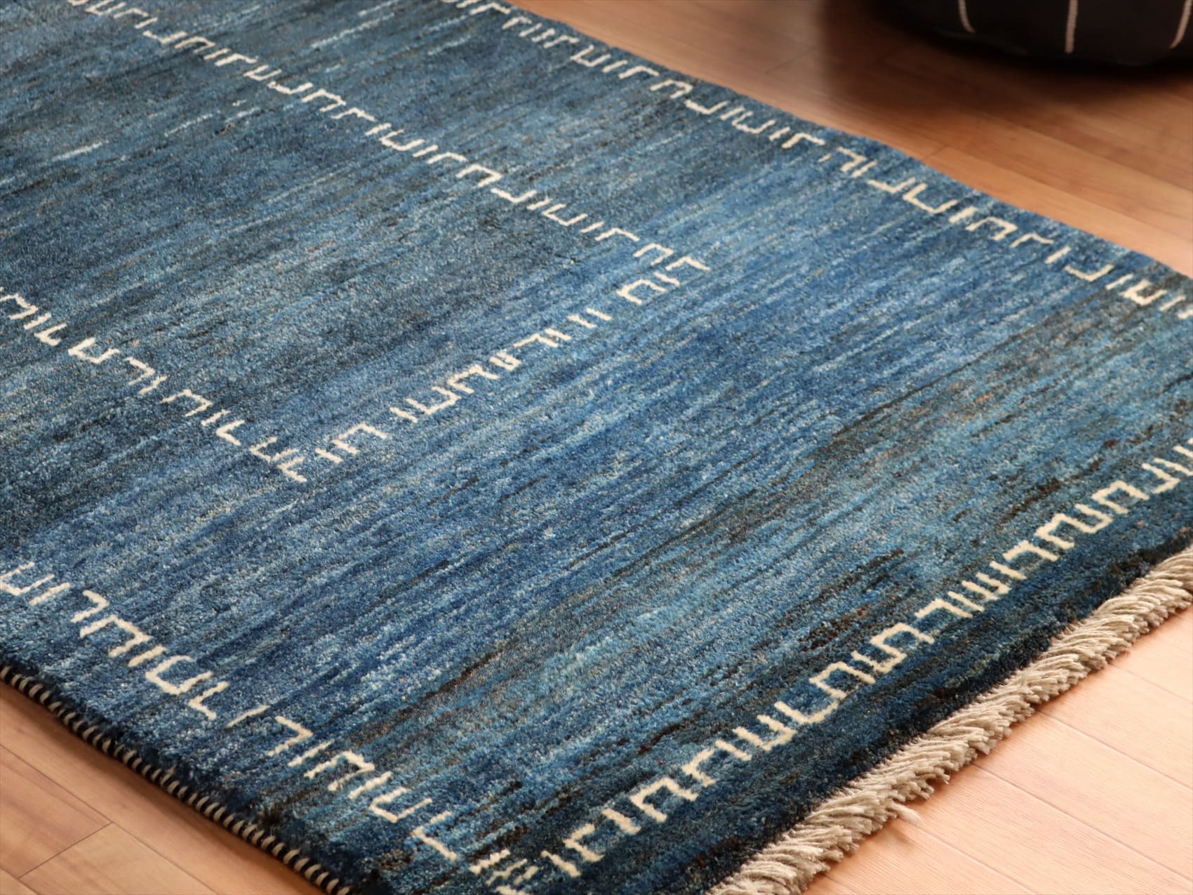 | 濃淡のあるブルーのグラデーションに、幾何学模様で枠がデザインされた素朴な雰囲気のギャッベ。 |