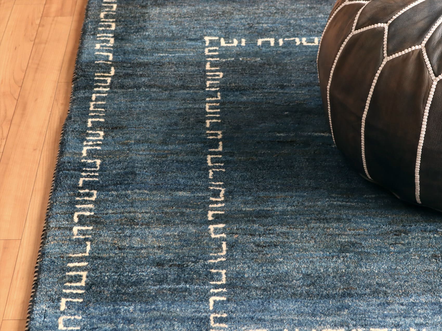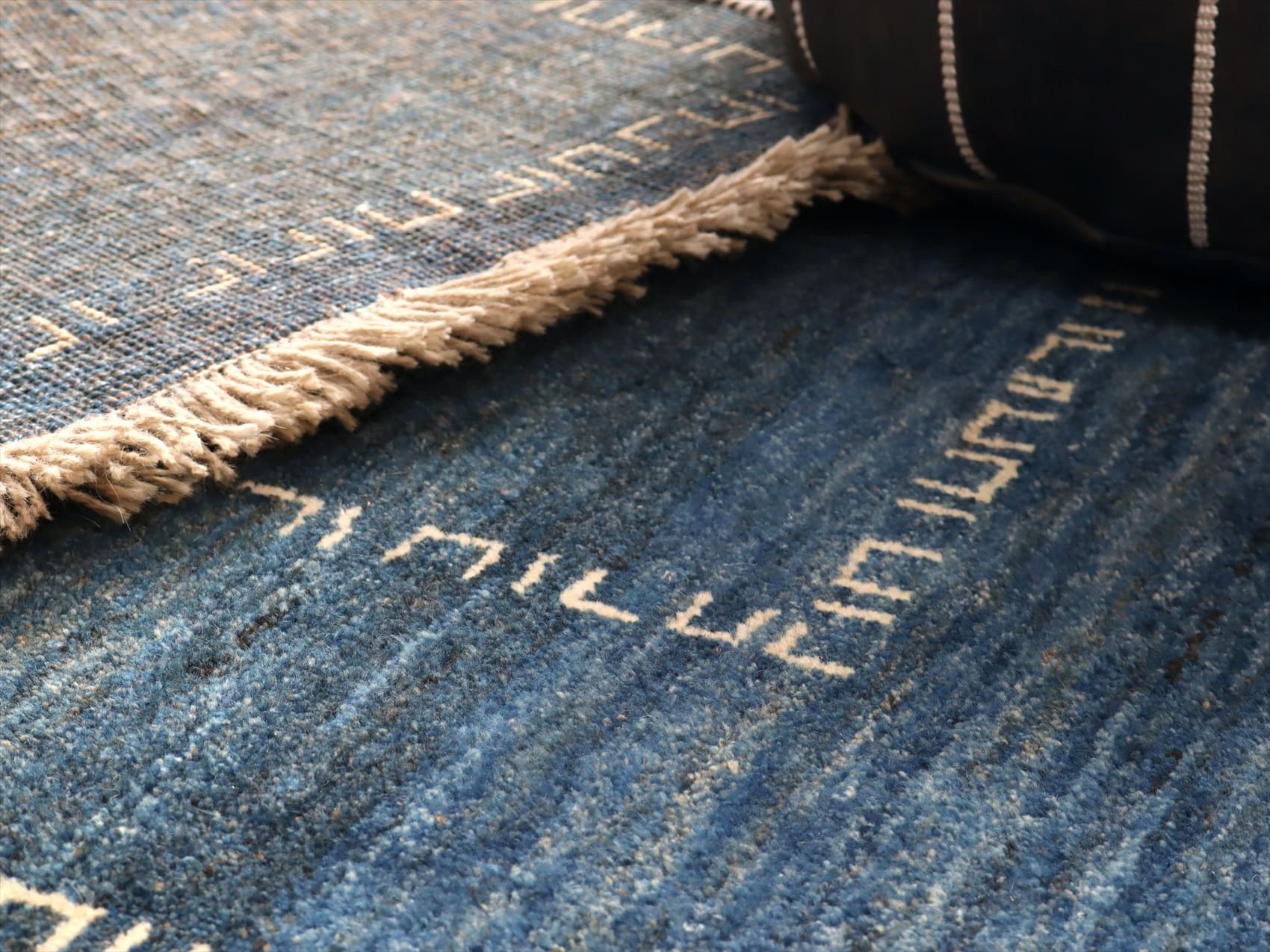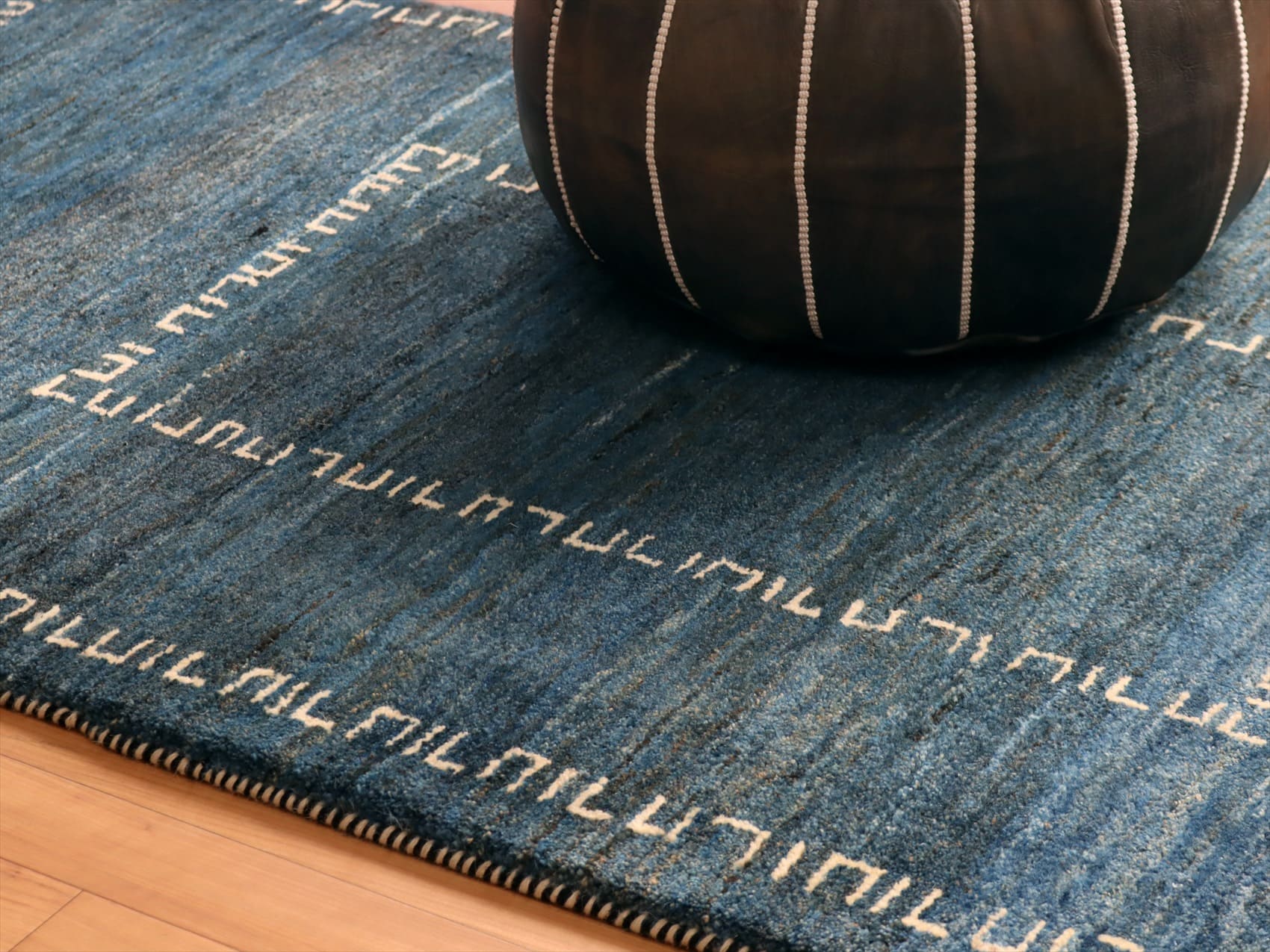 | 濃淡のあるブルーのグラデーションに、幾何学模様で枠がデザインされた素朴な雰囲気のギャッベ。 |