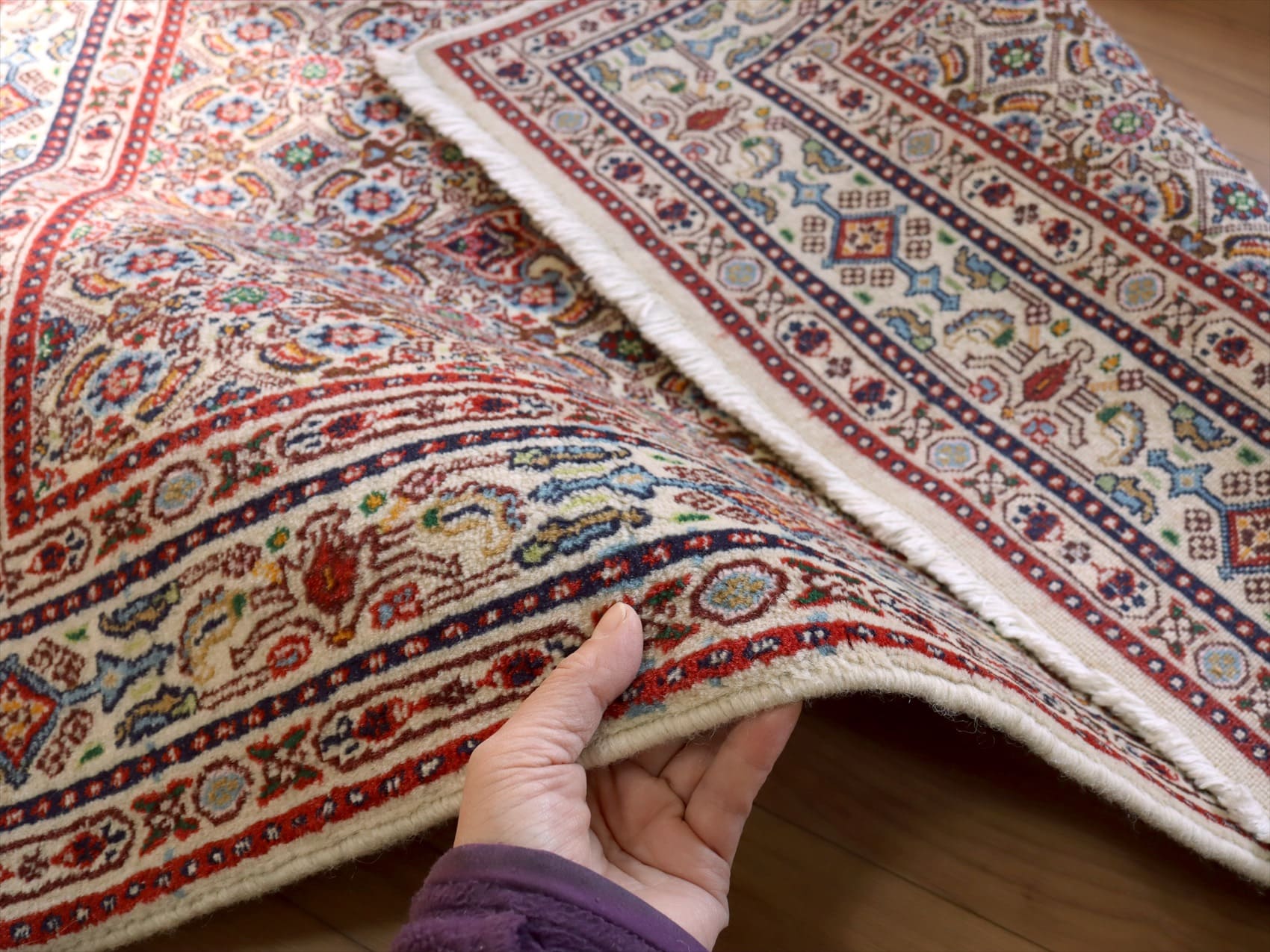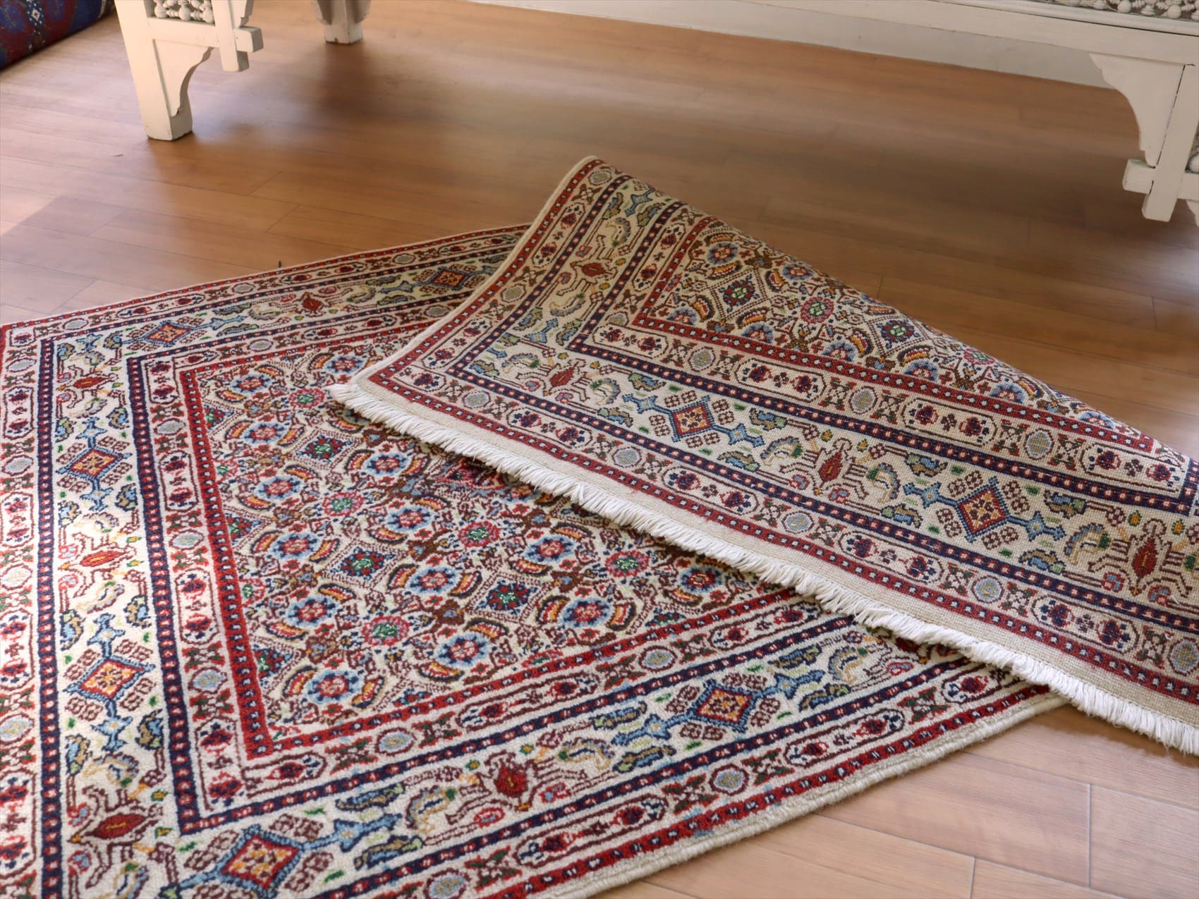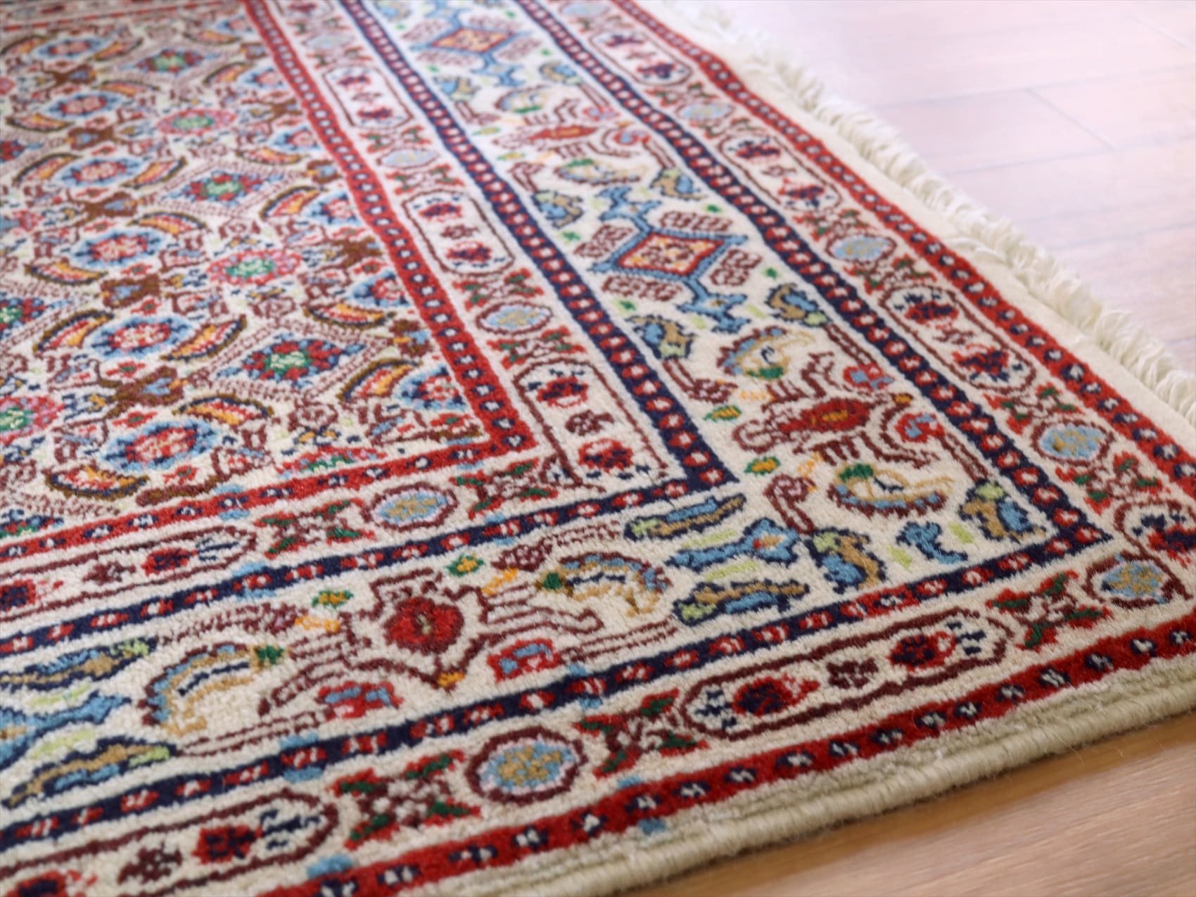 | ややクリーム色がかったアイボリーをベースに、オレンジやグリーンで細かな連続模様が織り込まれたムード産の手織り絨毯。イラン東部からアフガニスタンにも一般に見られるヘラート文様で、小さな花びらの形はマヒ(魚)と表現されることもあります。 |