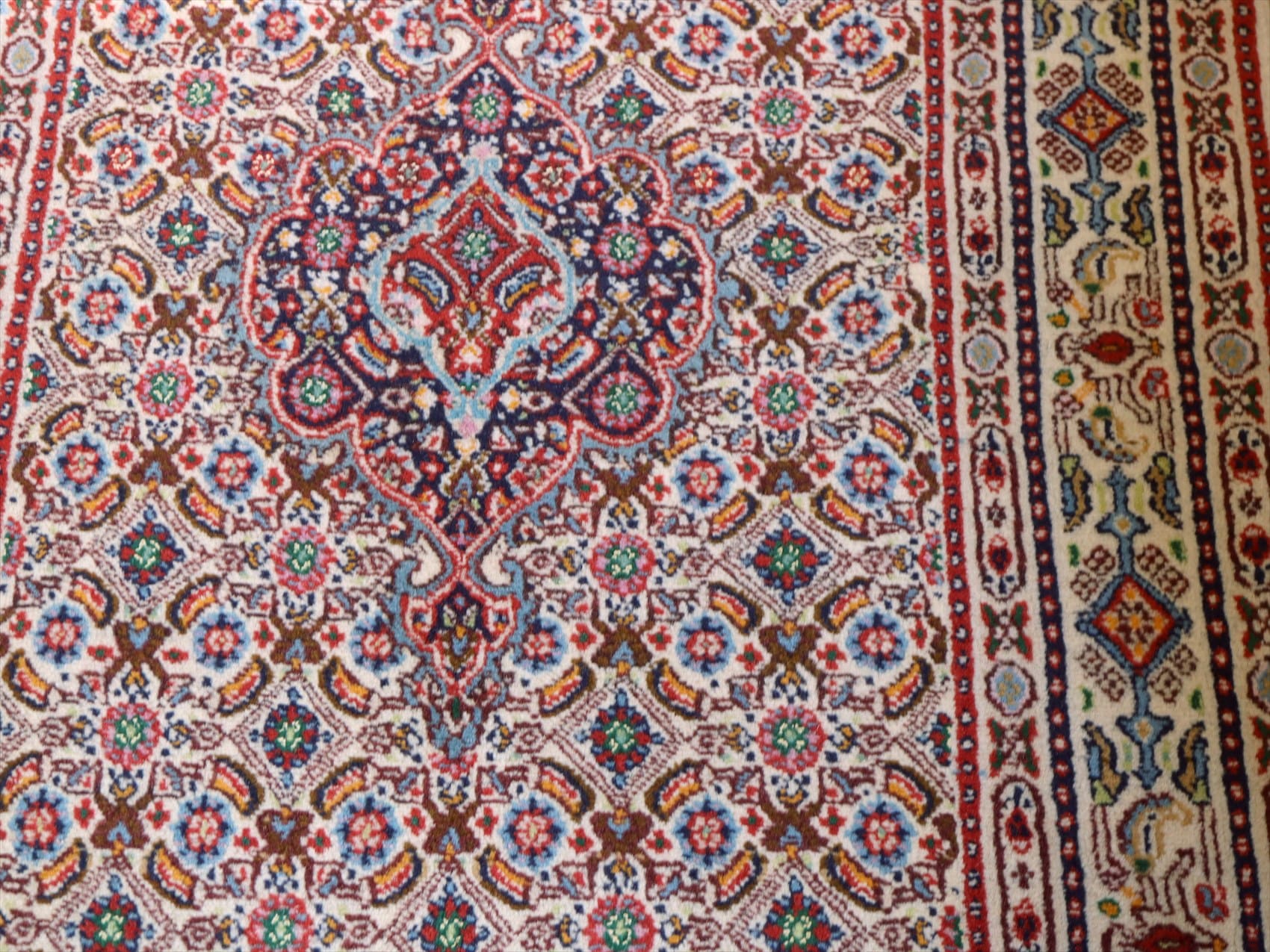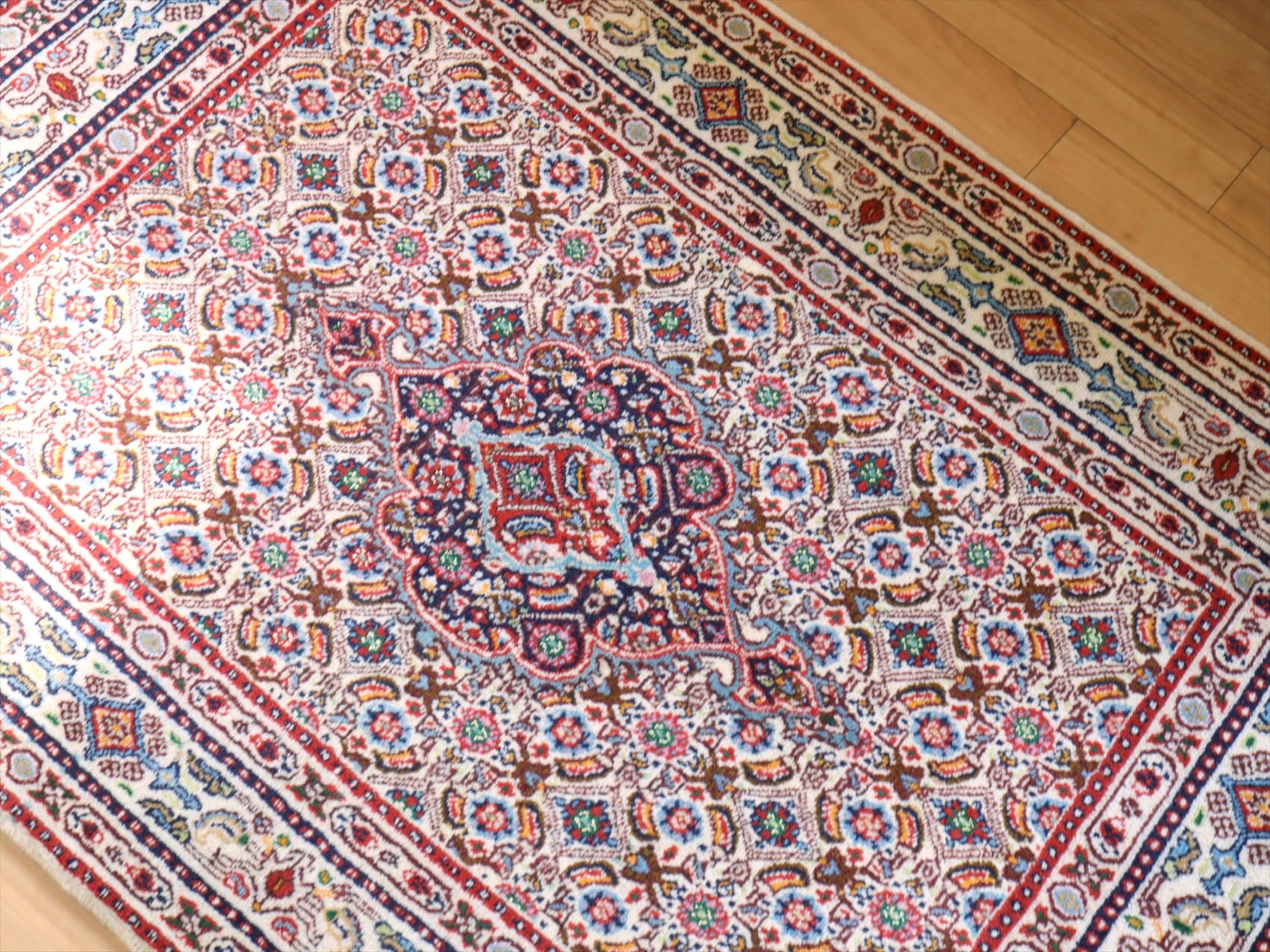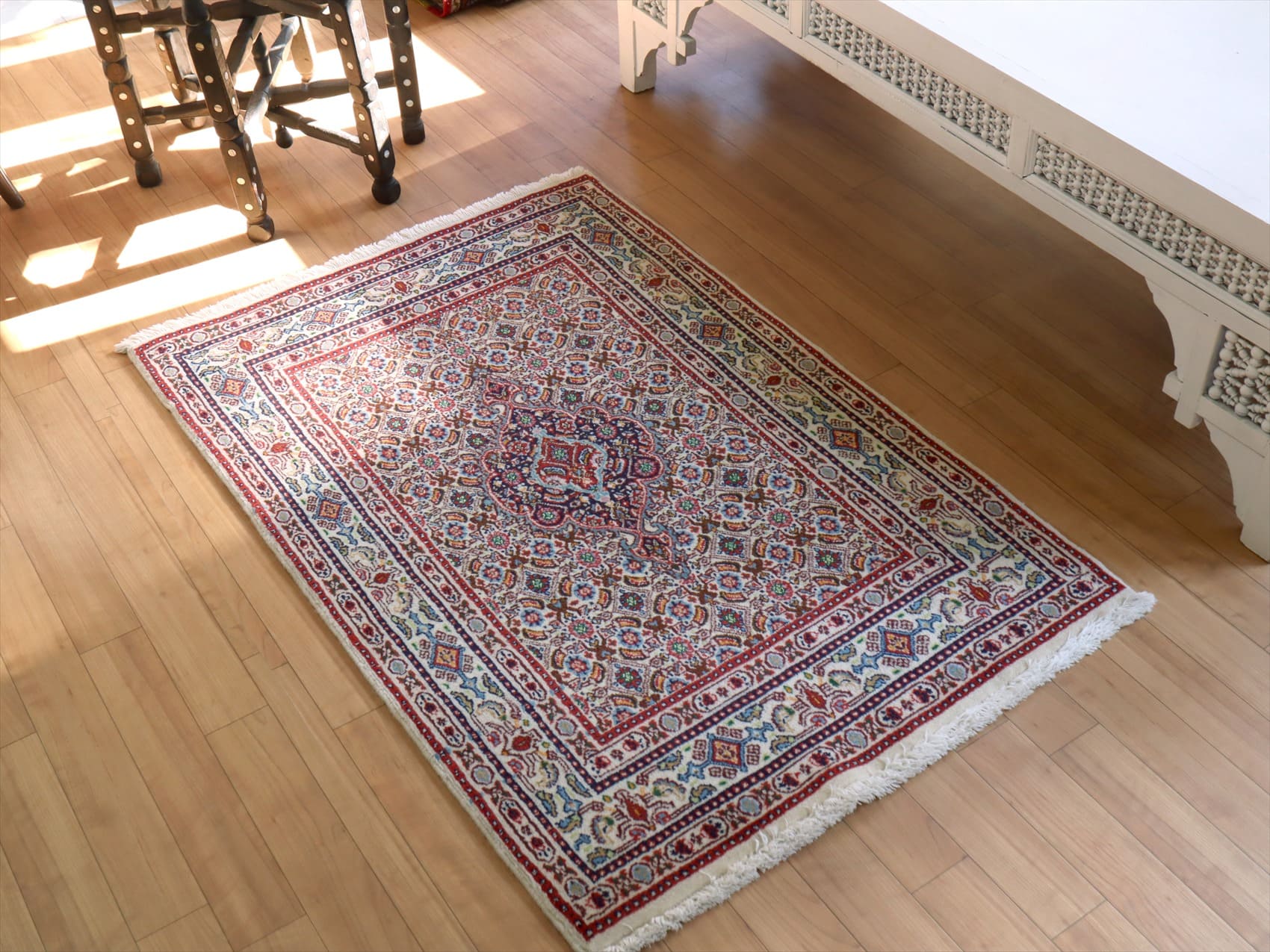 | ややクリーム色がかったアイボリーをベースに、オレンジやグリーンで細かな連続模様が織り込まれたムード産の手織り絨毯。イラン東部からアフガニスタンにも一般に見られるヘラート文様で、小さな花びらの形はマヒ(魚)と表現されることもあります。 |