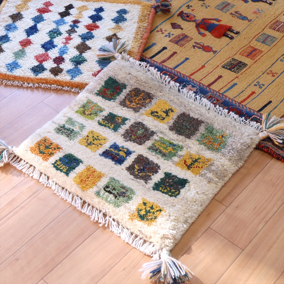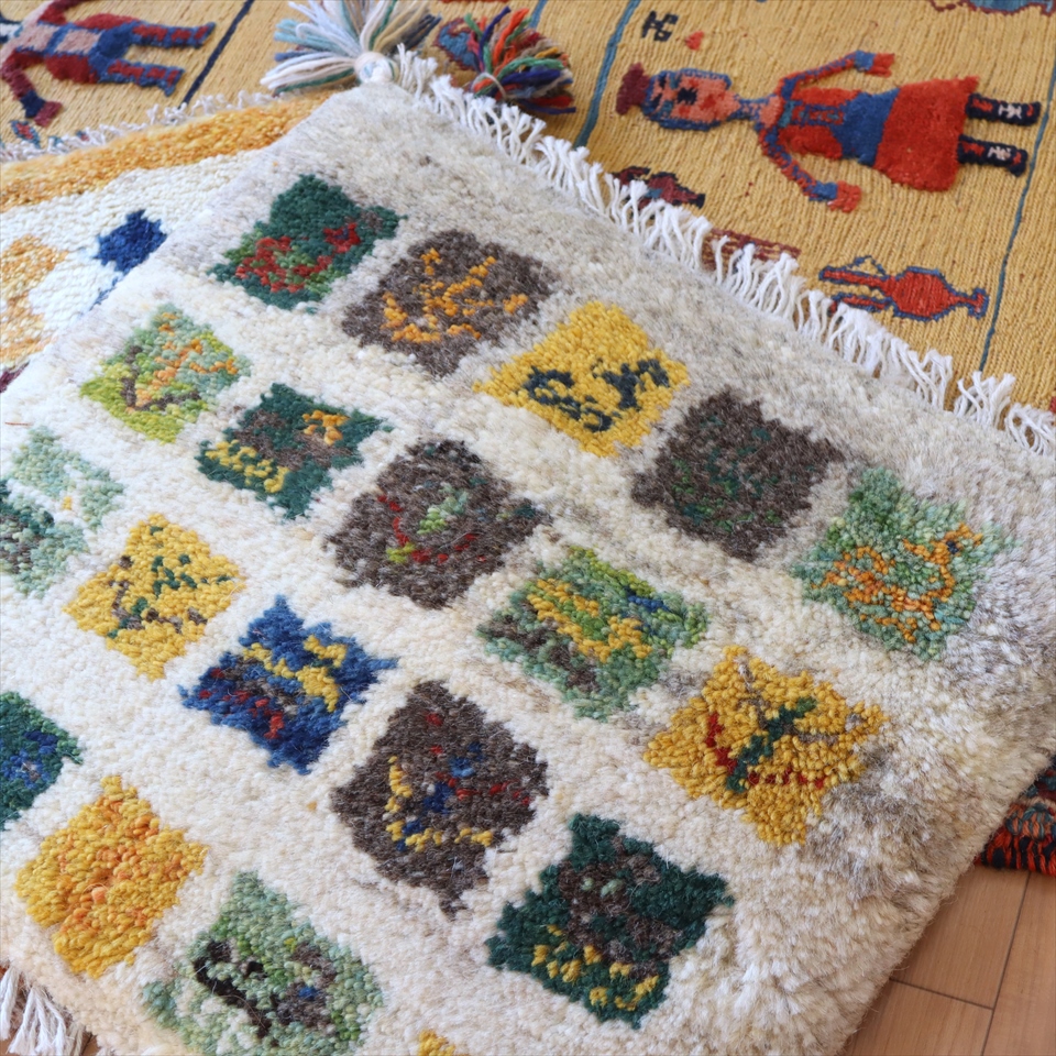 - ギャッベ イラン産 ミニ 座布団サイズ35×39cm カラフルなタイル