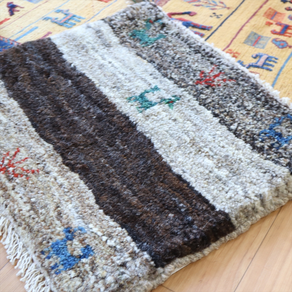 | 手織りならではの素朴な雰囲気があるギャッベ。形が少しゆがんでいたり、途中でモチーフが途切れていたりなどありますが、それもまた味わいです。世界で一枚だけのユニークなギャッベをお楽しみください。 |