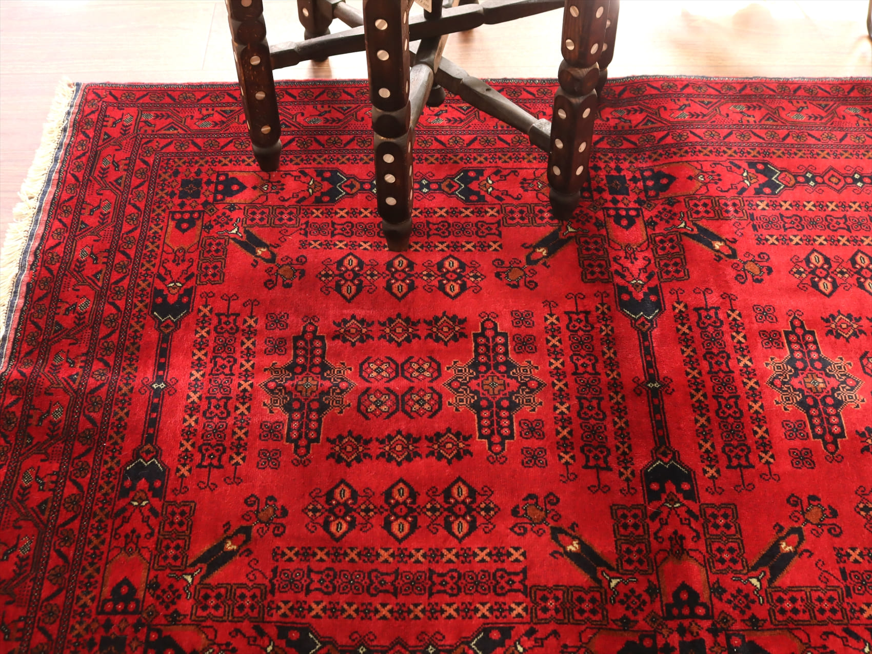 | 光沢のあるビロードのような、滑らかでツヤのある細かな織りのアフガン絨毯。トルコの絨毯屋さんでは通称“ビリジック”と呼ばれ、現地でもツーリストにとても人気のある高級絨毯です。色はとても深い赤で、バーガンディと表現されます。黒っぽく見えている色は濃紺で、深い赤とのコンビネーションは抜群によく、とても上品です。 パイル(毛足)の向きがありますので、絨毯を片方から見ると明るい色に、反対から見ると濃い色に見えます。 |