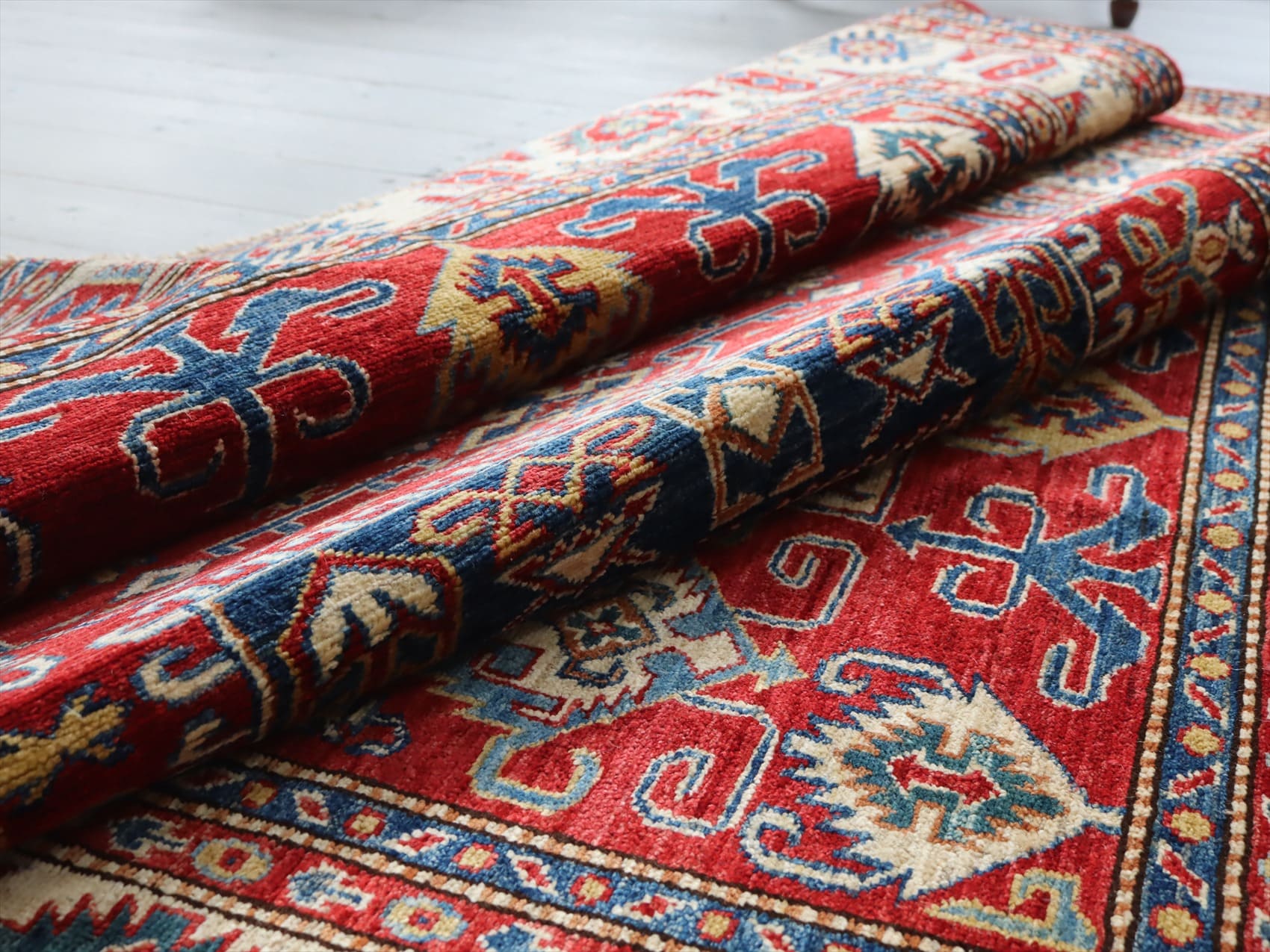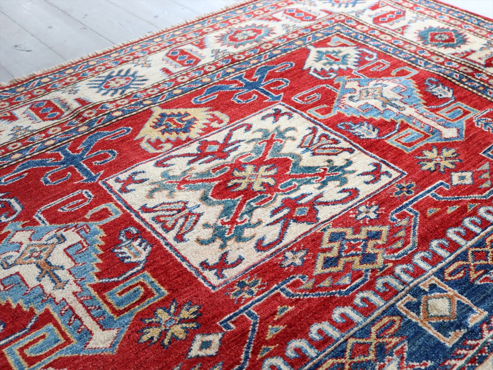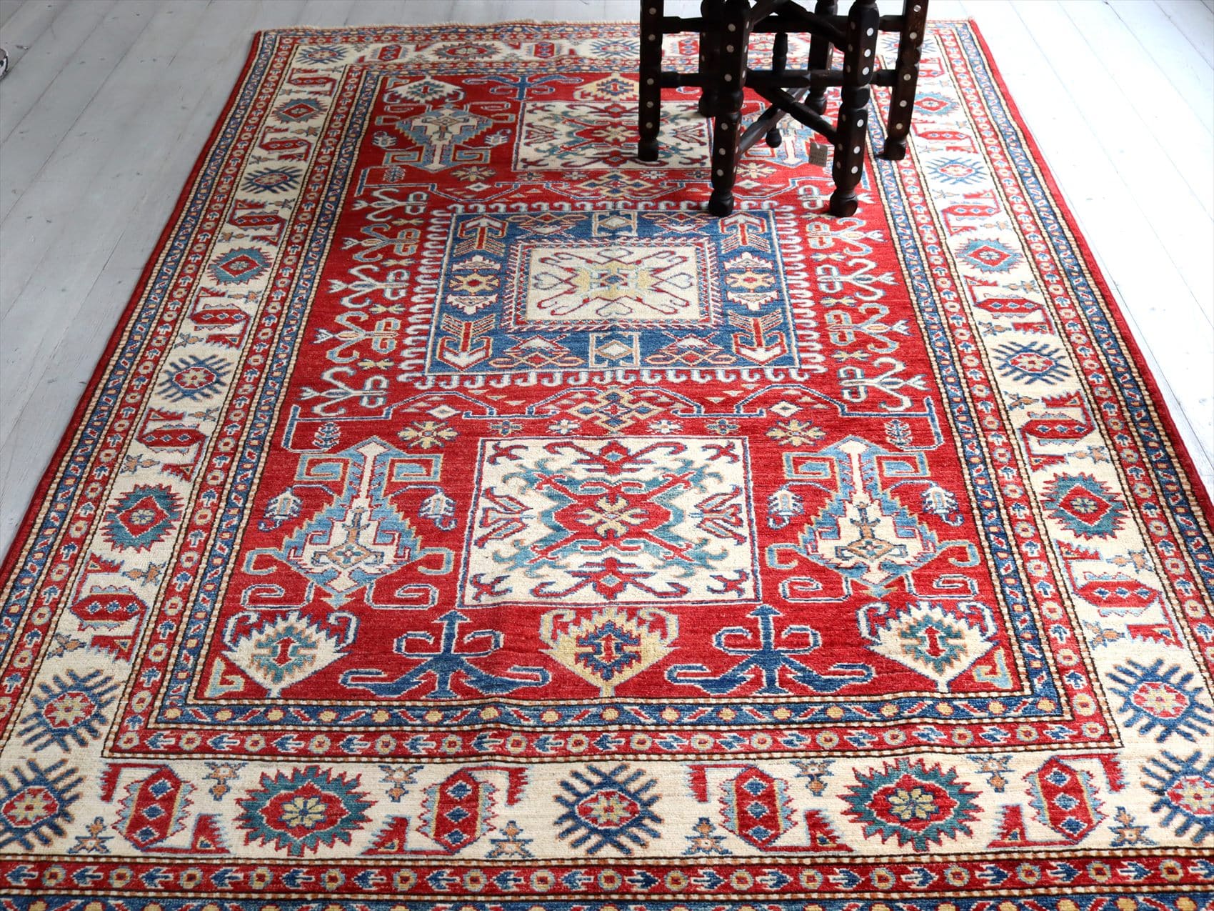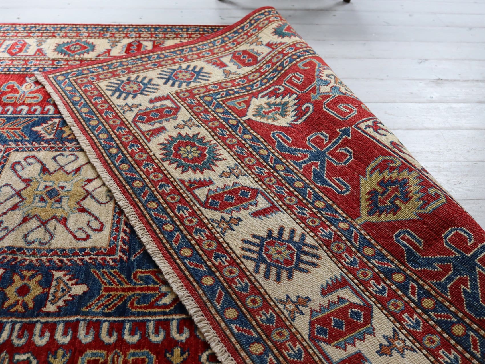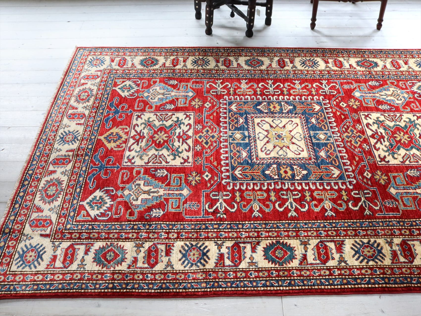 | じゅうたんコレクターの間で特に人気の高い、コーカサス地方のアンティークカーペットのデザインを再現した、リプロダクションです。トルコに近い言語を話すアゼルバイジャン地方のじゅうたんは、デザインも比較的トルコに近く、細かな幾何学模様を組み合わせたものが多く見られます。 天然の染料を使って、少し使い込んだような色ムラのあるアンティーク風に織られています。 |