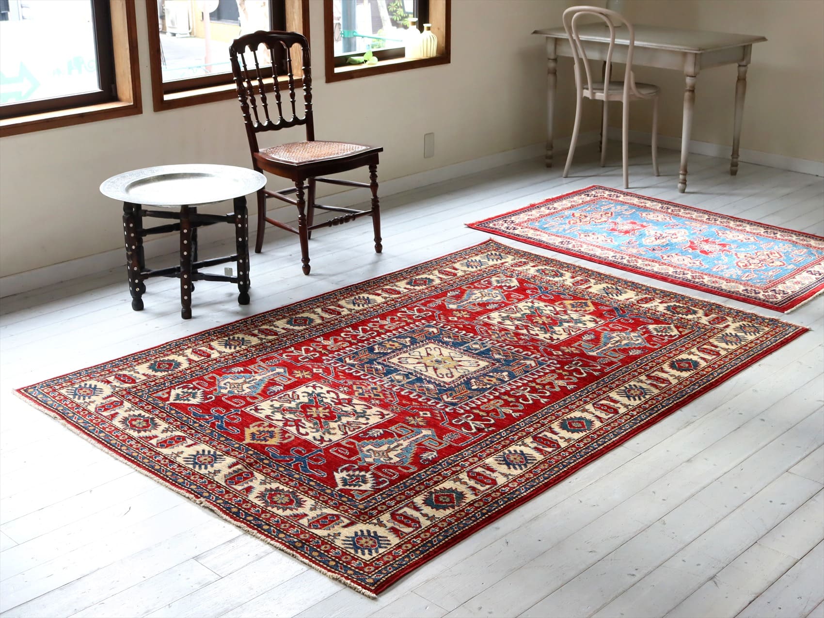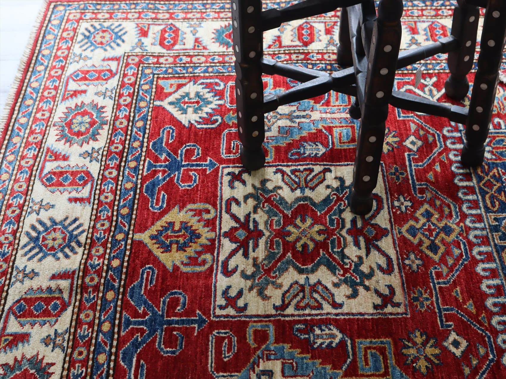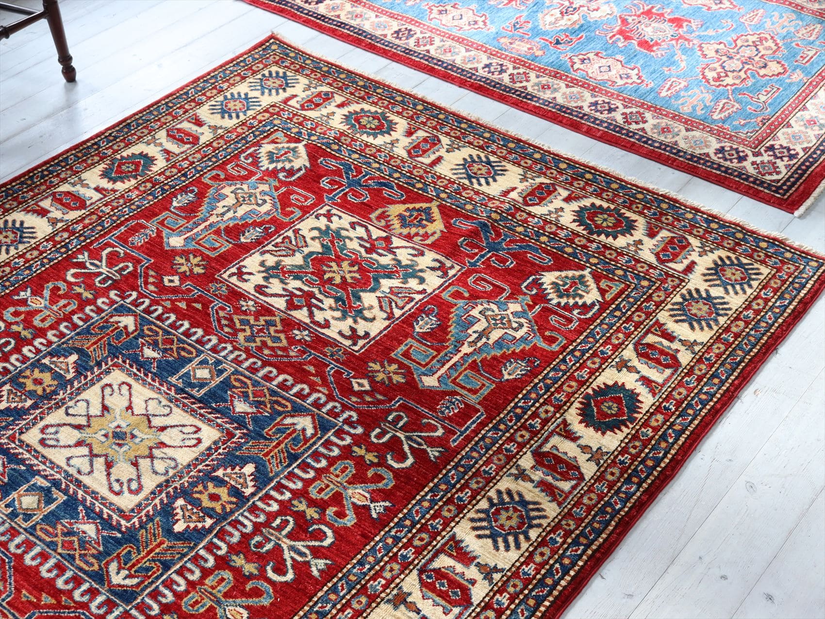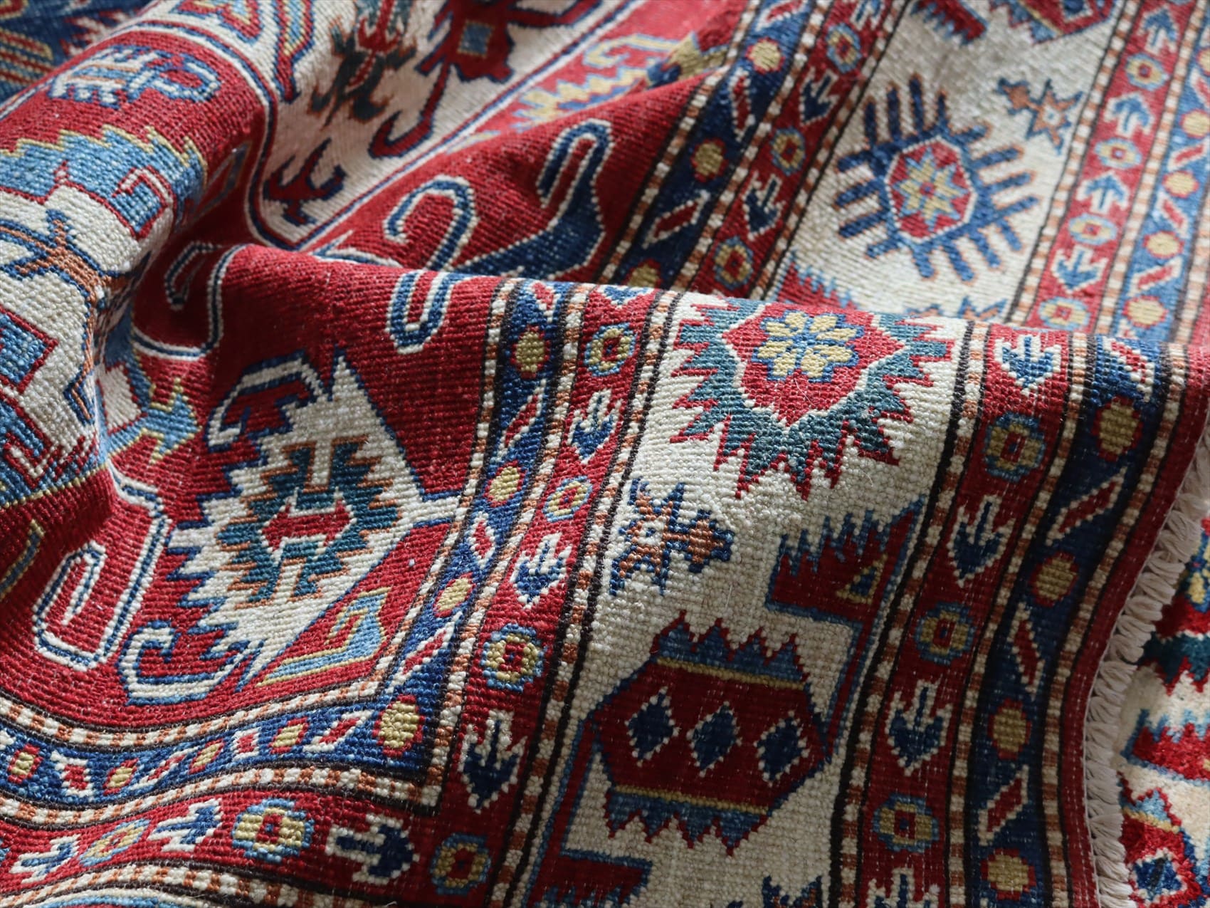 | じゅうたんコレクターの間で特に人気の高い、コーカサス地方のアンティークカーペットのデザインを再現した、リプロダクションです。トルコに近い言語を話すアゼルバイジャン地方のじゅうたんは、デザインも比較的トルコに近く、細かな幾何学模様を組み合わせたものが多く見られます。 天然の染料を使って、少し使い込んだような色ムラのあるアンティーク風に織られています。 |
