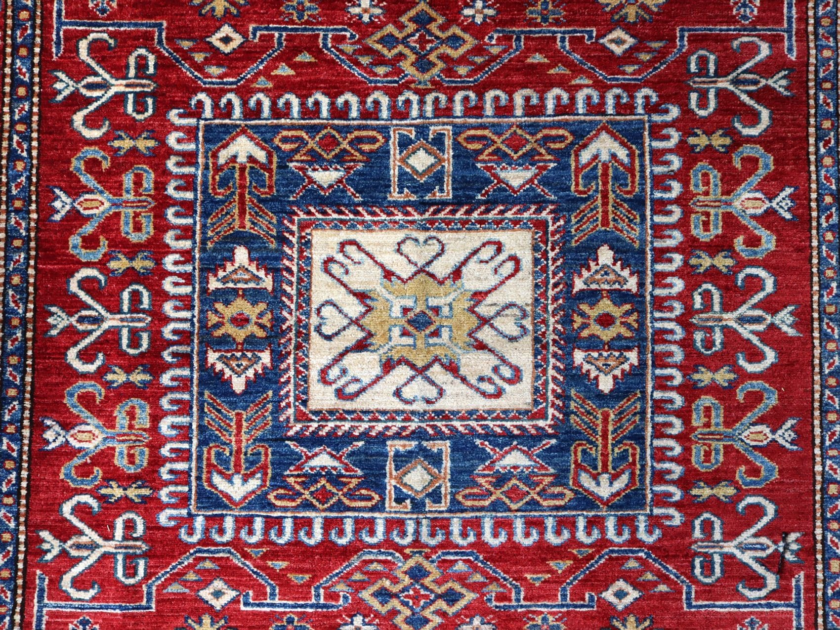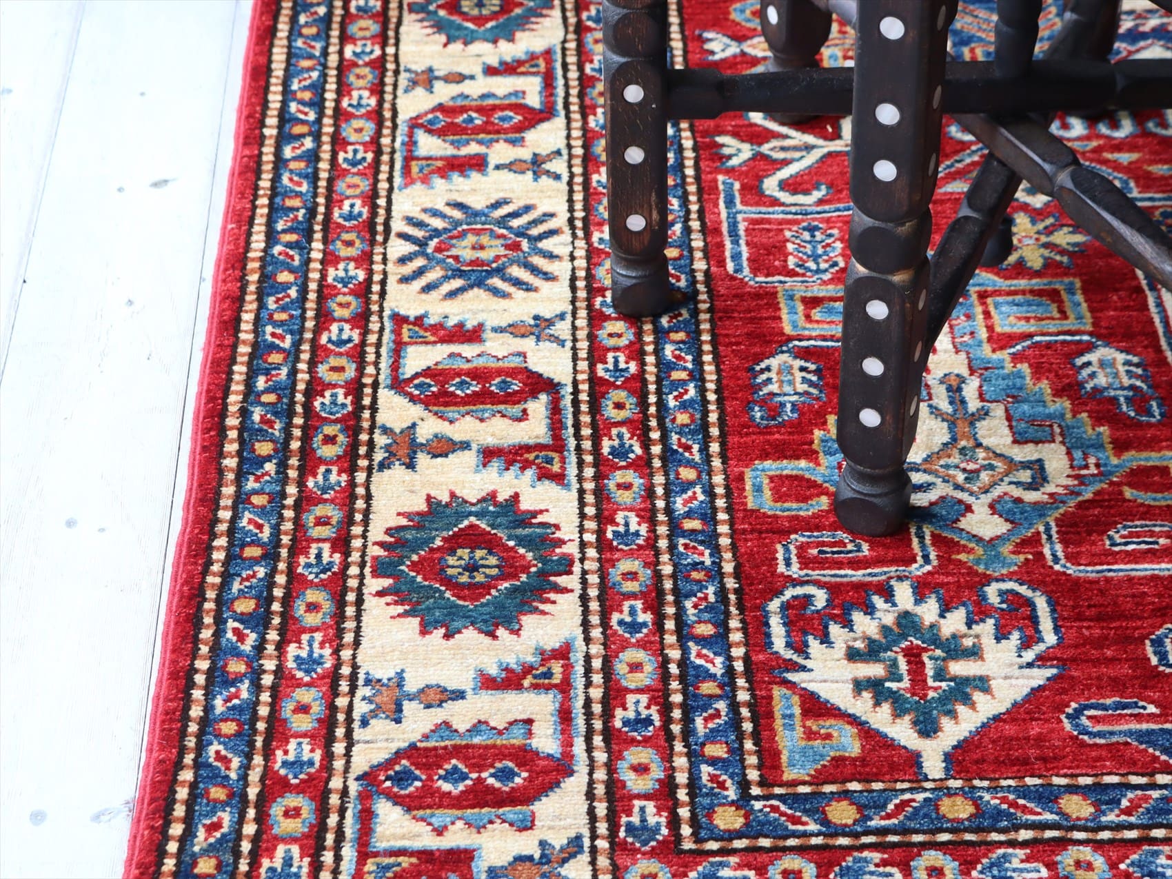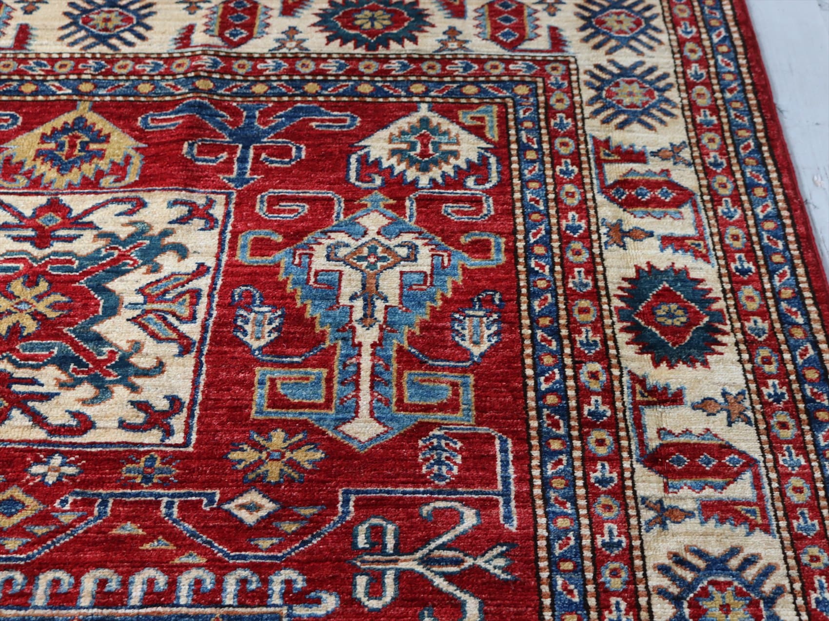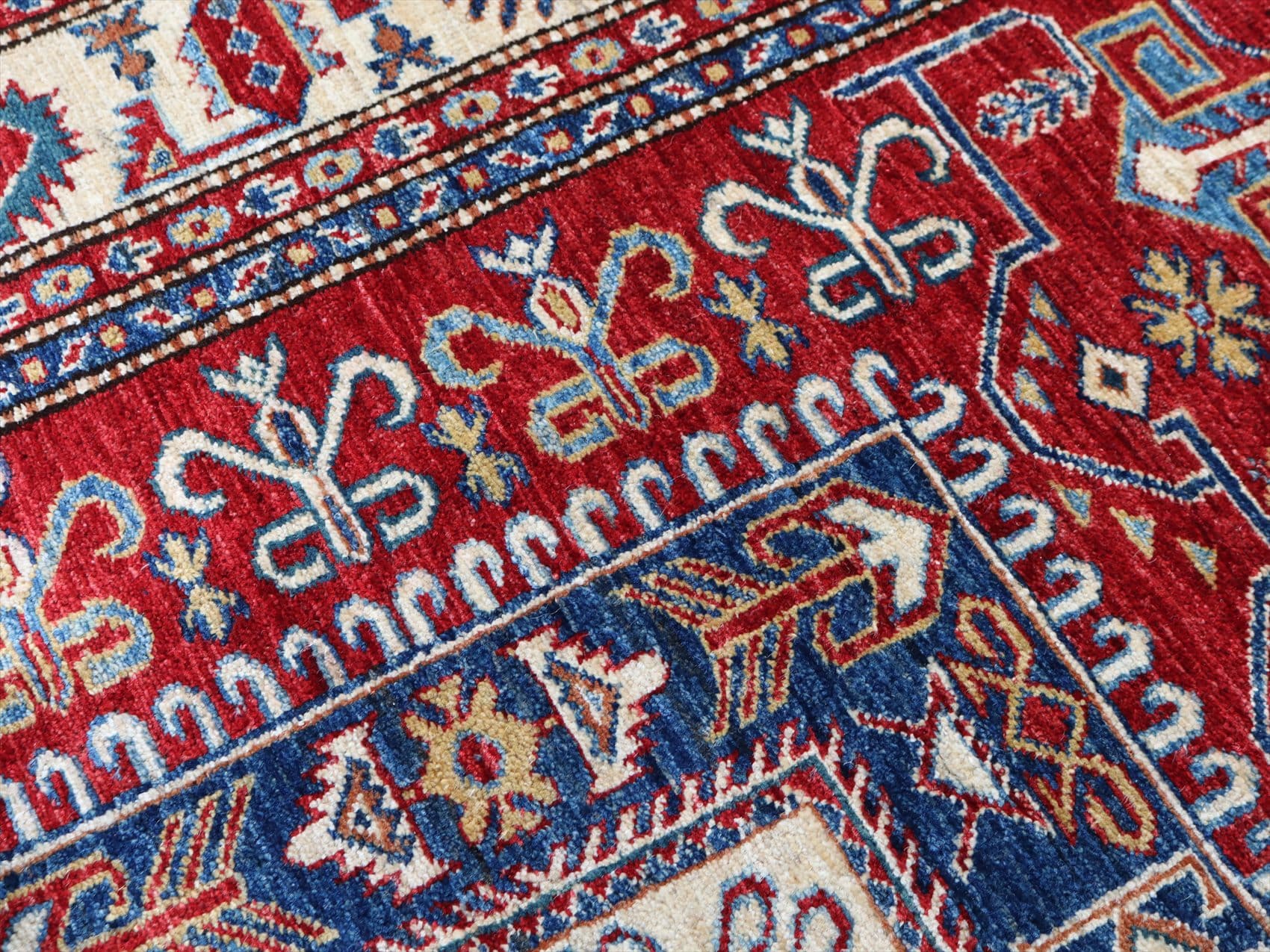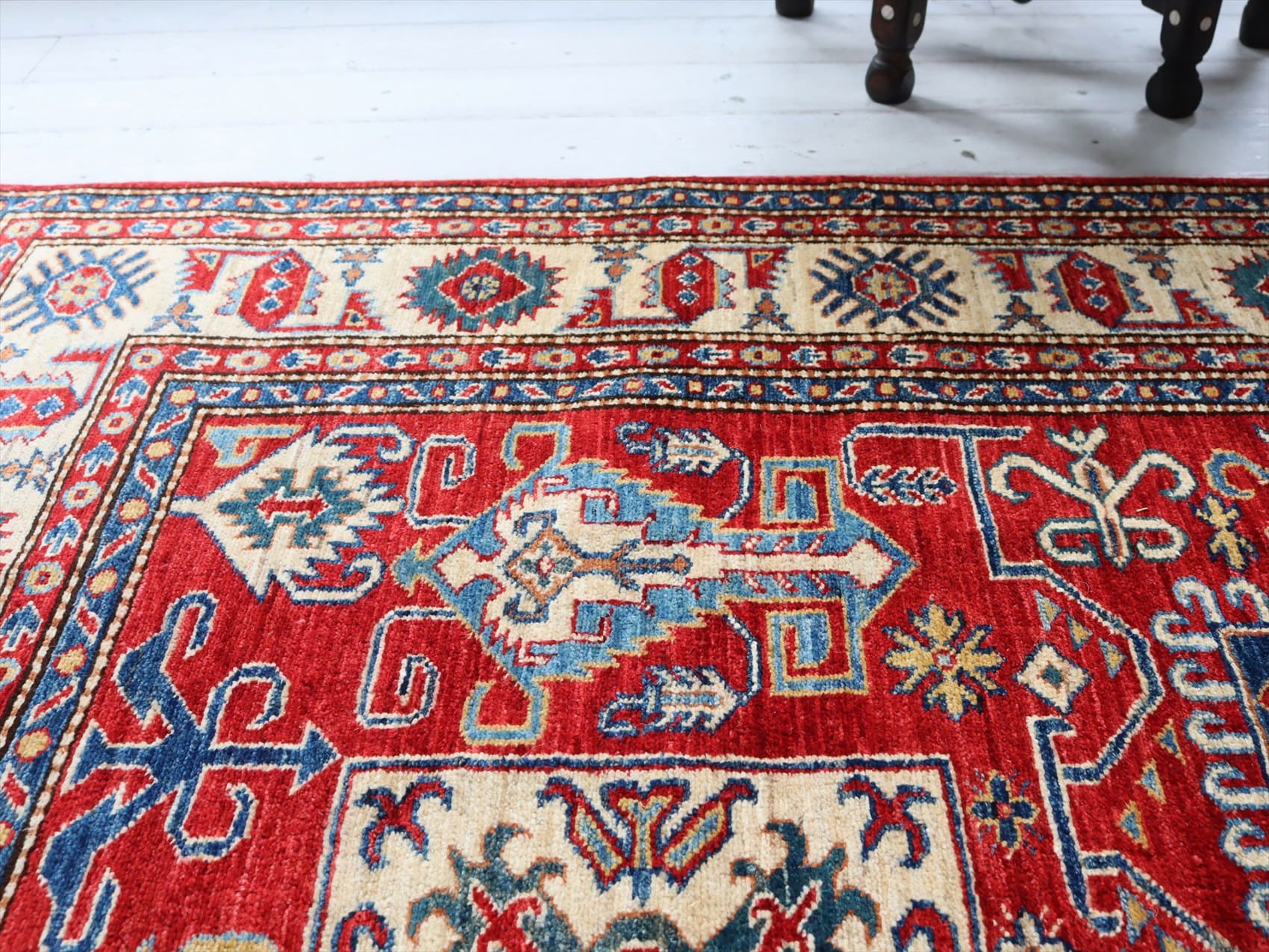 | じゅうたんコレクターの間で特に人気の高い、コーカサス地方のアンティークカーペットのデザインを再現した、リプロダクションです。トルコに近い言語を話すアゼルバイジャン地方のじゅうたんは、デザインも比較的トルコに近く、細かな幾何学模様を組み合わせたものが多く見られます。 天然の染料を使って、少し使い込んだような色ムラのあるアンティーク風に織られています。 |