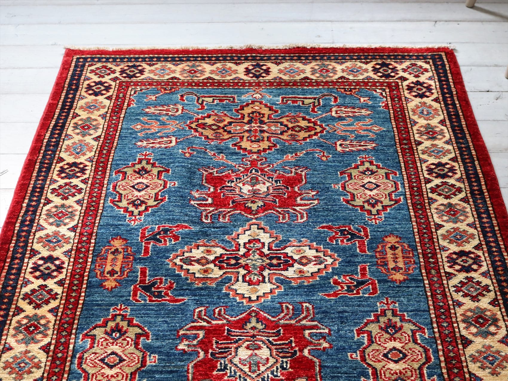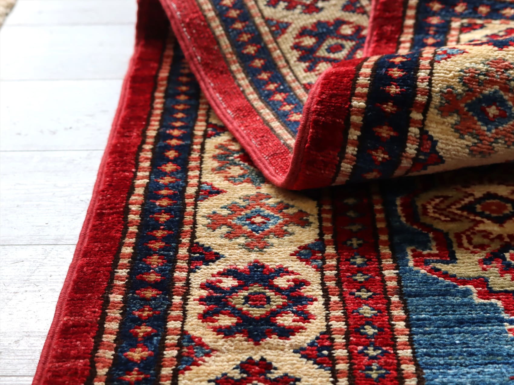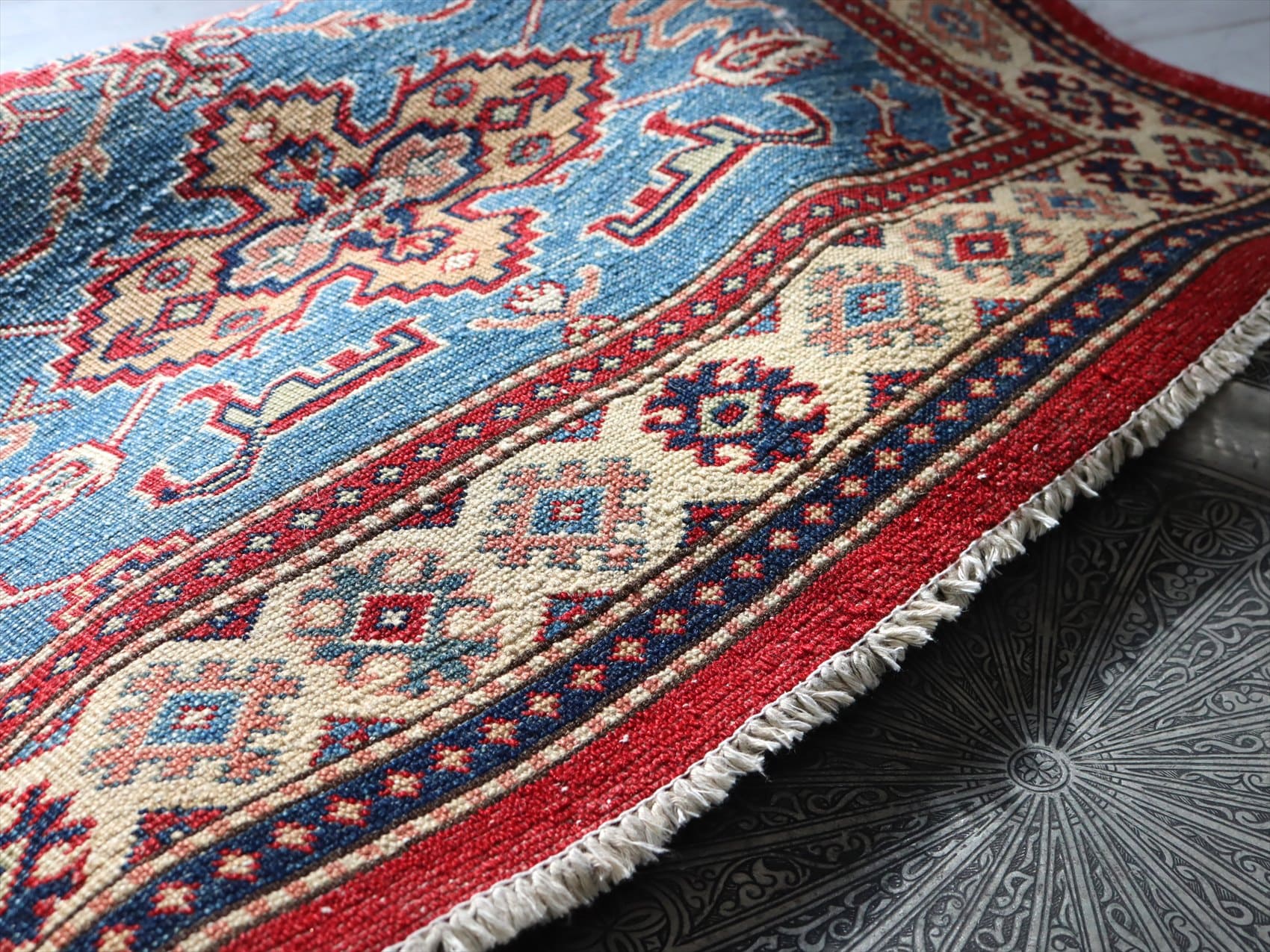 | じゅうたんコレクターの間で特に人気の高い、コーカサス地方のアンティークカーペットのデザインを再現した、リプロダクションです。トルコに近い言語を話すアゼルバイジャン地方のじゅうたんは、デザインも比較的トルコに近く、細かな幾何学模様を組み合わせたものが多く見られます。 天然の染料を使って、少し使い込んだような色ムラのあるアンティーク風に織られています。 |