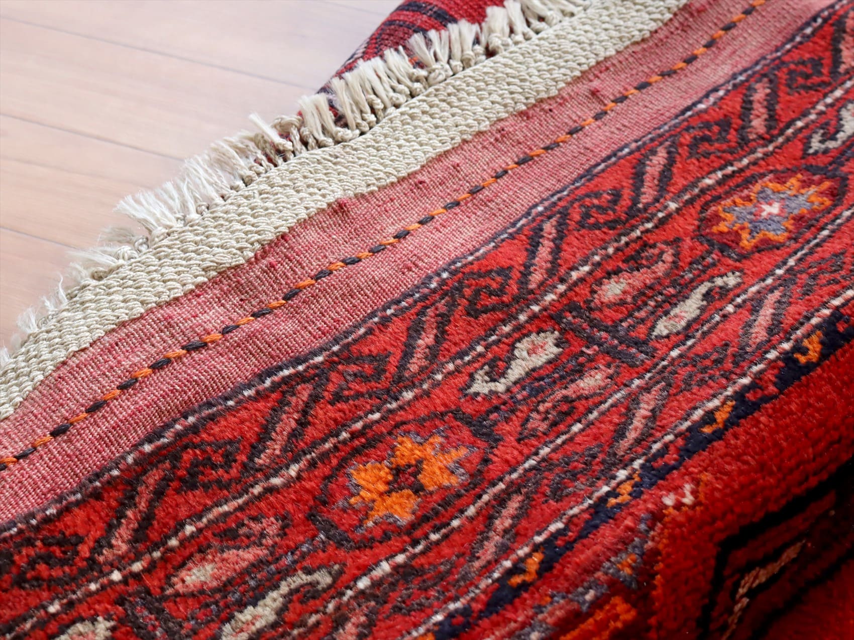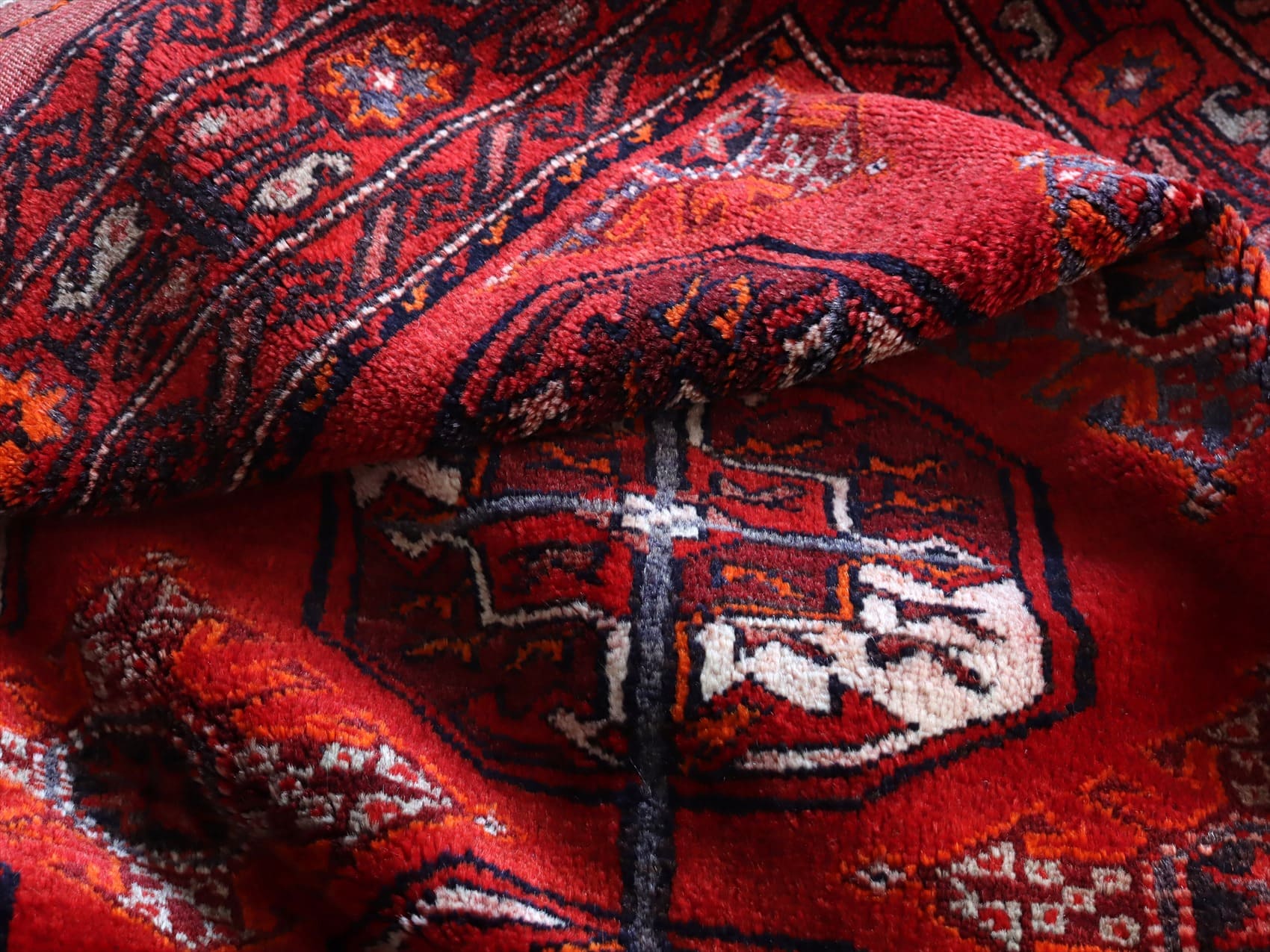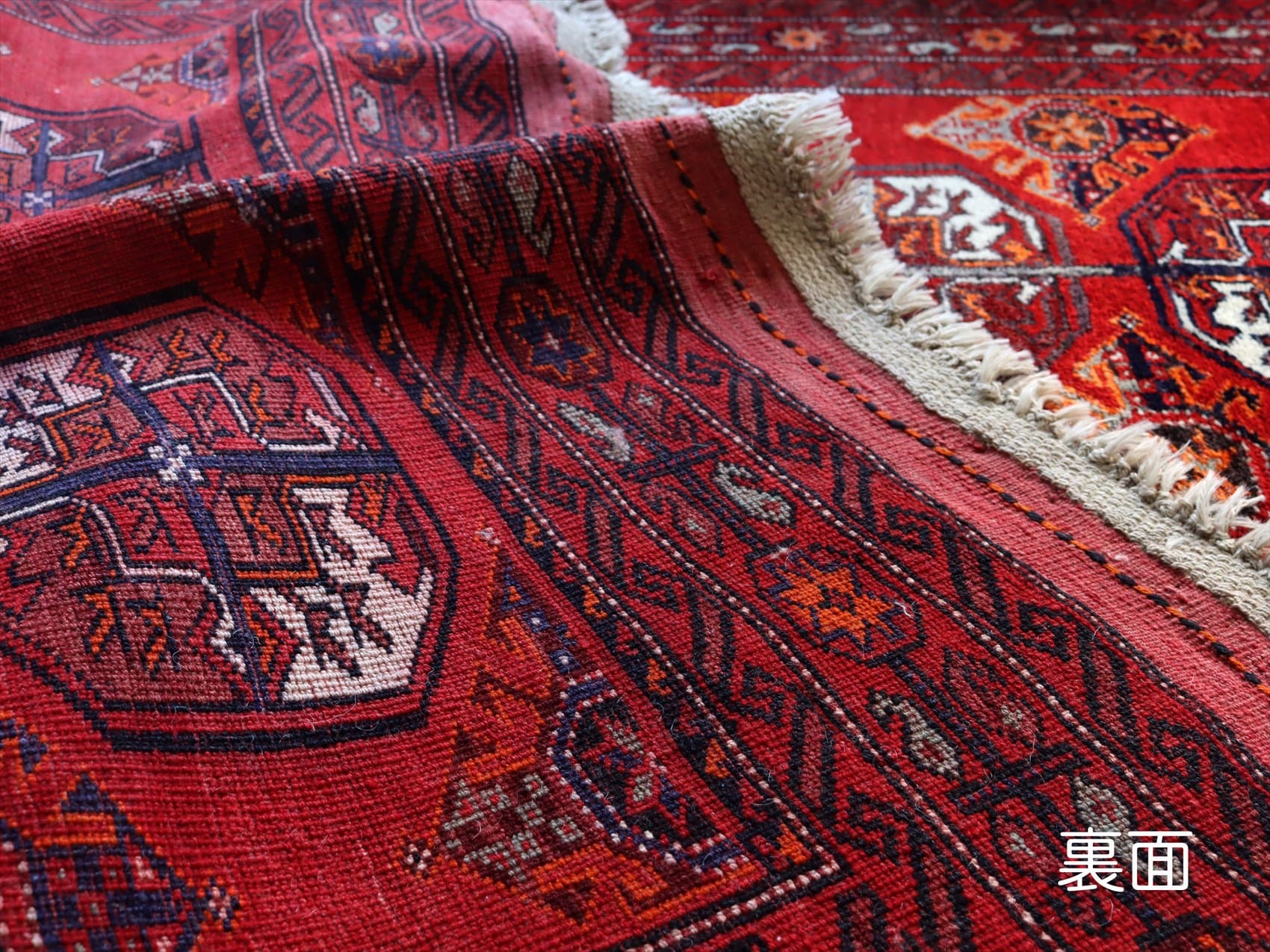 | 朱色がかったレッドのフィールドに、ギュル文様が連続して織られたデザイン。モチーフの細かい部分で使われているネイビーやブルーが色褪せて、パープル、ブルーグレーに変化し、オールドらしいこなれた風合いに。 |