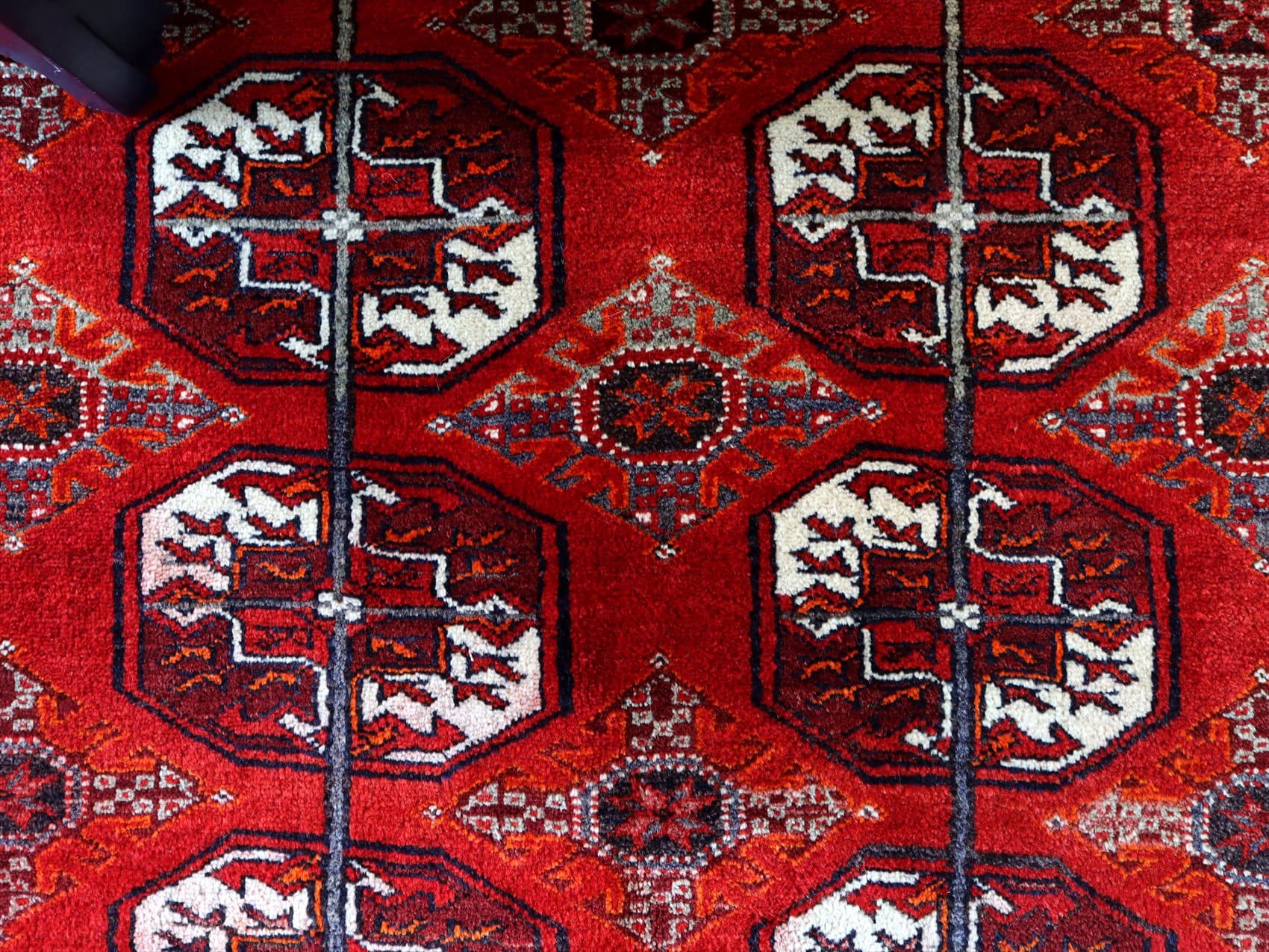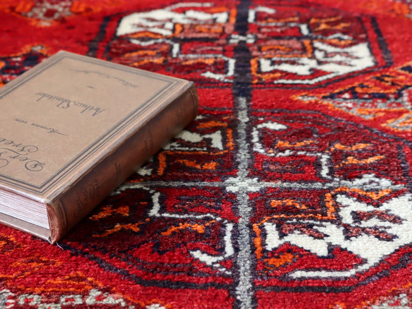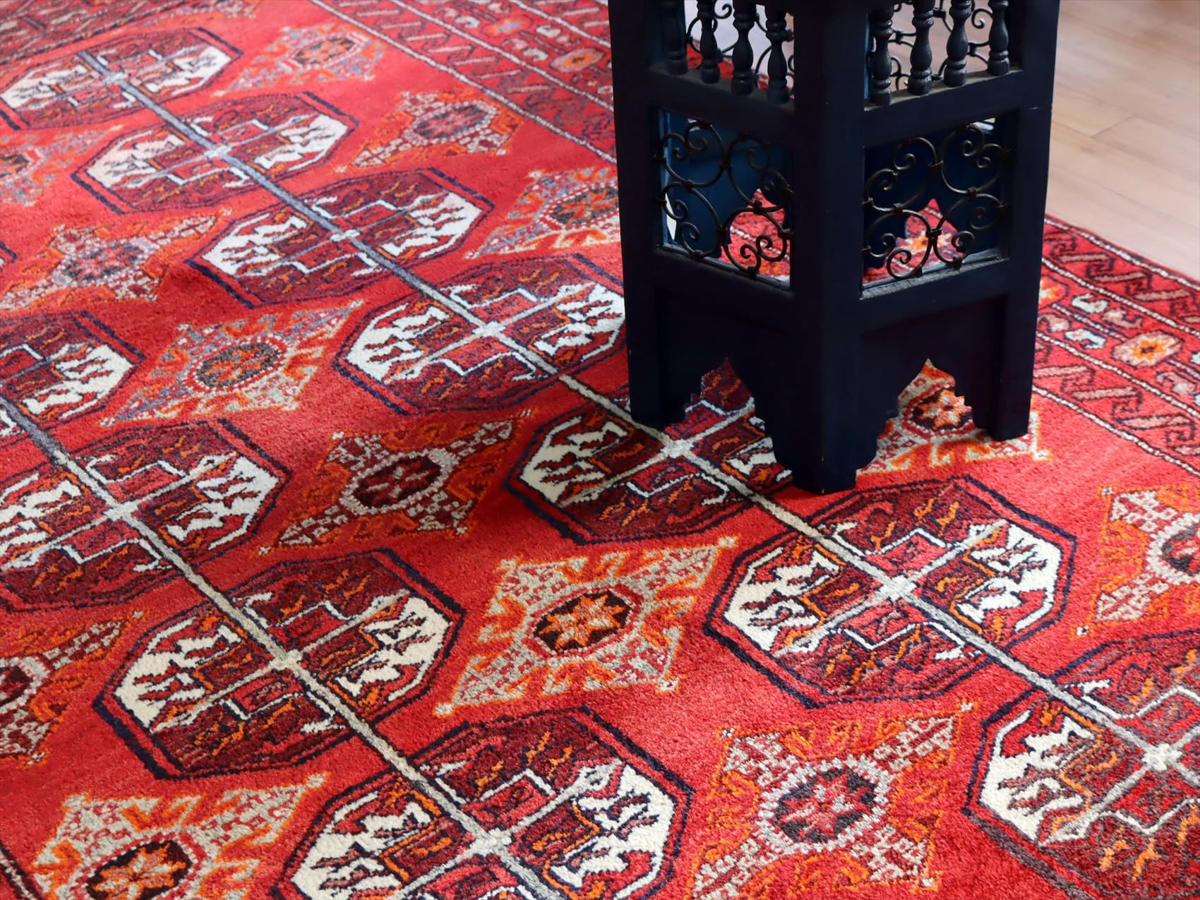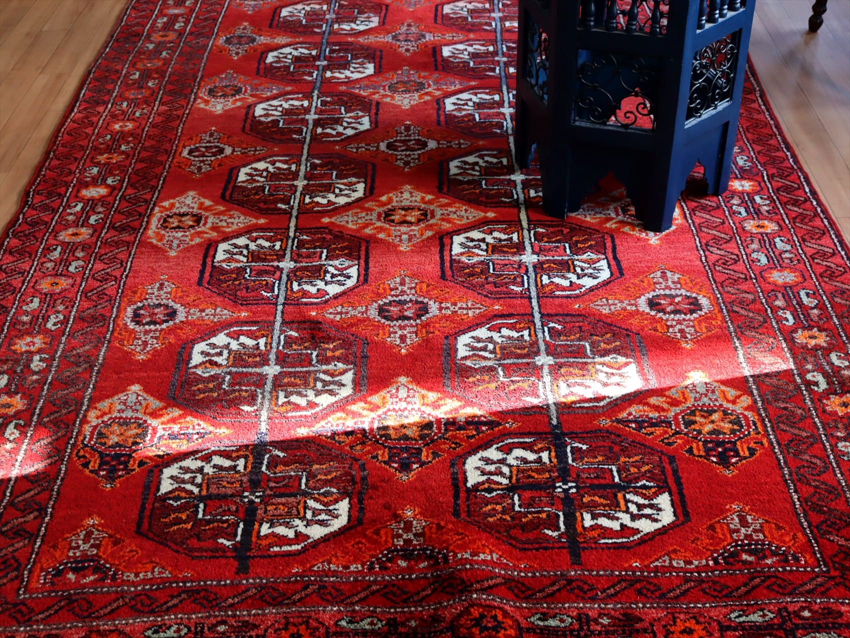 | 朱色がかったレッドのフィールドに、ギュル文様が連続して織られたデザイン。モチーフの細かい部分で使われているネイビーやブルーが色褪せて、パープル、ブルーグレーに変化し、オールドらしいこなれた風合いに。 |