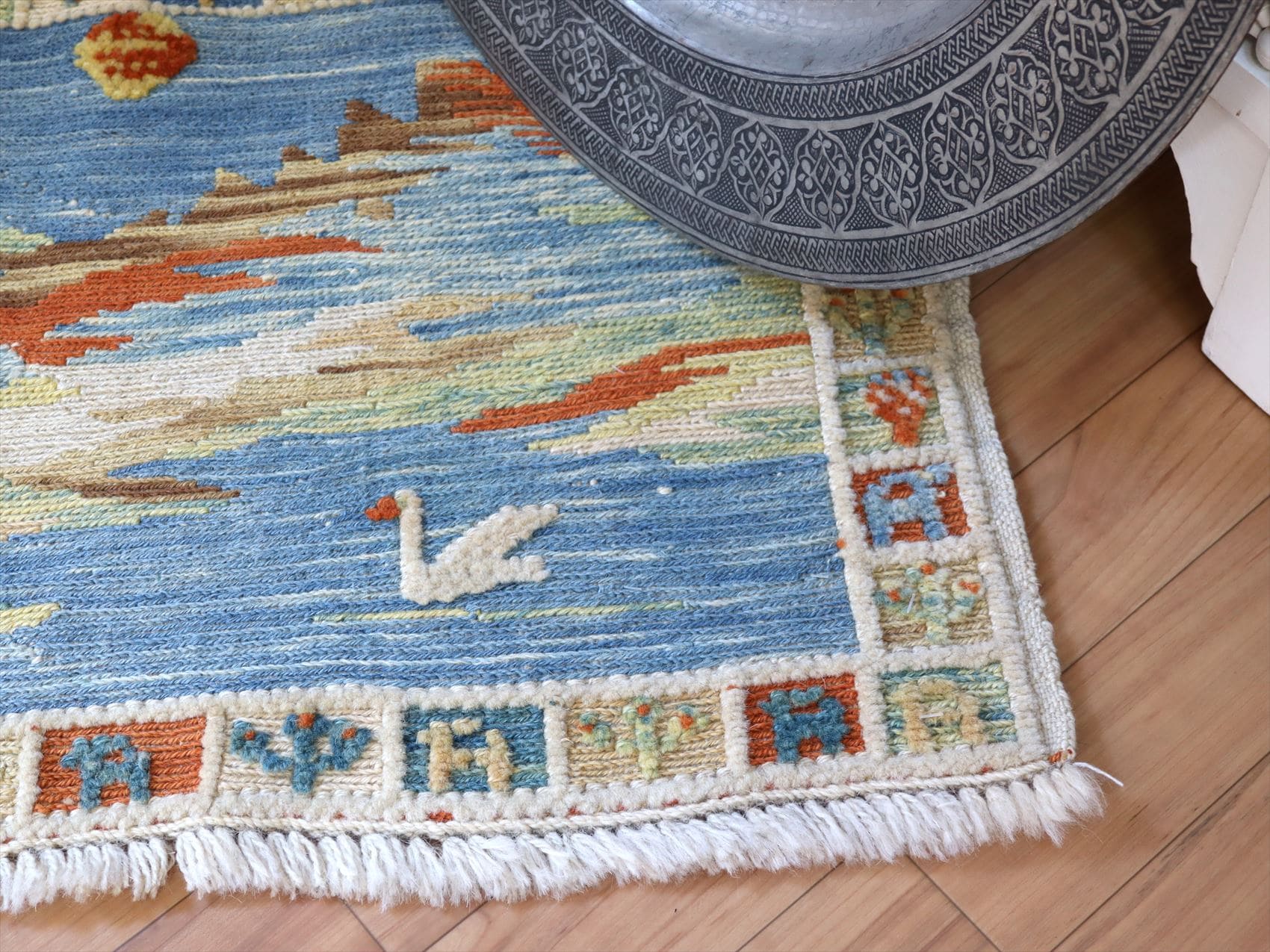 | イラン南西部、ザクロス山脈の麓に暮らすカシュカイ族の楽しいキリム。現在でも遊牧生活を続けているカシュカイ族の生活の様子とのどかな風景が描かれています。右上の丸いモチーフは太陽でしょうか。額縁にも鳥や動物が織りこめれています。風景の表現が抽象的で印象派の絵画のような雰囲気もあります。タペストリーとして壁に掛け、絵画のように楽しむのもおすすめです。 |