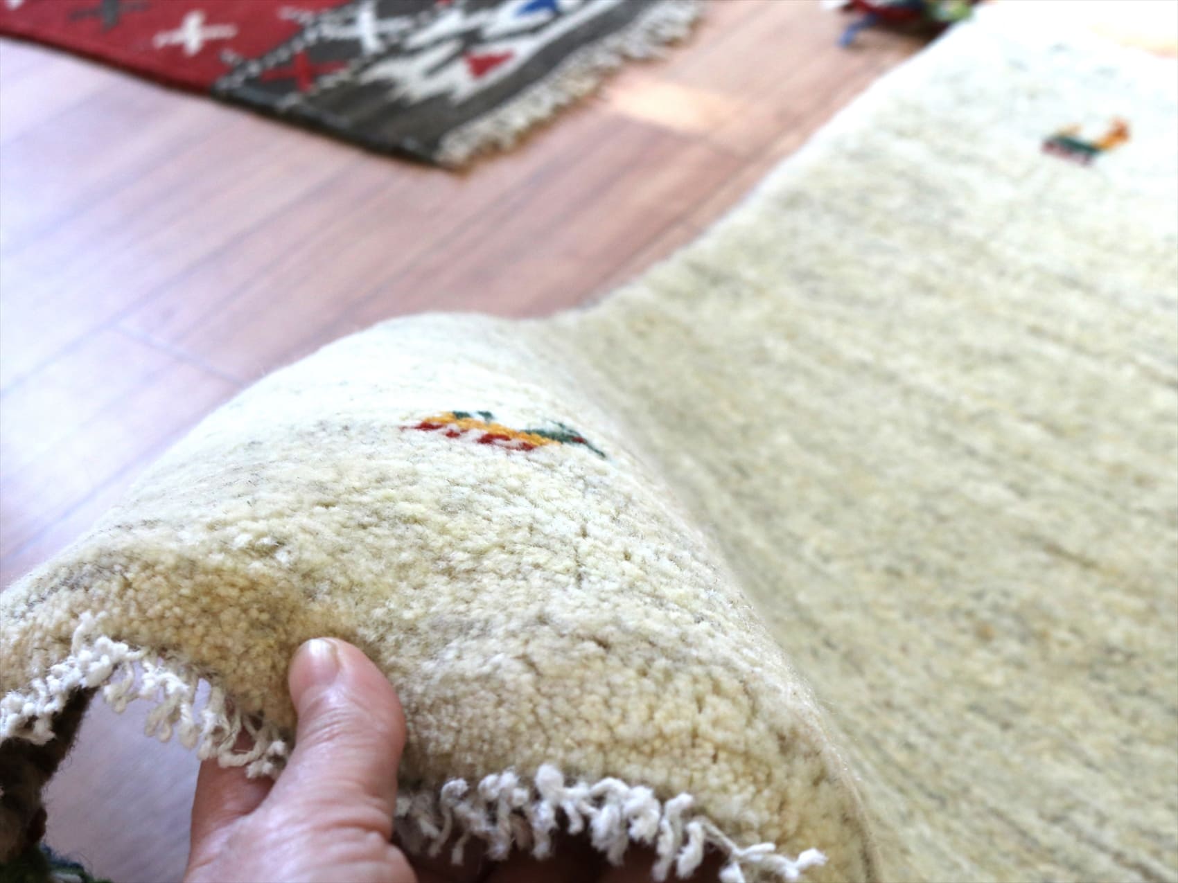 | パイル(毛足)がながく、ふっくらした織りのギャッベ。少し小さめの玄関マットサイズです。 |