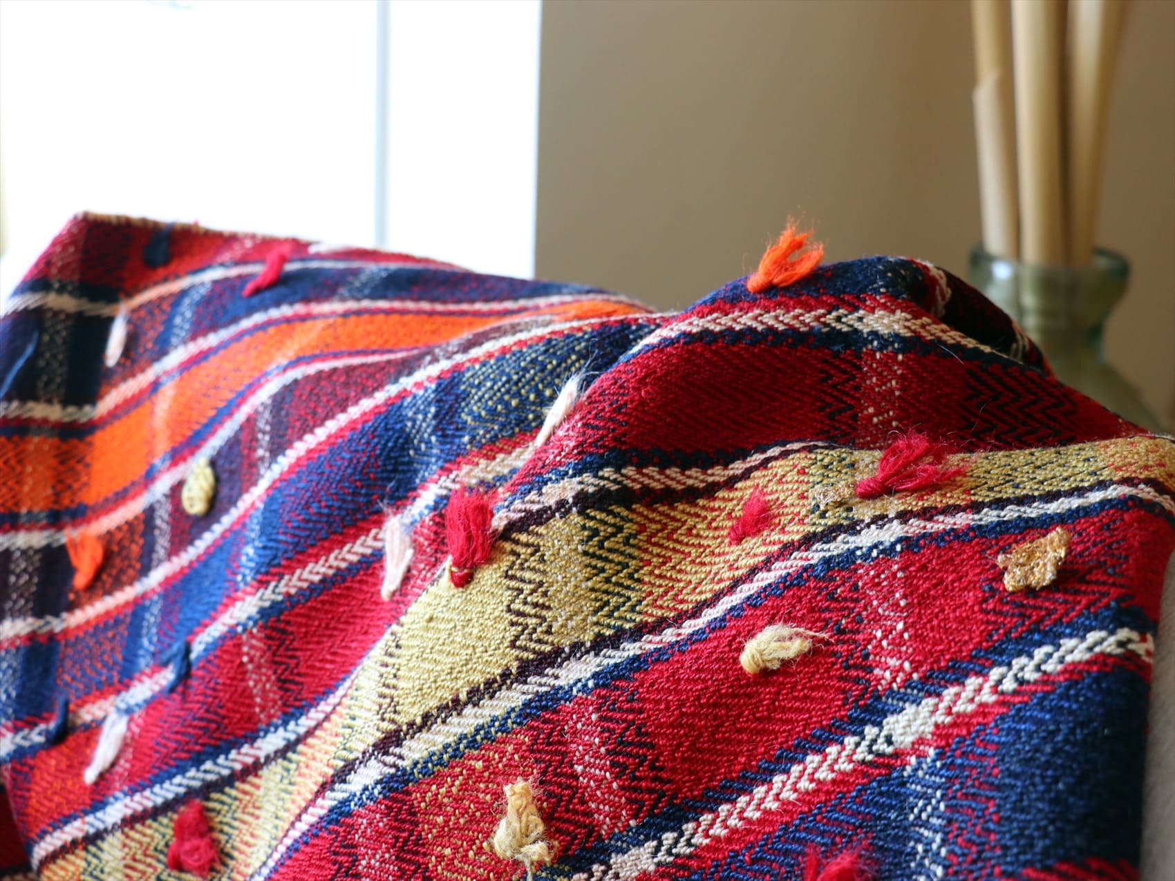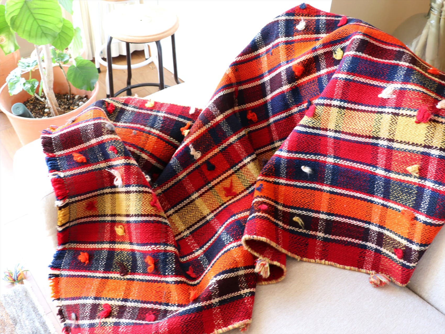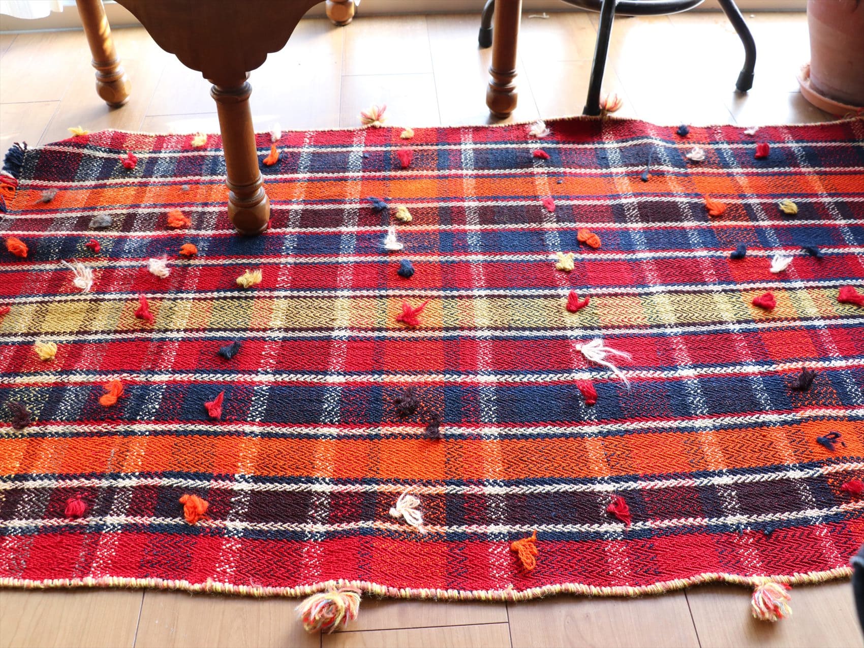 | 厚みのあるしなやかな織り。ポンポンで装飾されています。 |