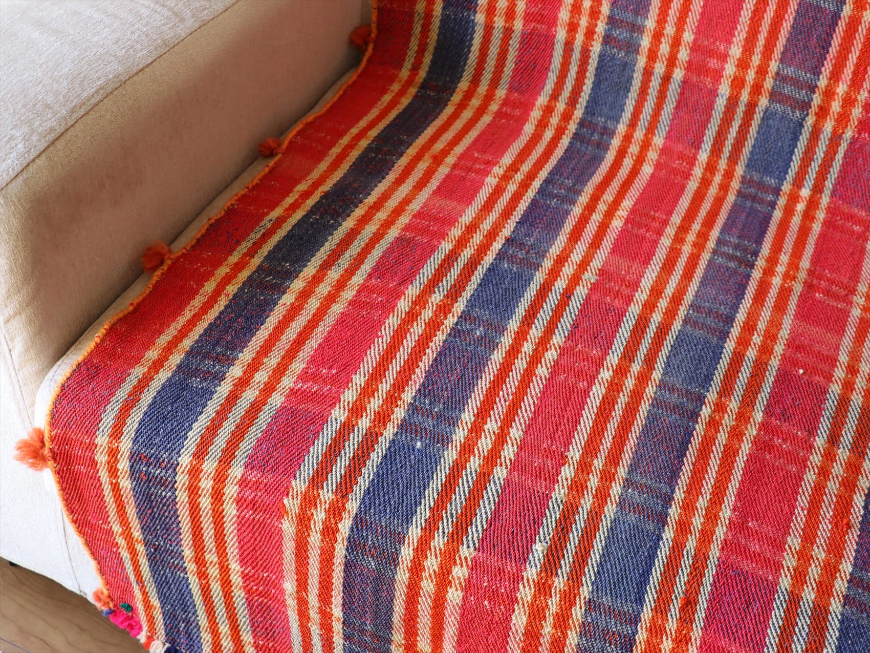 | 厚みのあるしなやかな織り。両端がポンポンで装飾されています。 |