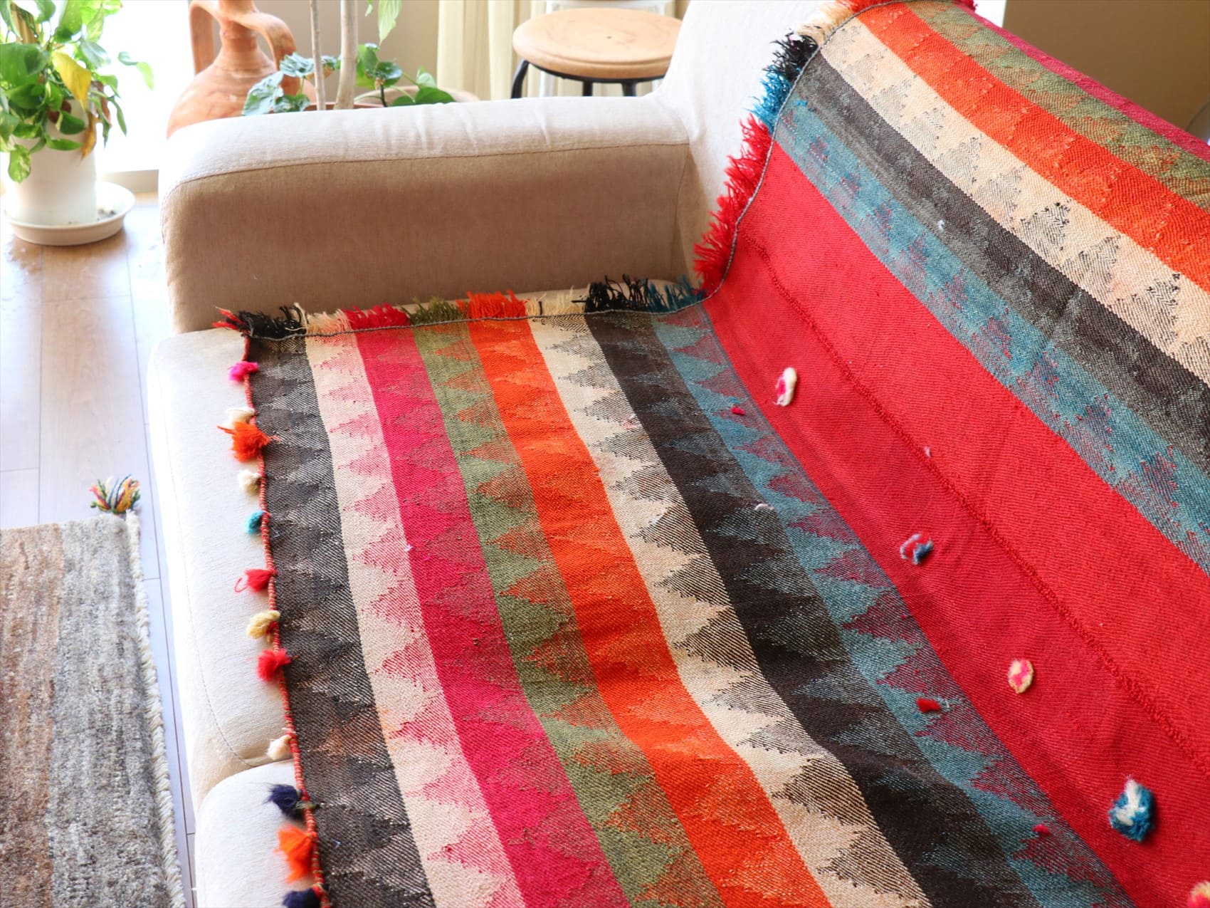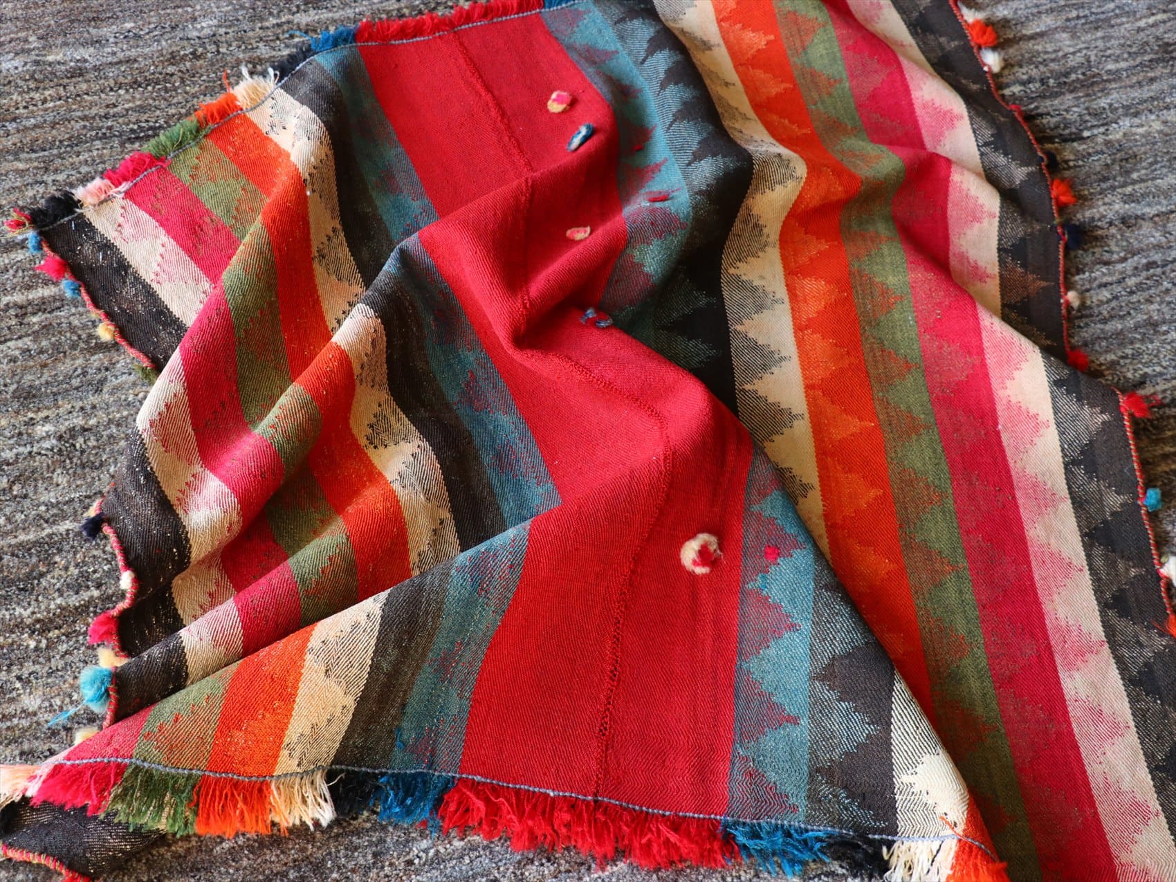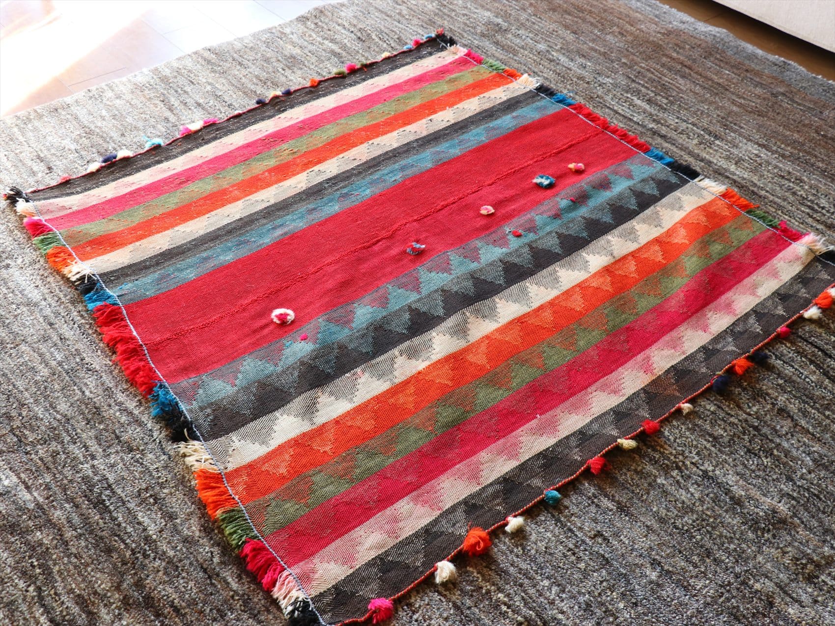 | 2枚を1枚につなぎ合わせたピース。 イラン南西部、シラーズ近郊で暮らす遊牧民「カシュカイ族」がテント内でカバーリングのために織った装飾的なキリムです。本来ならばとても大きなキリムなのですが、このピースはお部屋のアクセントに使いやすい小さなサイズにカットして仕立て直したものです。(もちろん手作業です) 装飾用のキリムと言っても、しっかりとした厚みがありますので、フロアに敷いてもお使いいただけます。 |
