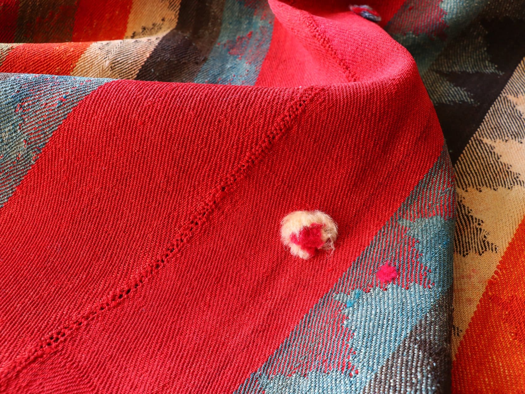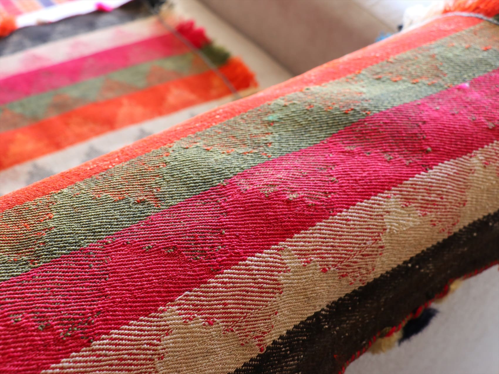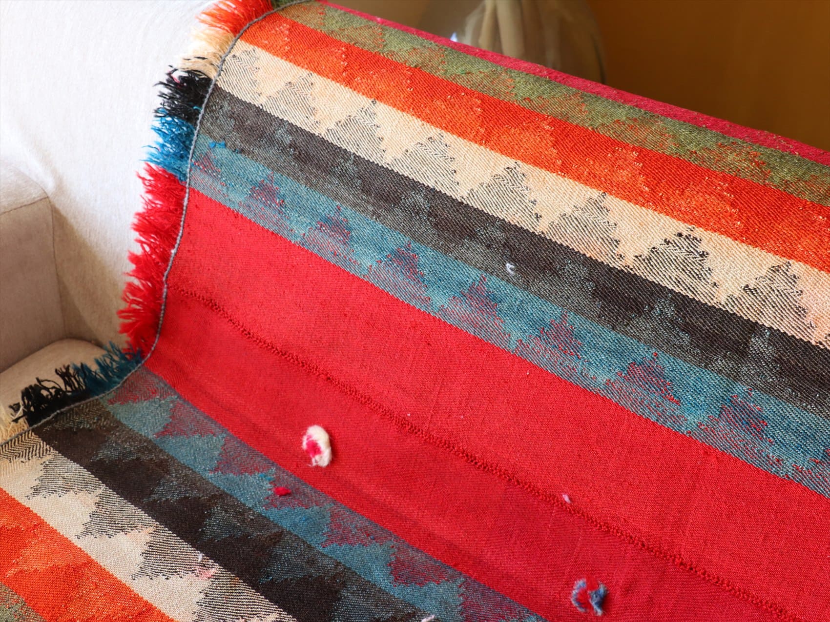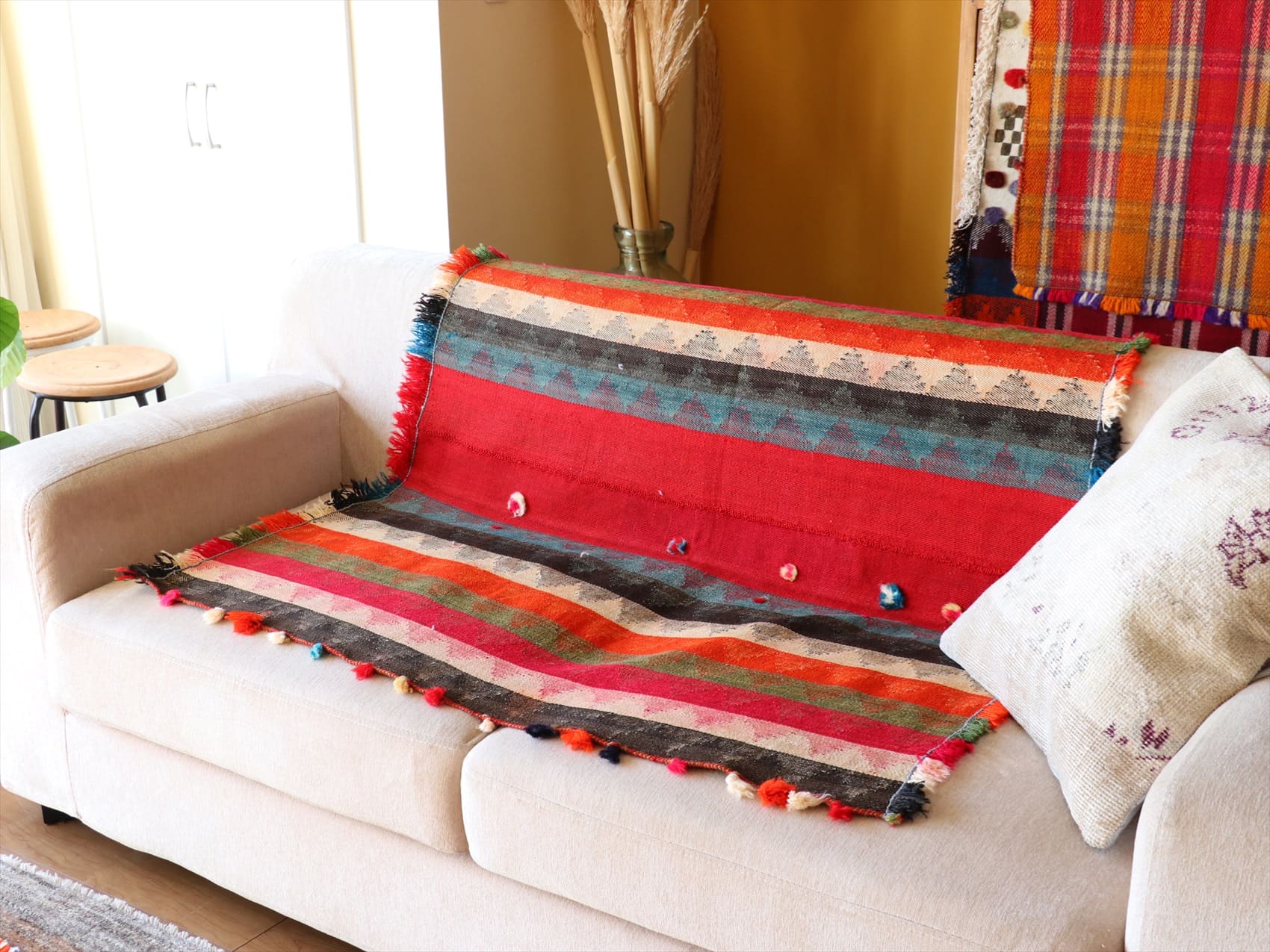| 2枚を1枚につなぎ合わせたピース。 イラン南西部、シラーズ近郊で暮らす遊牧民「カシュカイ族」がテント内でカバーリングのために織った装飾的なキリムです。本来ならばとても大きなキリムなのですが、このピースはお部屋のアクセントに使いやすい小さなサイズにカットして仕立て直したものです。(もちろん手作業です) 装飾用のキリムと言っても、しっかりとした厚みがありますので、フロアに敷いてもお使いいただけます。 |
