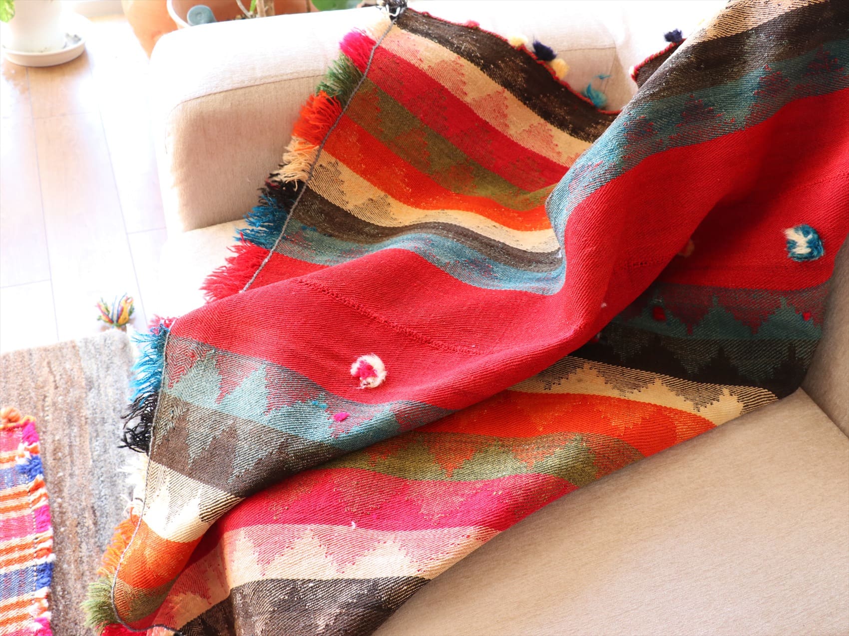 | 厚みのあるしなやかな織り。ポンポンで装飾されています。 |