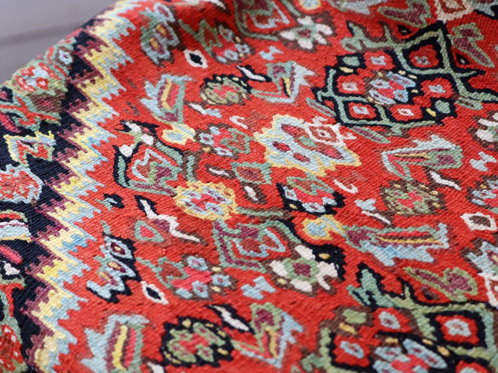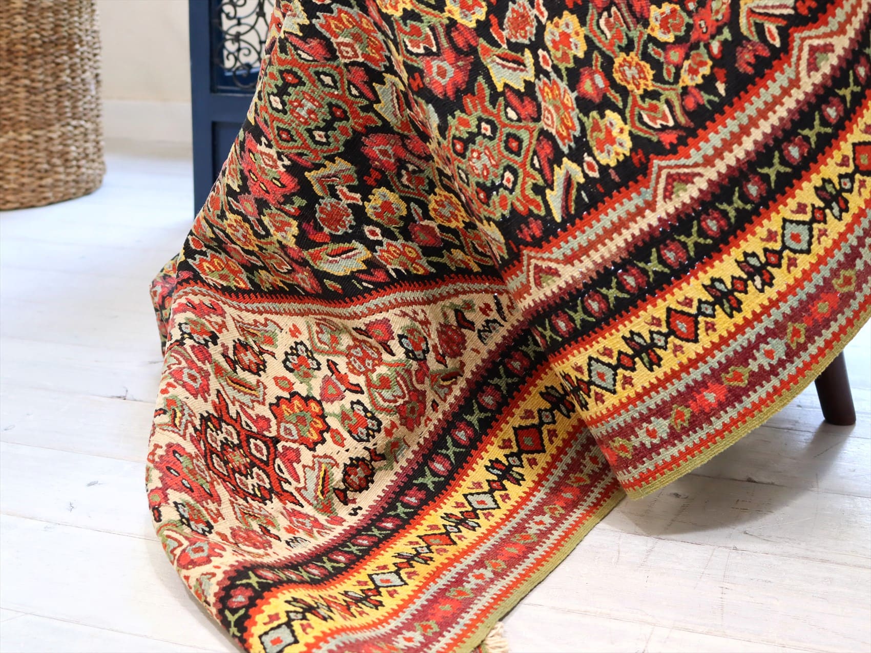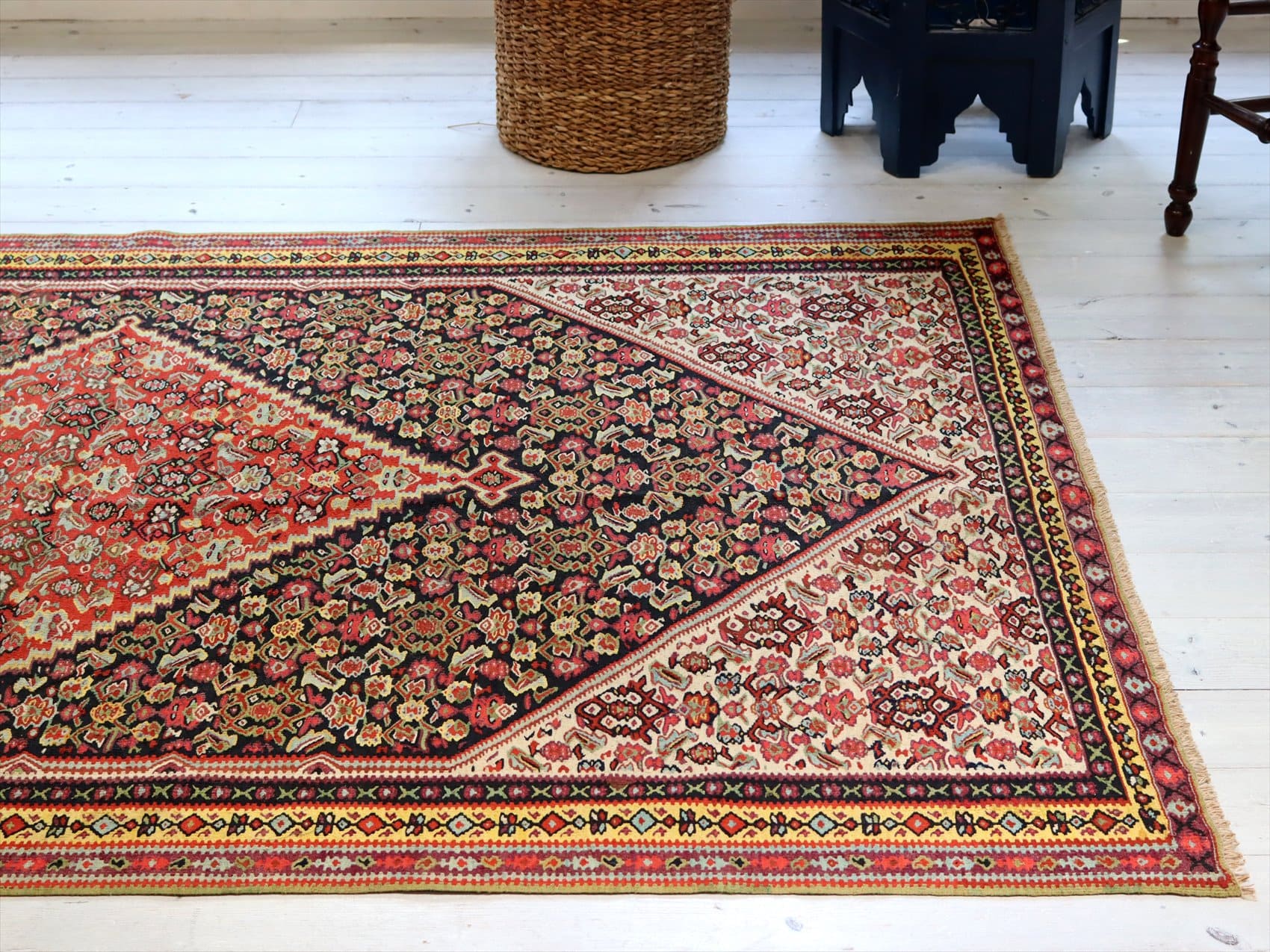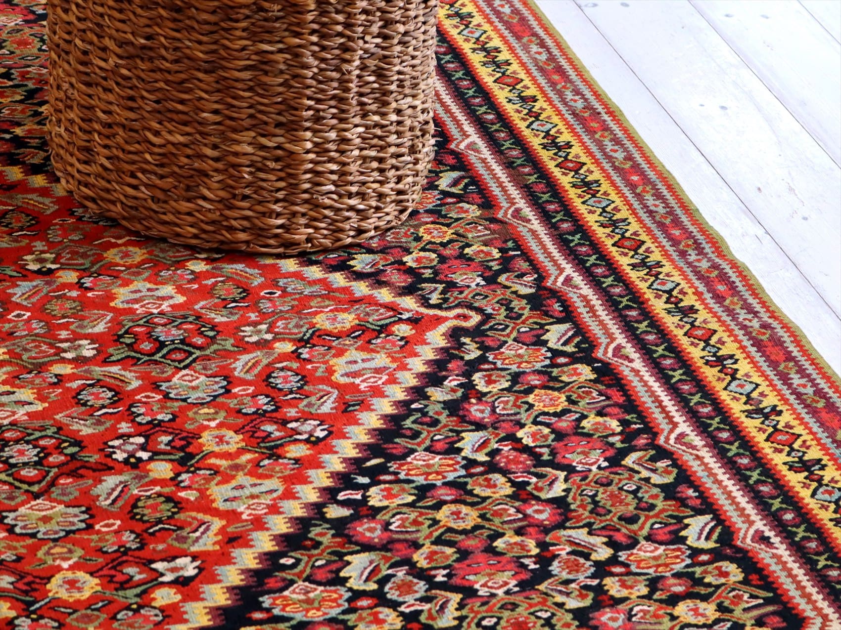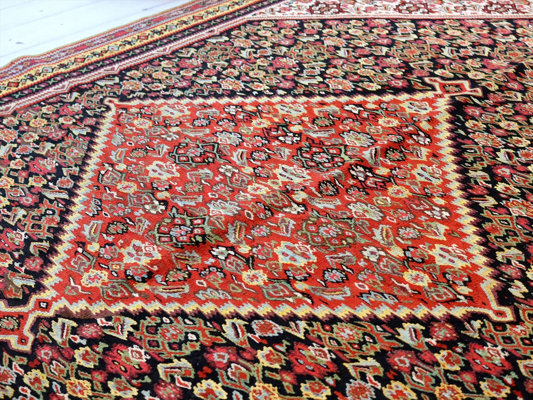 | 非常に細かくていねいに織られたイラン南西部、トルコとの国境に近いセネという町の特徴あるキリム。 この地域は、カシュカイ族やクルド族など、ワイルドな織りのキリムが多いのですが、セネだけは趣が違っています。サファビー王朝が好んで使ったという六角形のメダリオンに、ペルシャじゅうたんにも描かれているようなモチーフが織られており、およそ遊牧民のキリムとは違ったデザインになっているのです。 |