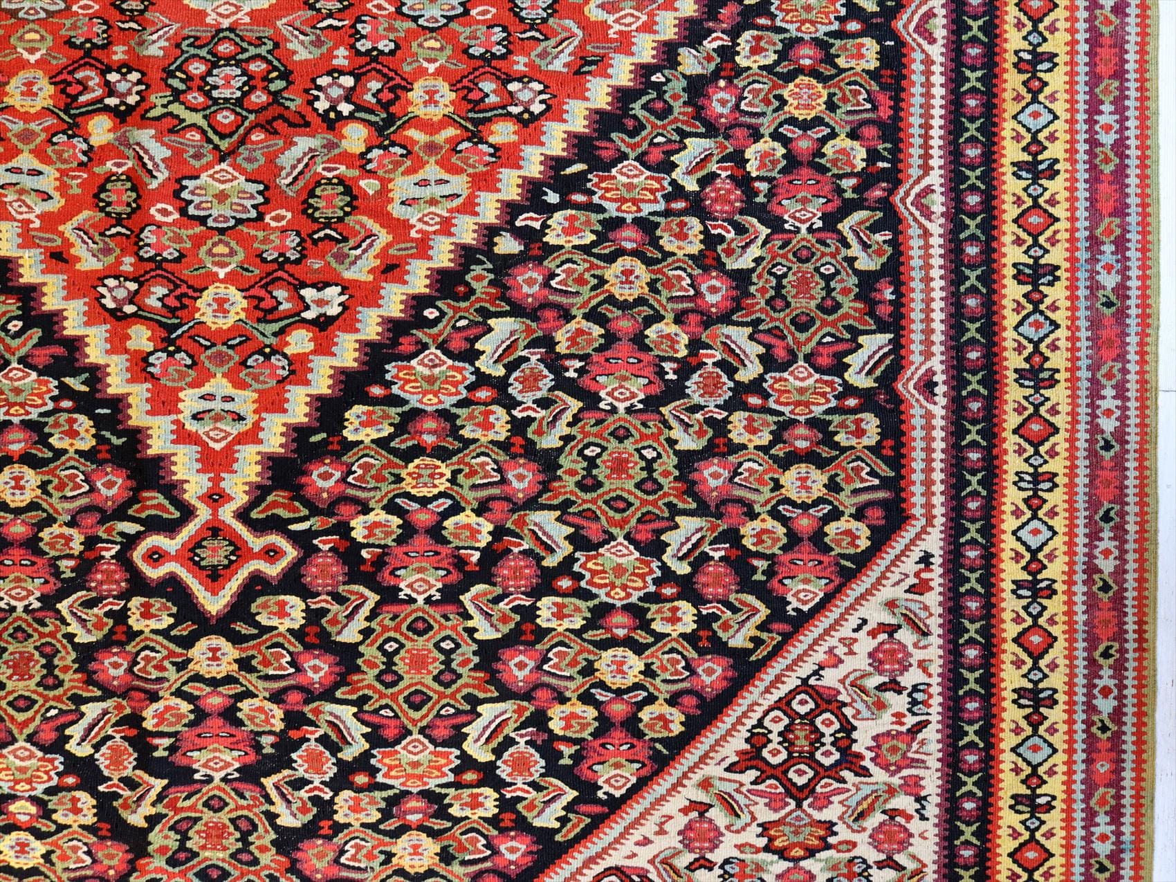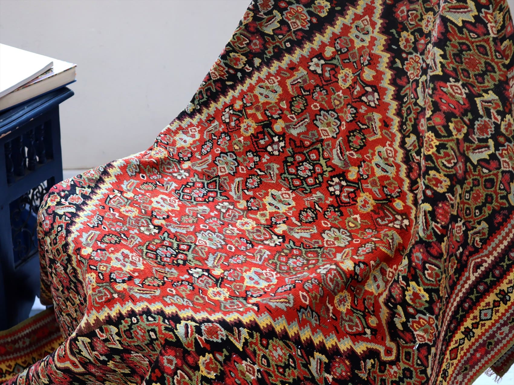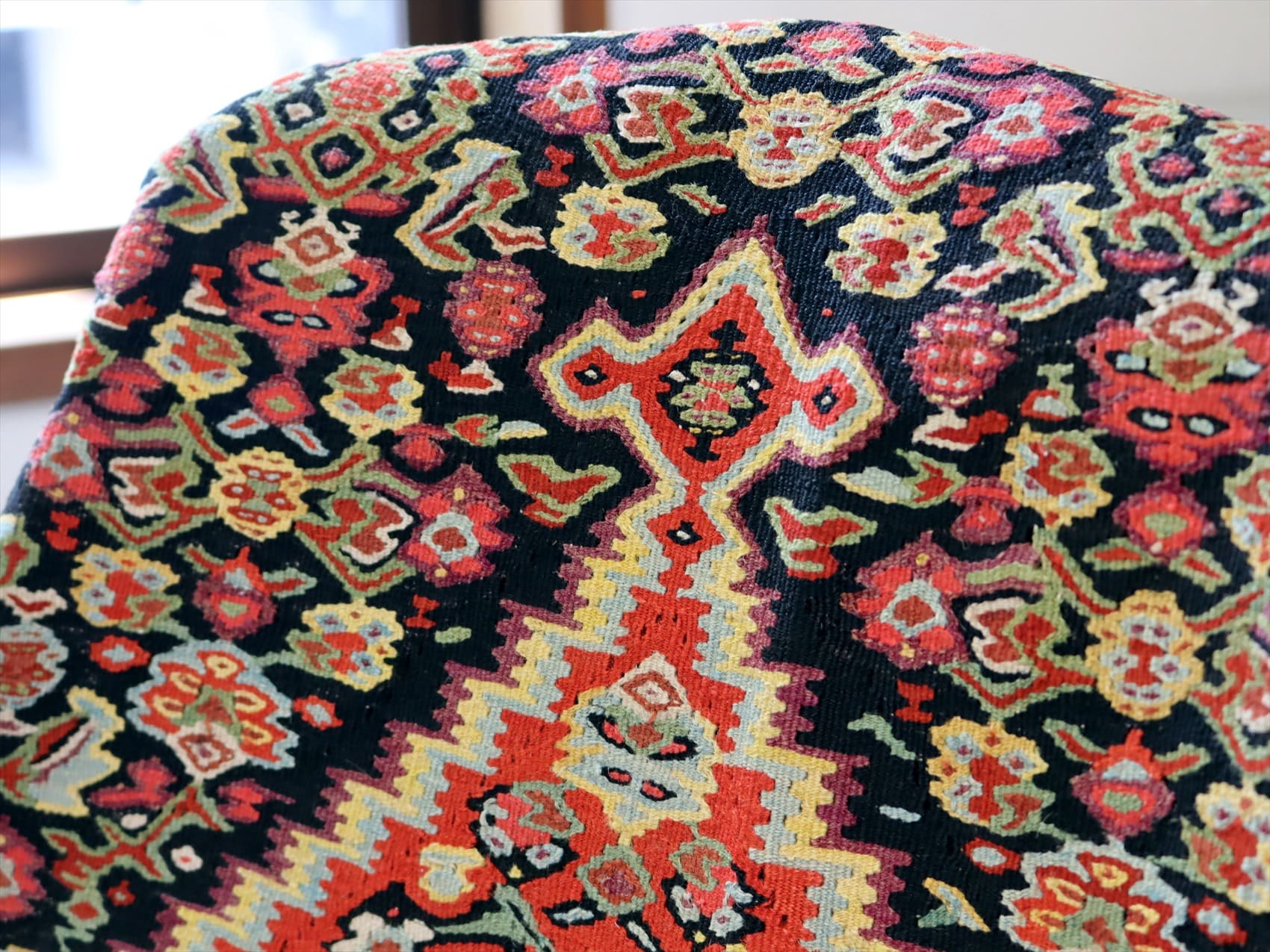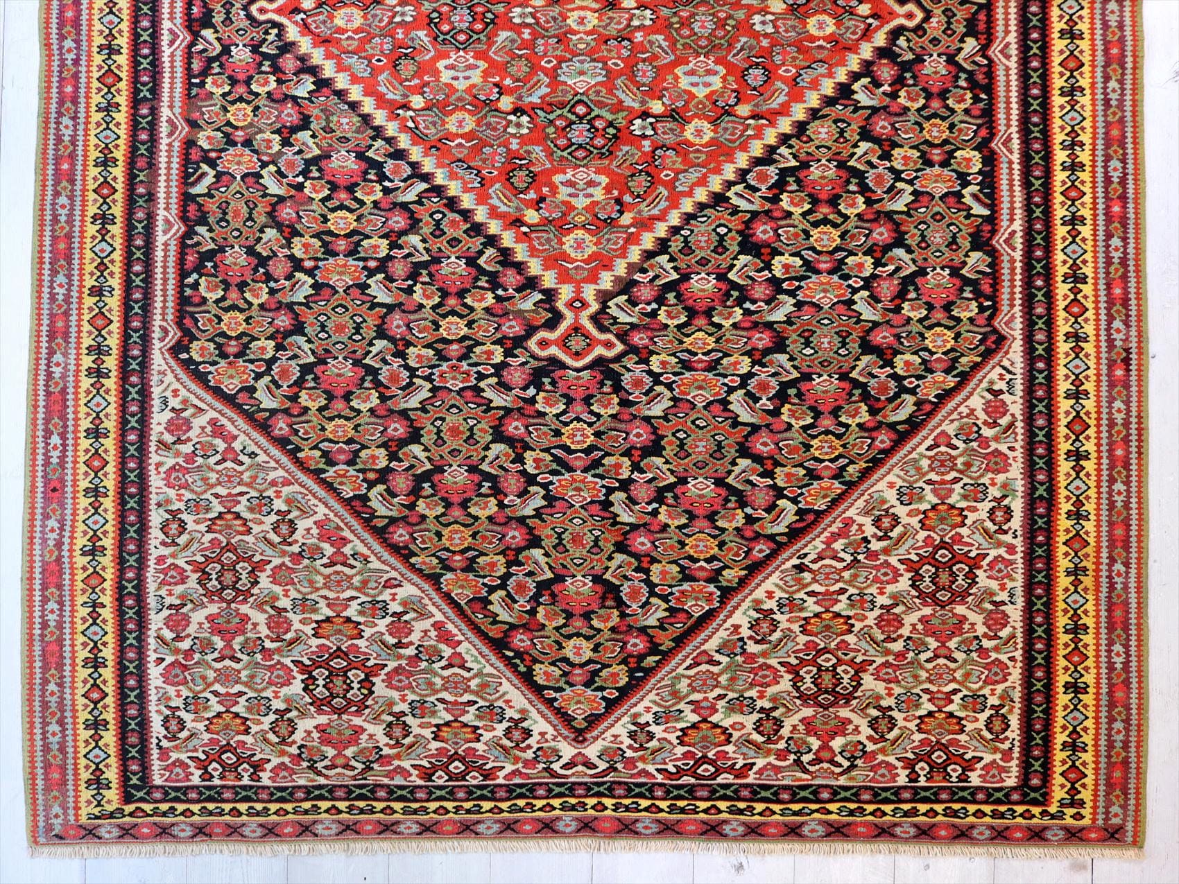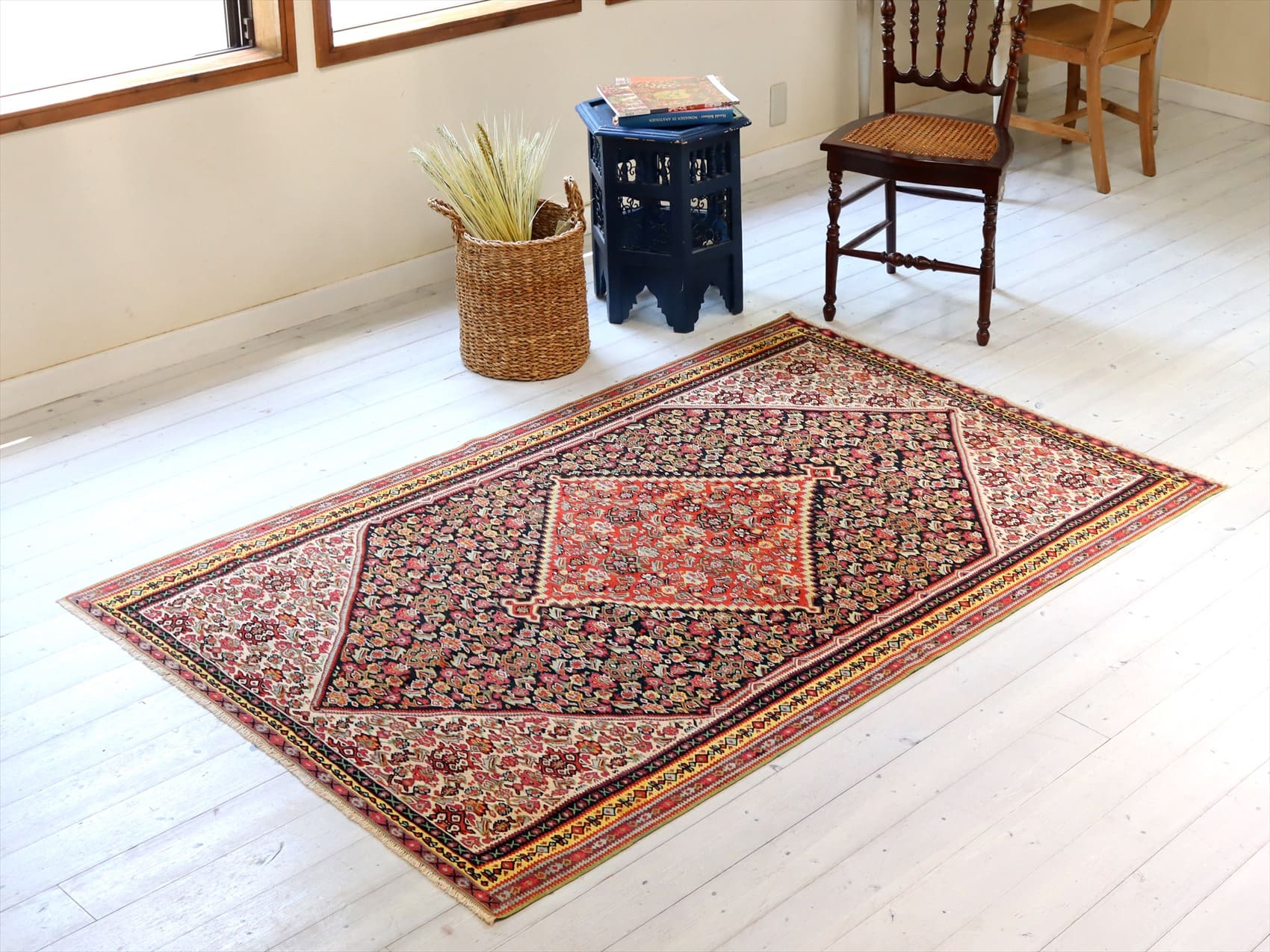 | 非常に細かくていねいに織られたイラン南西部、トルコとの国境に近いセネという町の特徴あるキリム。 この地域は、カシュカイ族やクルド族など、ワイルドな織りのキリムが多いのですが、セネだけは趣が違っています。サファビー王朝が好んで使ったという六角形のメダリオンに、ペルシャじゅうたんにも描かれているようなモチーフが織られており、およそ遊牧民のキリムとは違ったデザインになっているのです。 |