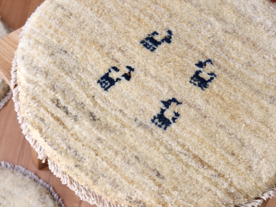 ギャッベ イラン製 丸い座布団40×42cm 天然の羊毛色 アイボリー 円形 動物モチーフ
