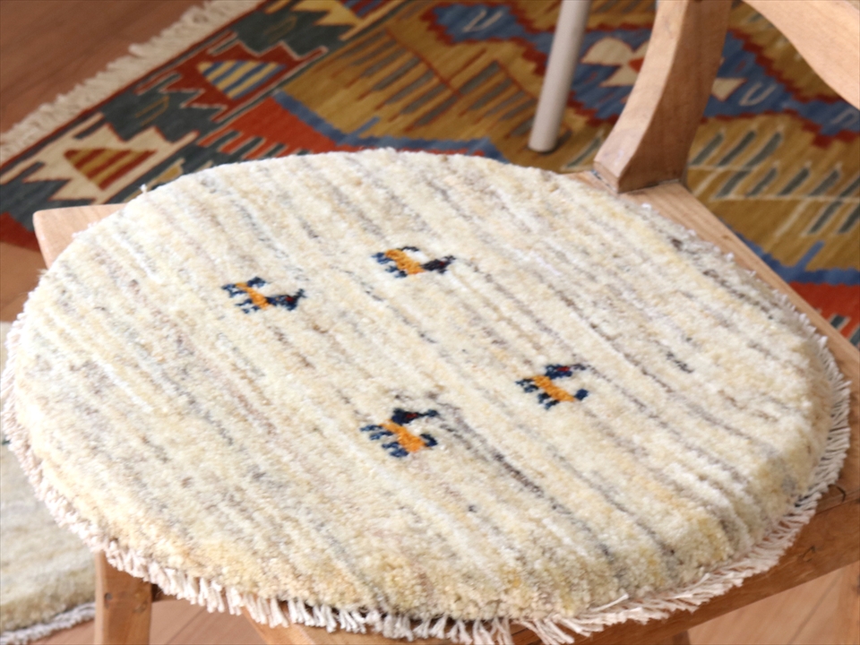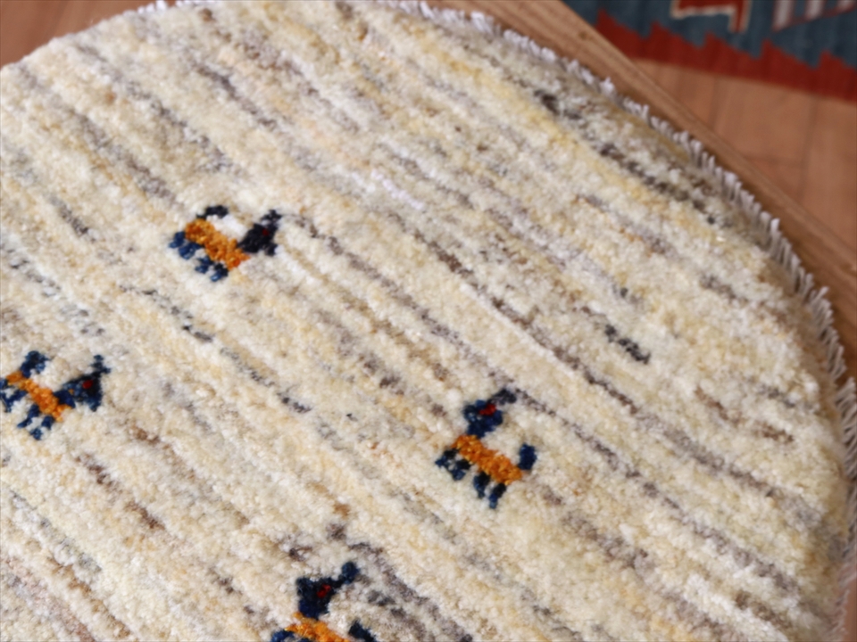 ギャッベ イラン製 丸い座布団41×43cm 天然の羊毛色 アイボリー 円形 動物モチーフ
