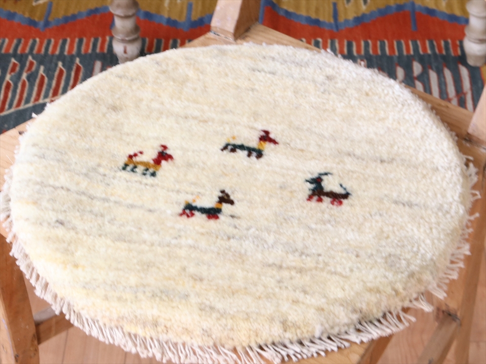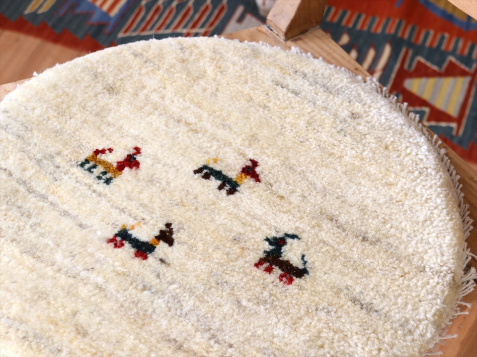 ギャッベ イラン製 丸い座布団40×41cm 天然の羊毛色 アイボリー 円形 動物モチーフ