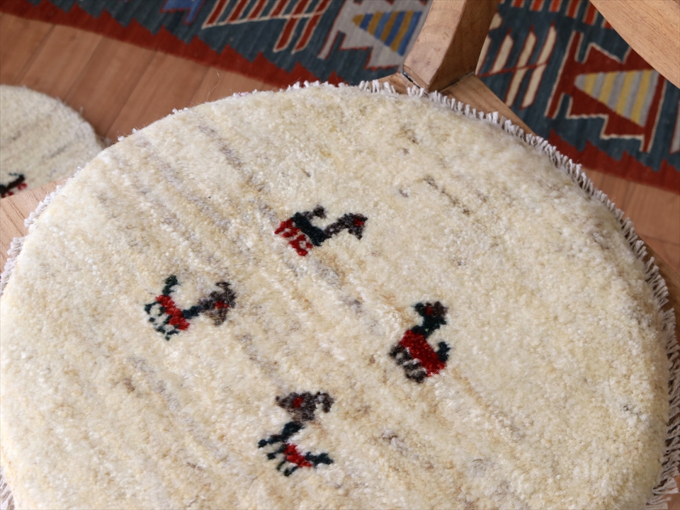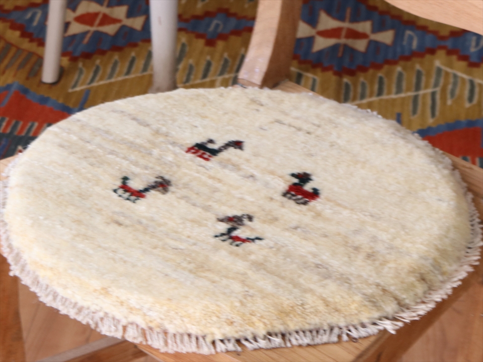 ギャッベ イラン製 丸い座布団41×42cm 天然の羊毛色 アイボリー 円形 動物モチーフ