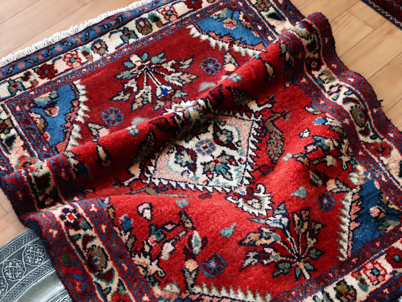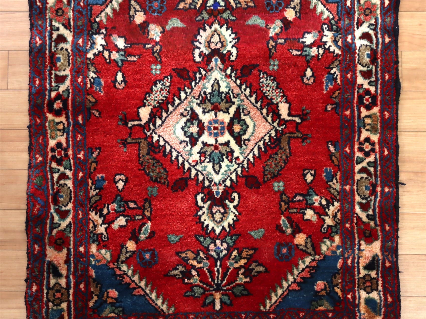 | 中央にメダリオン、そのまわりにクジャクと思われるような鳥のモチーフと小花が織られた華やかなデザイン。レッドとブルーの色が鮮やかで美しいです。 |