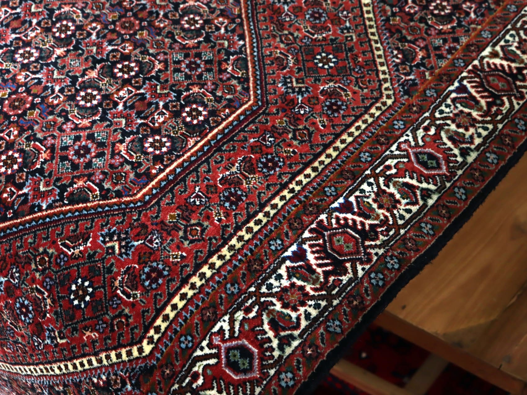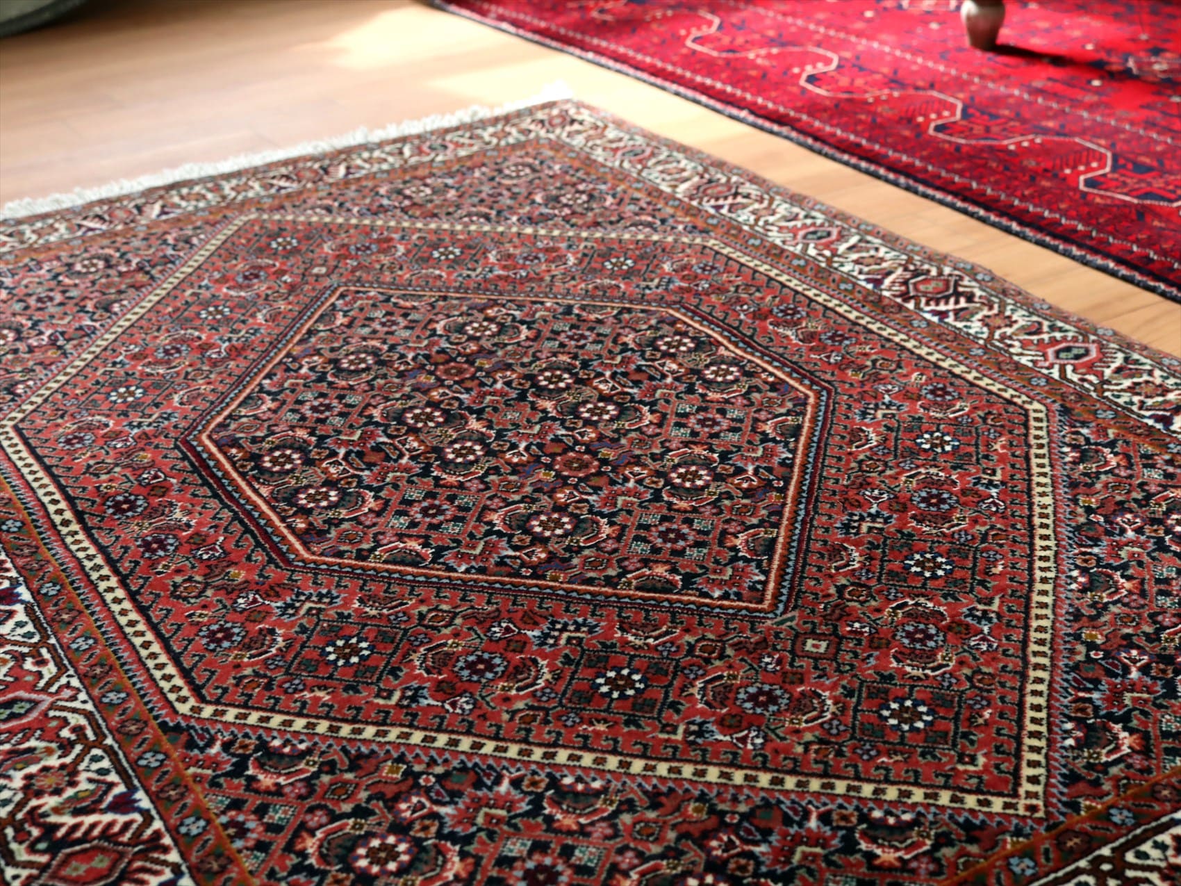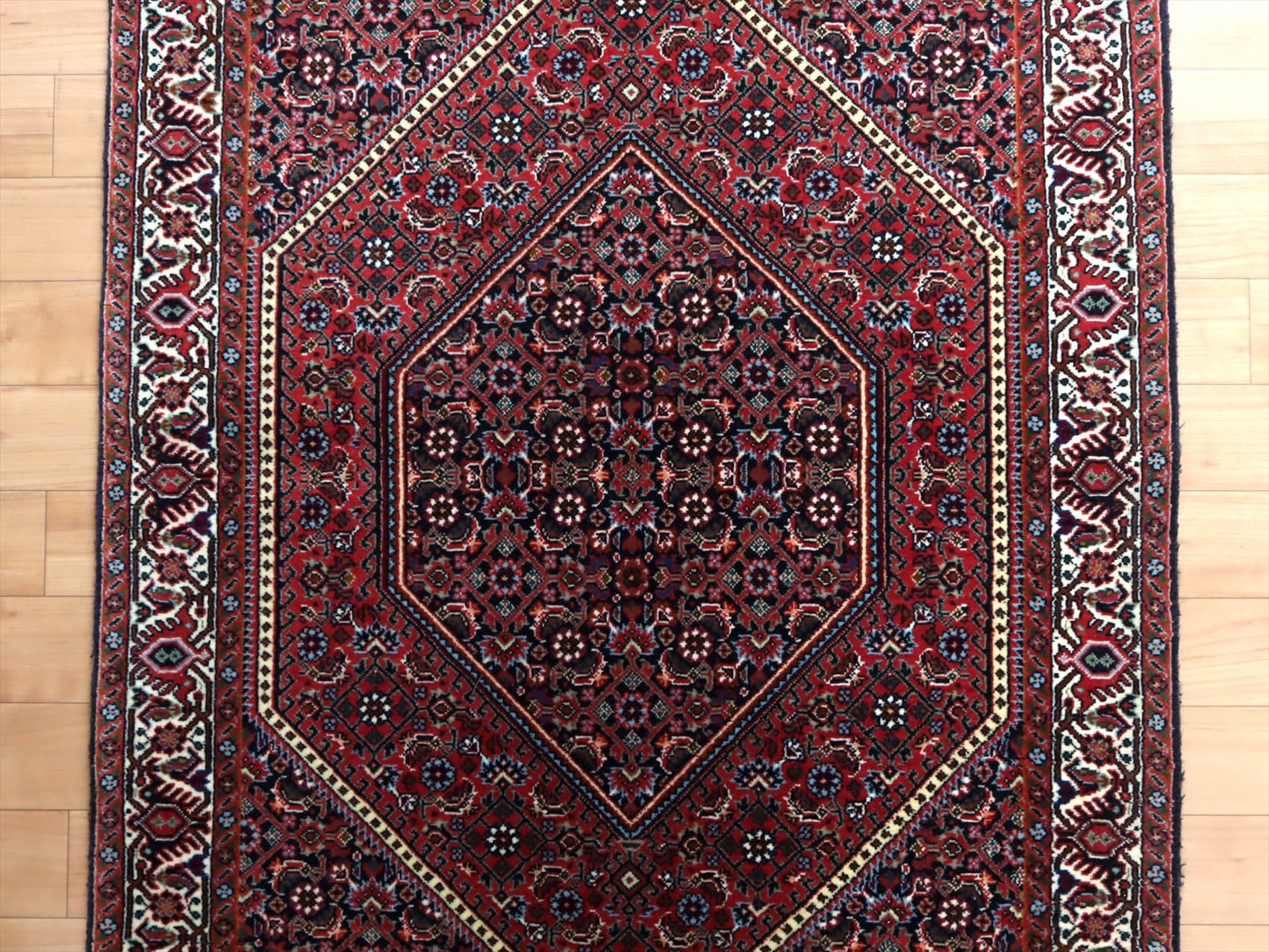 | イラン北西にある都市ビジャールで織られたじゅうたんです。この地域には主にクルド系の民族が住んでおり、絨毯はトルコ結びで作られています。ビジャールのじゅたんは織りの目が詰まっており、砂やほこりが入りにくいため耐久性に優れていると言われています。ビジャールのじゅうたんには多くのデザインがあり、こちらのじゅたんは直線的な六角形のメダリオンが特徴的です。メダリオンはレッドのベースに小さな花の模様が散りばめれています。 |