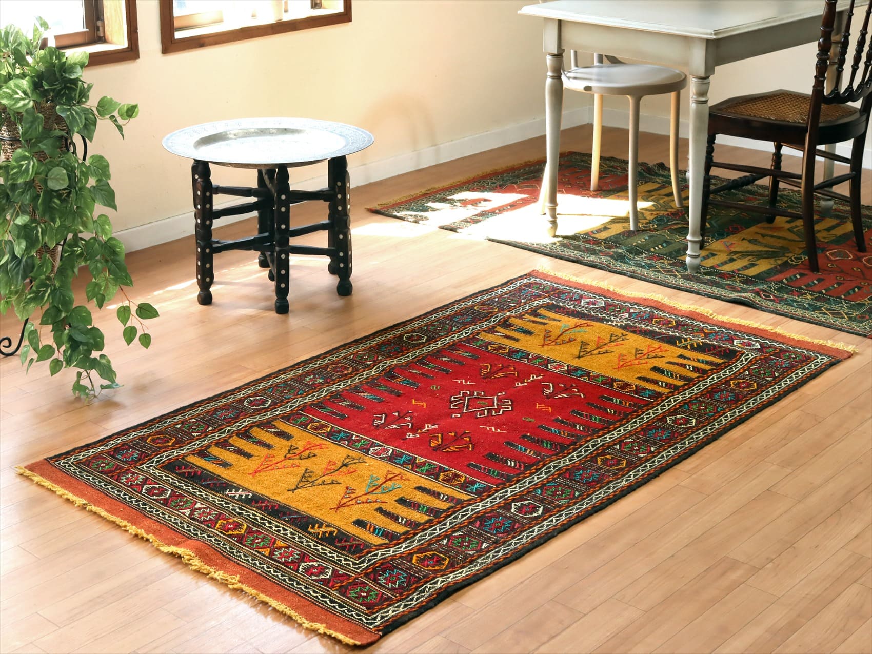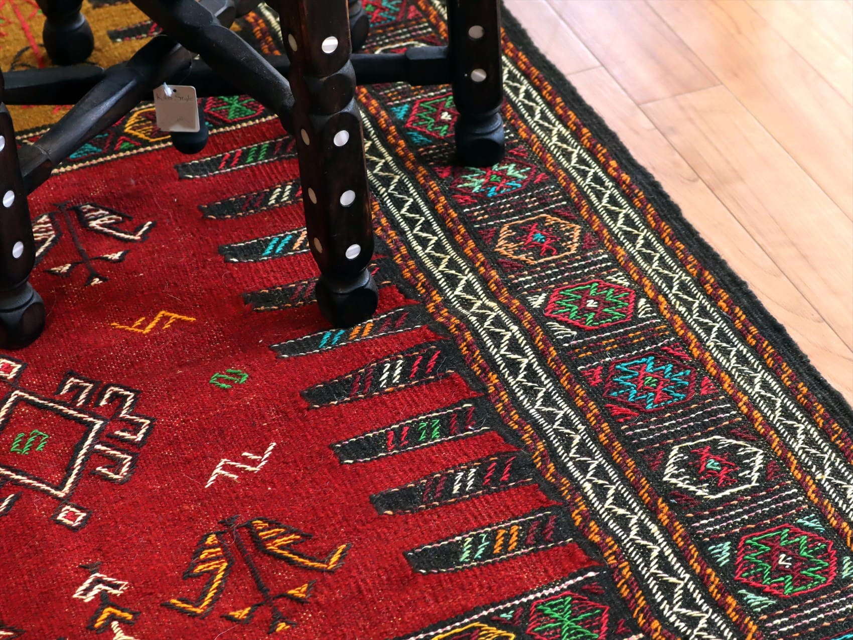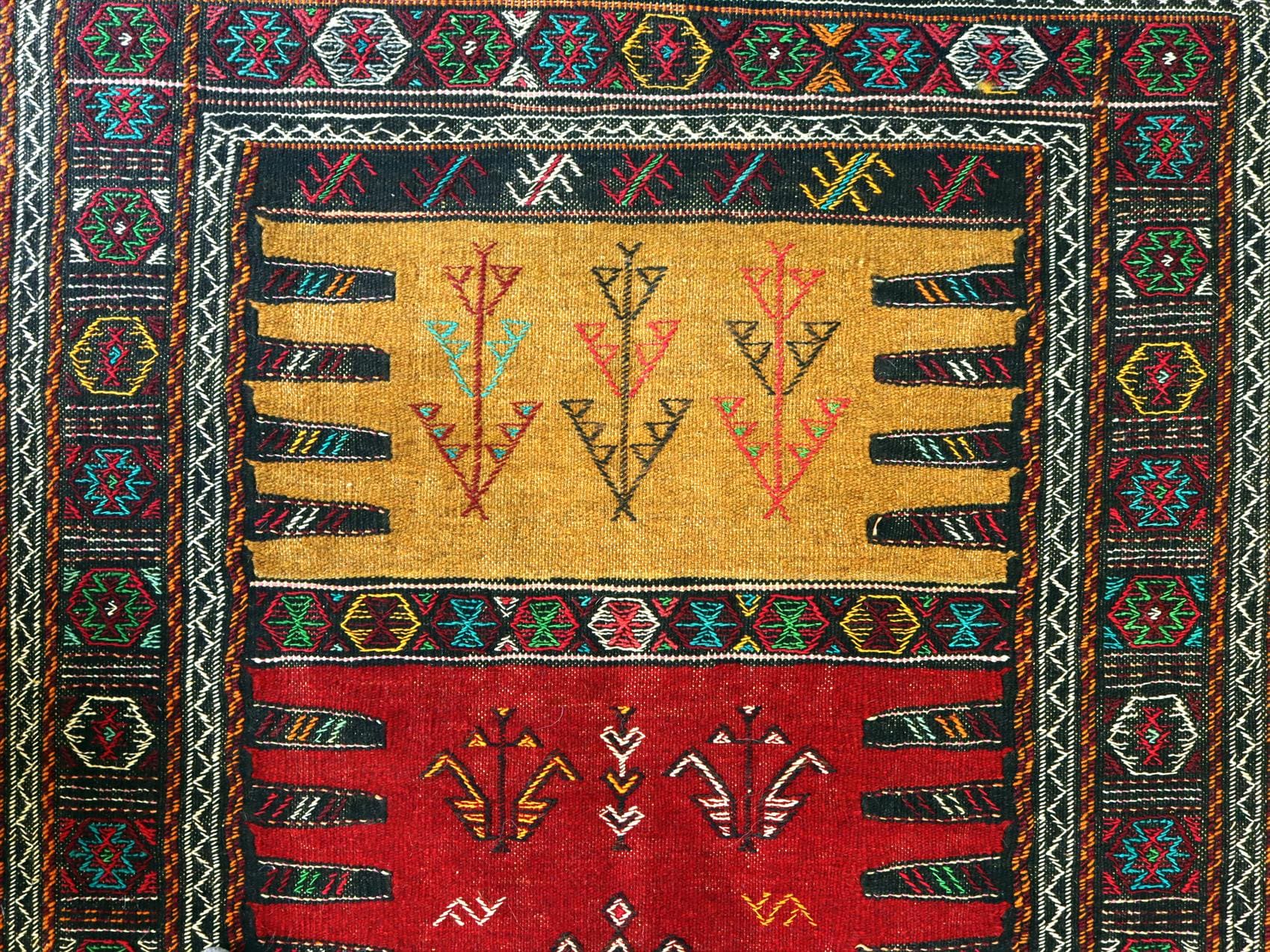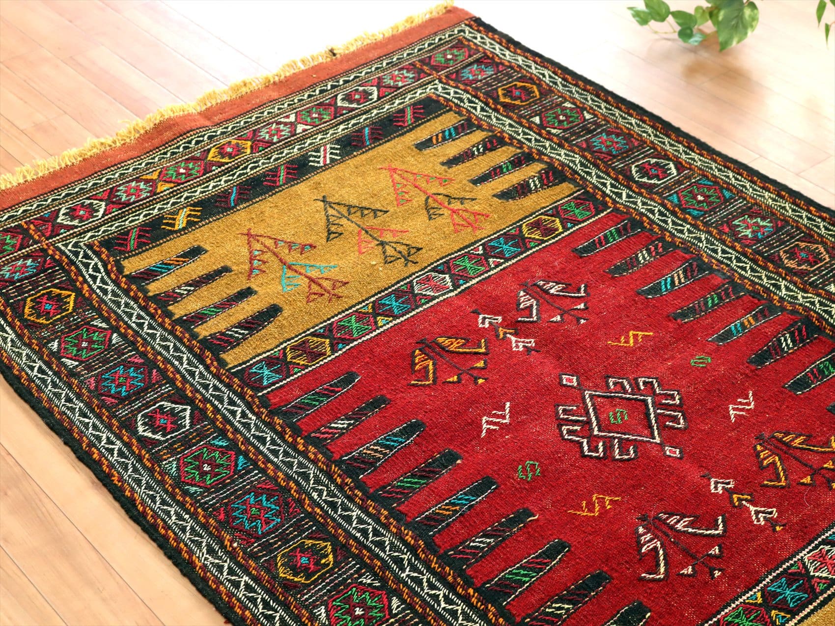 | イラン東北部、アフガニスタンに近い山間部のエリアに暮らすグチャン族の織ったキリム。素朴で力強いイメージで、シンプルな織りのキリムをベースに、様々なモチーフが立体的なジジム織りで、織り込まれています。 |