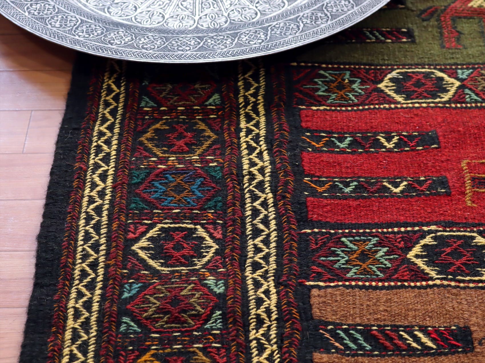 | イラン東北部、アフガニスタンに近い山間部のエリアに暮らすグチャン族の織ったキリム。素朴で力強いイメージで、シンプルな織りのキリムをベースに、動物や幾何学的にアレンジした様々なモチーフが立体的なジジム織りで、織り込まれています。 |