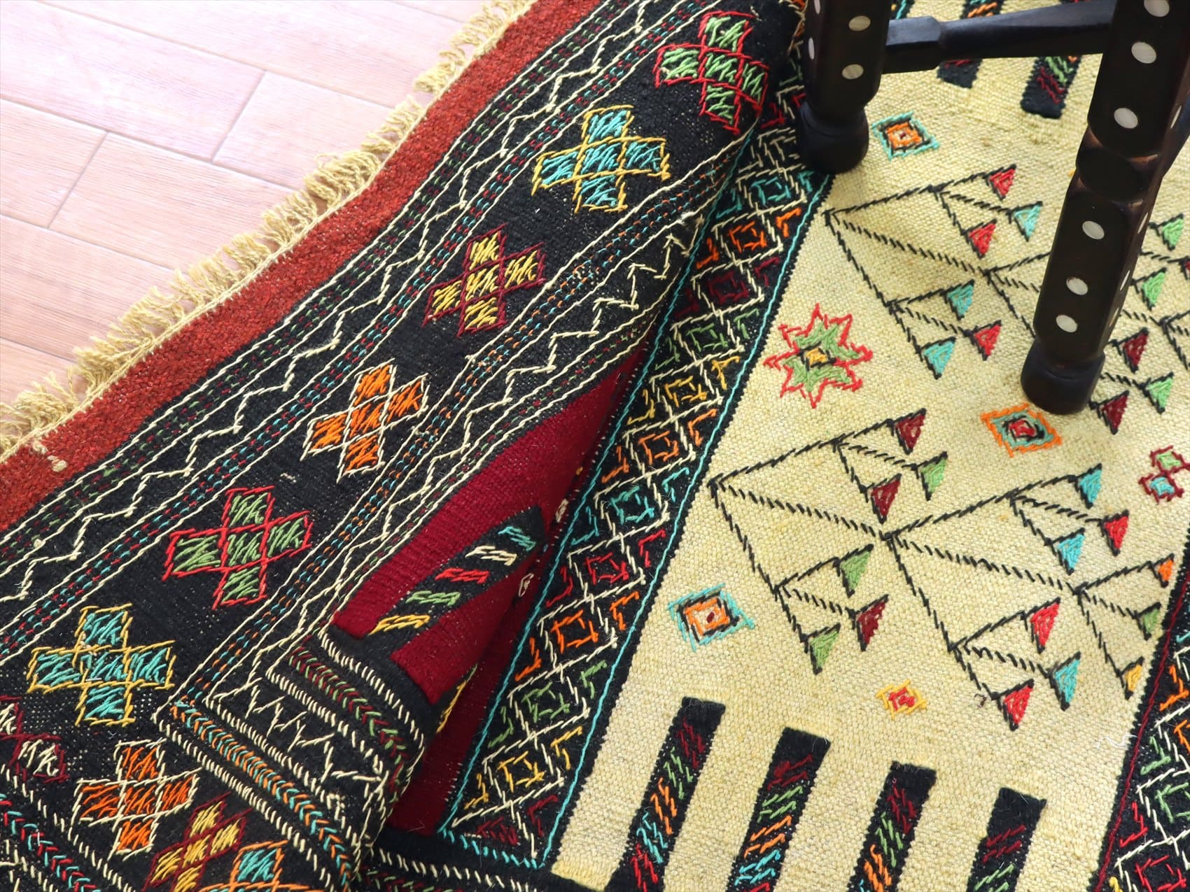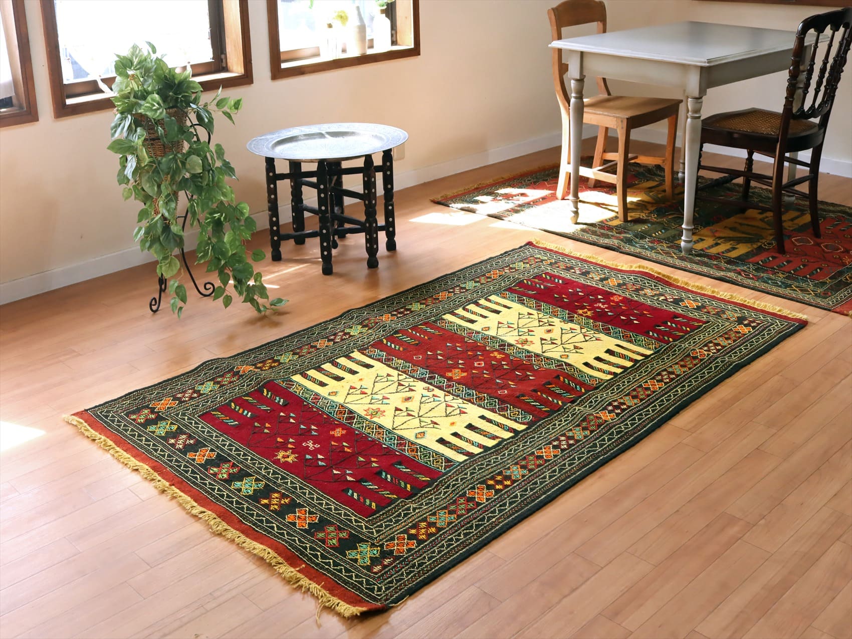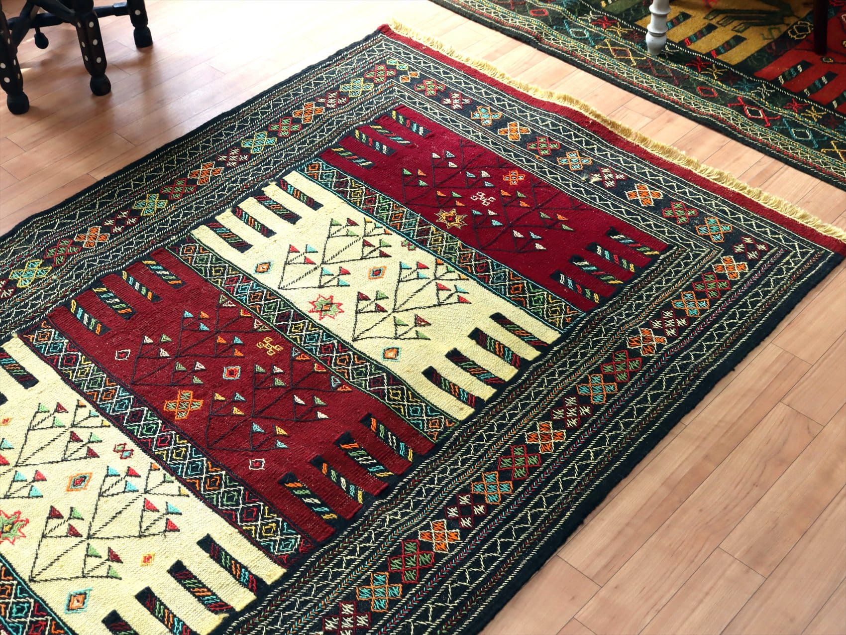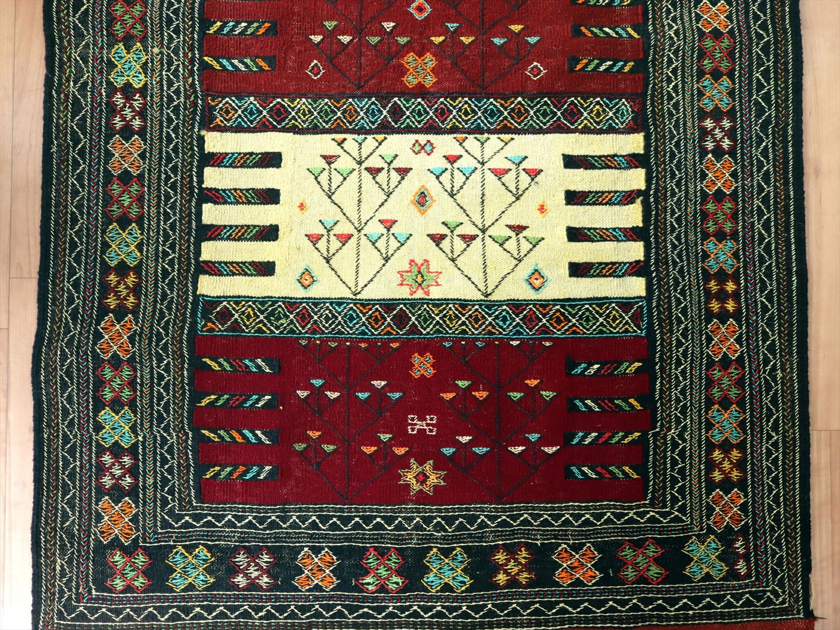 | イラン東北部、アフガニスタンに近い山間部のエリアに暮らすグチャン族の織ったキリム。素朴で力強いイメージで、シンプルな織りのキリムをベースに、様々なモチーフが立体的なジジム織りで、織り込まれています。 |