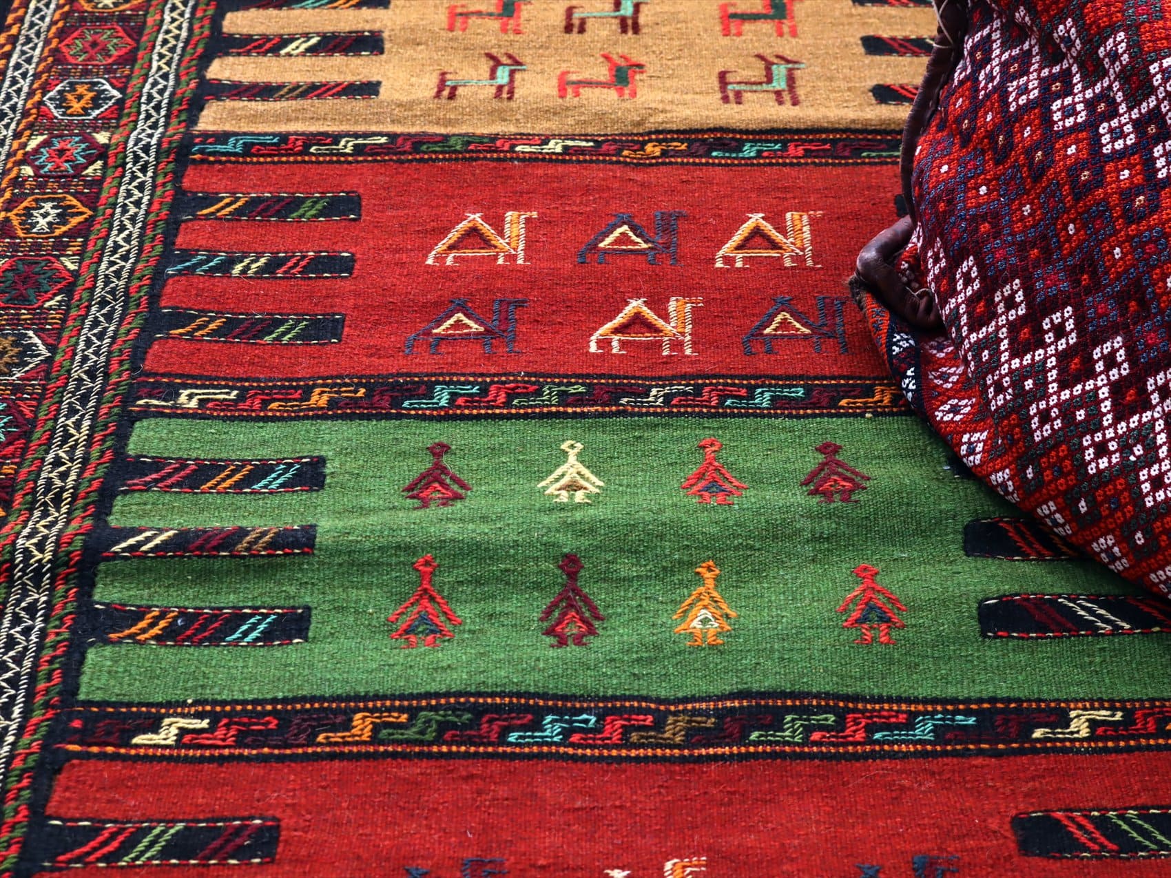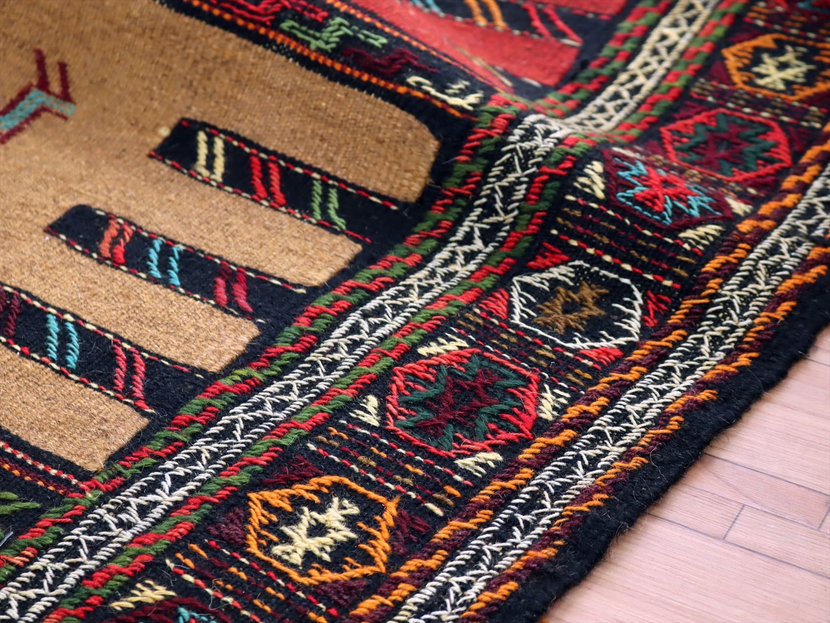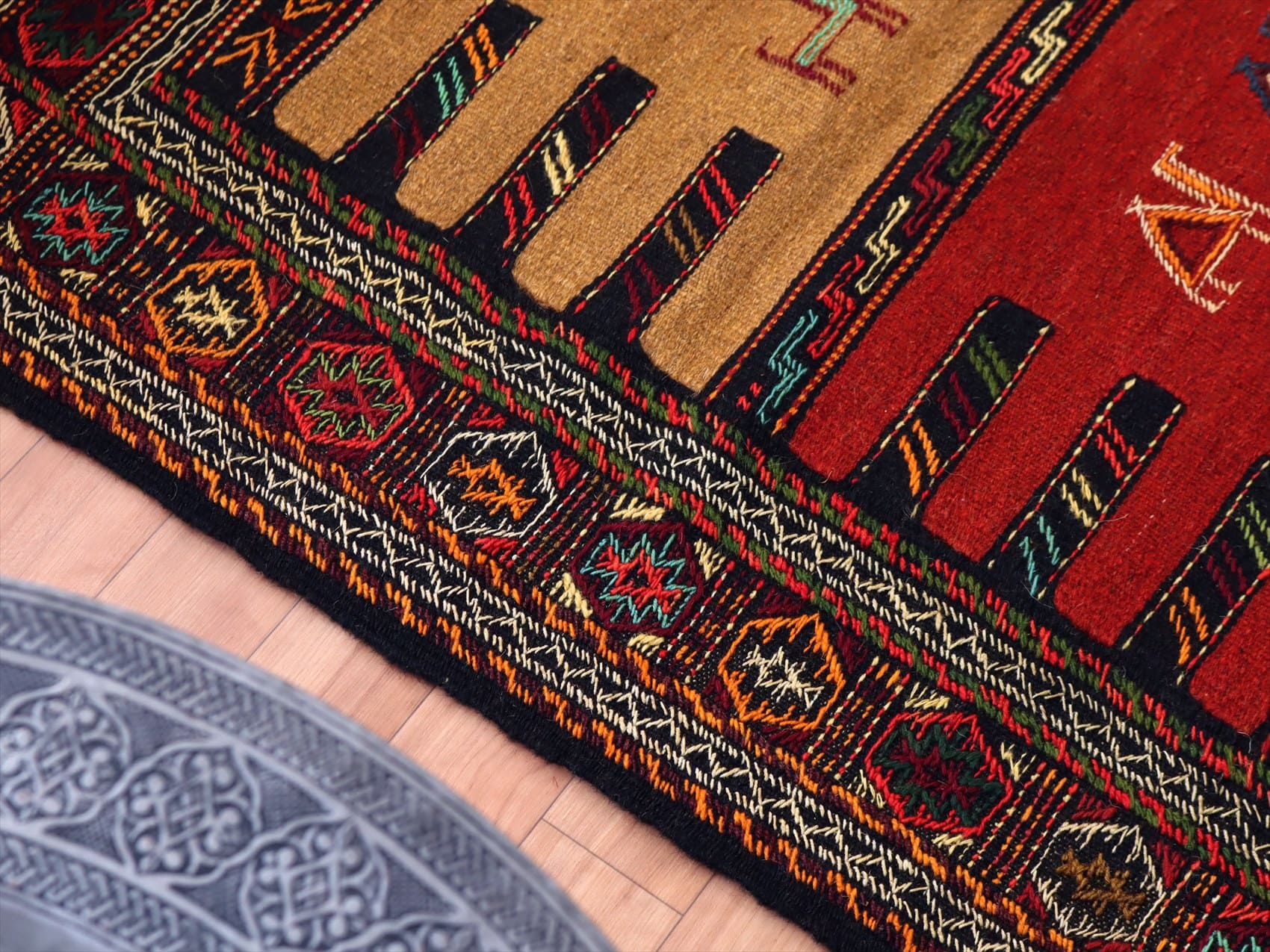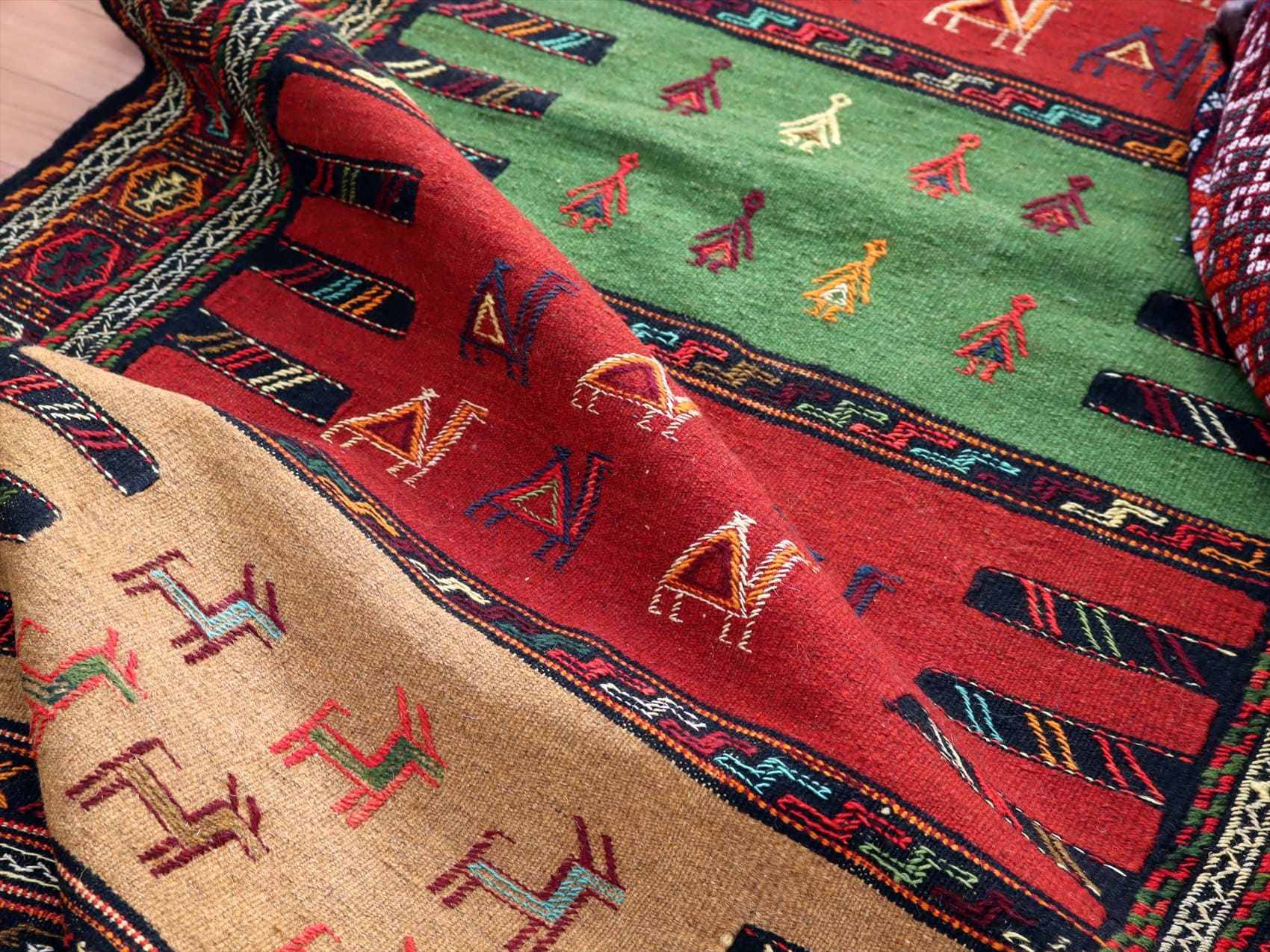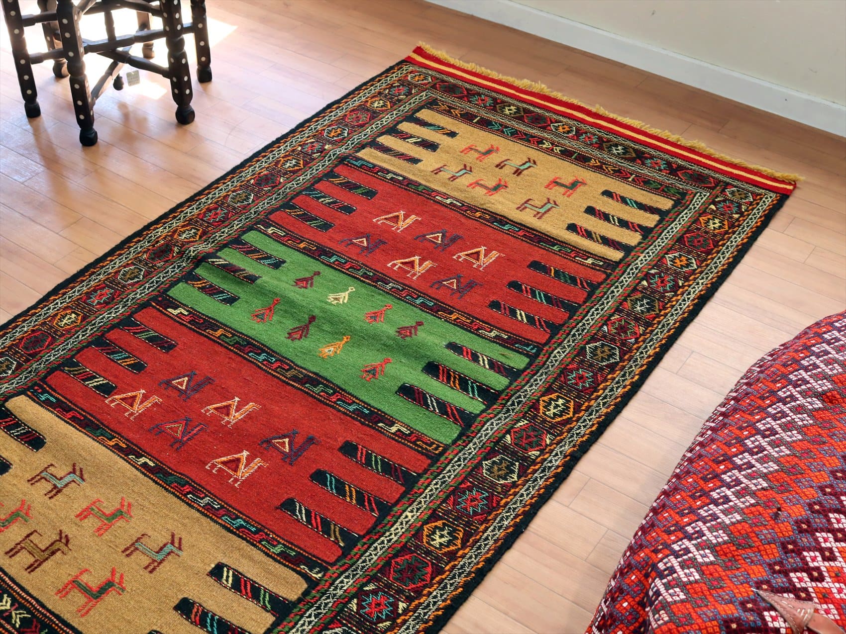 | イラン東北部、アフガニスタンに近い山間部のエリアに暮らすグチャン族の織ったキリム。素朴で力強いイメージで、シンプルな織りのキリムをベースに、動物や幾何学的にアレンジした様々なモチーフが立体的なジジム織りで、織り込まれています。 |