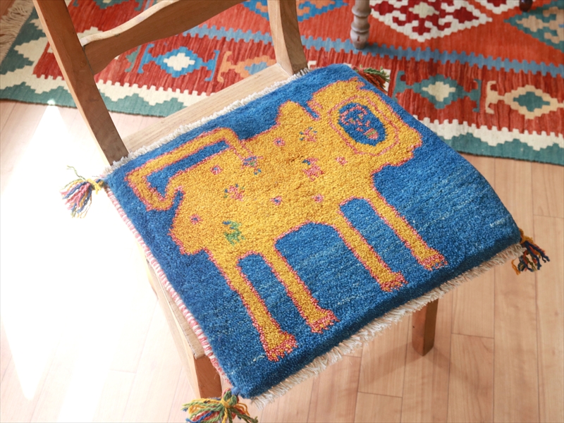 ライオンギャッベ41×43cm ブルー やさしい表情の人面ライオン ブルー