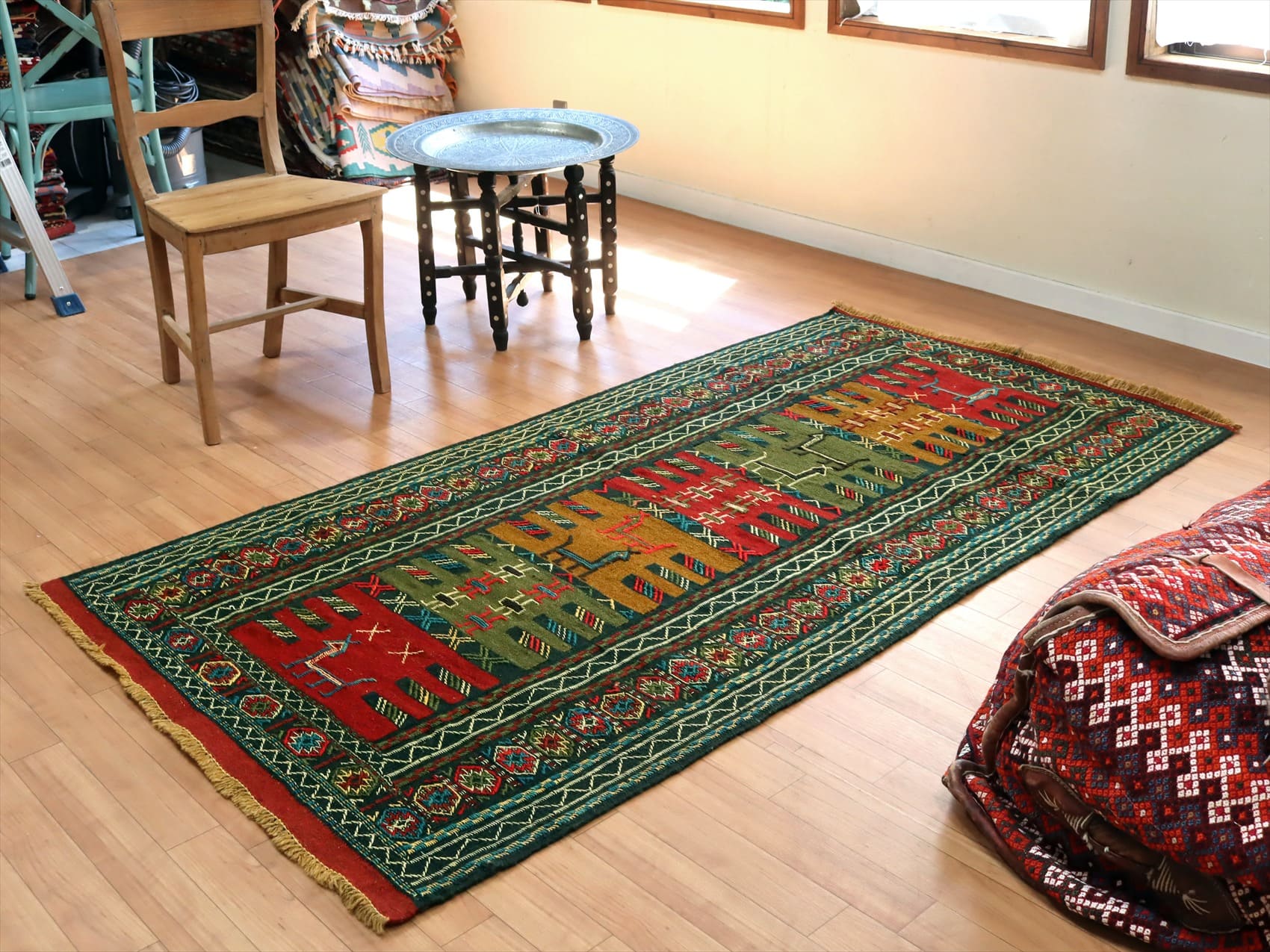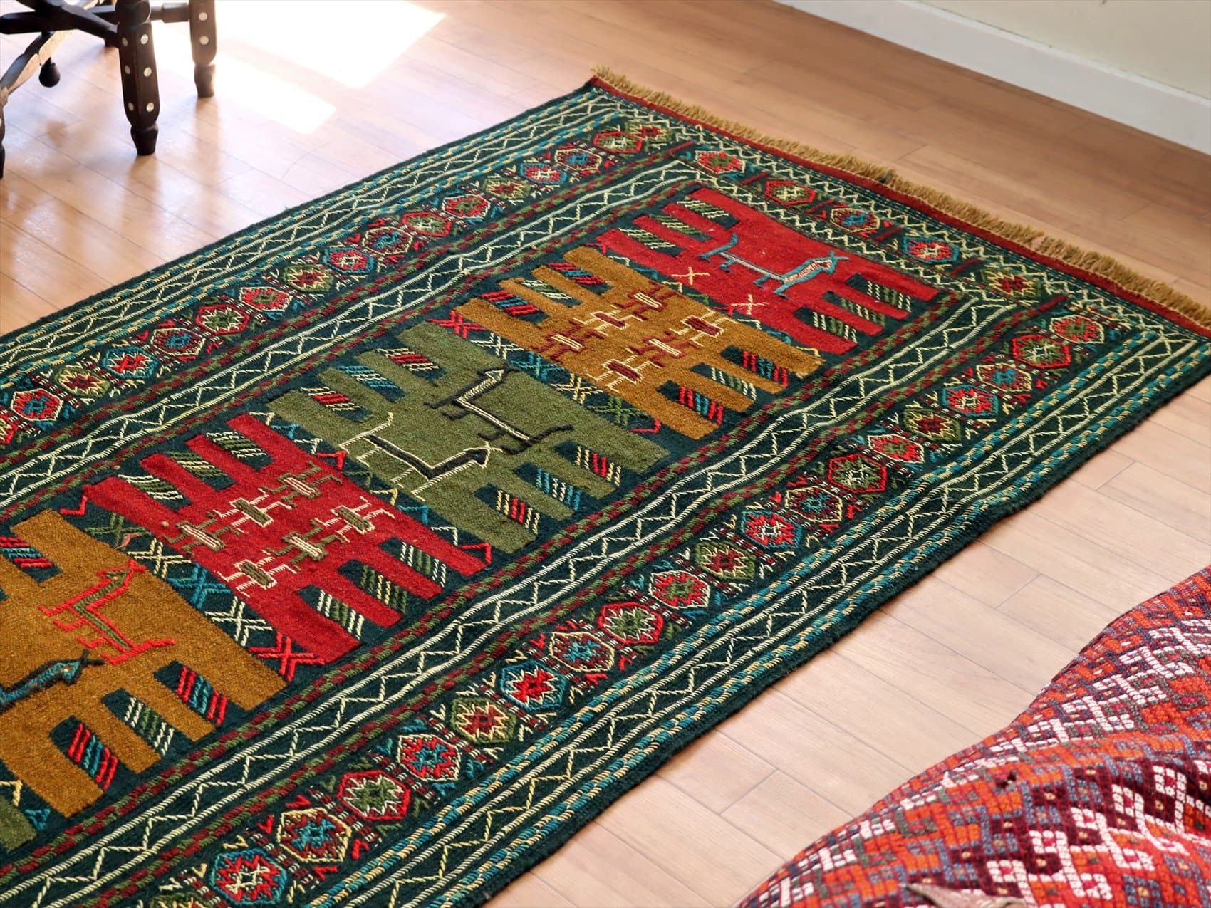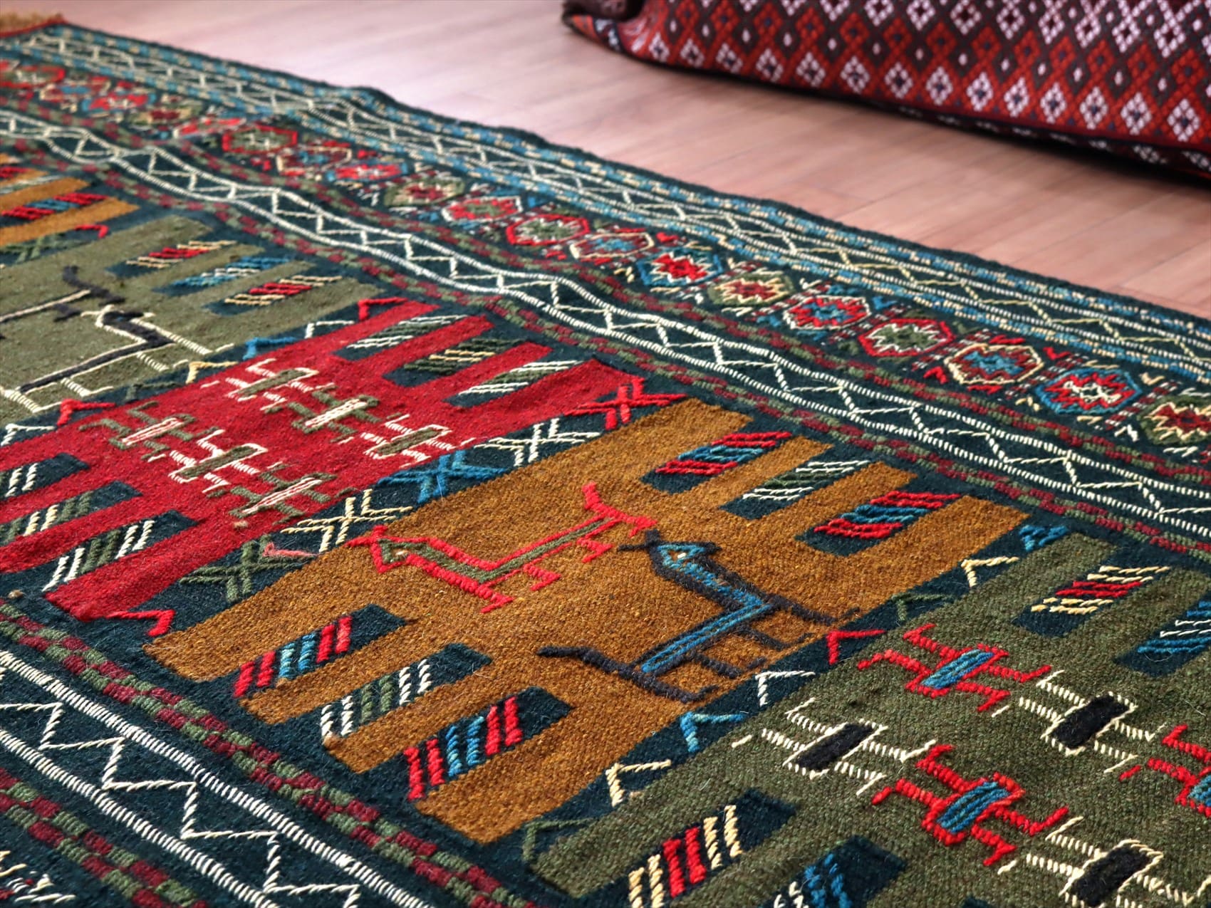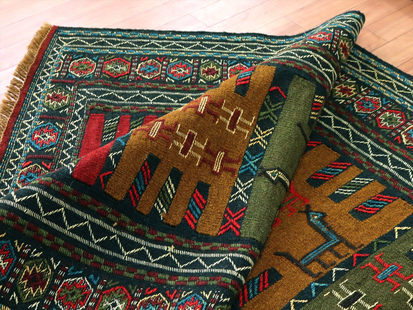 | イラン東北部、アフガニスタンに近い山間部のグチャンエリアのキリム。素朴で力強いイメージで、シンプルな織りのキリムをベースに、様々なモチーフが立体的なジジム織りで、織り込まれています。 |