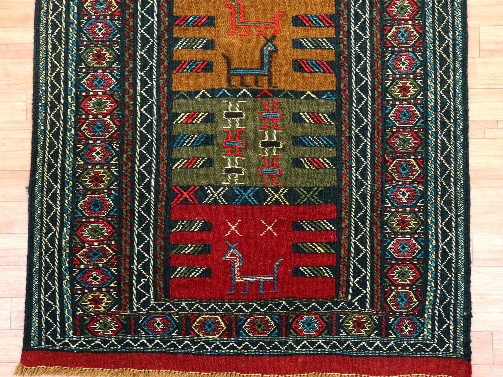 グチャン イランの手織りキリム200×103cm 動物と幾何学モチーフ
