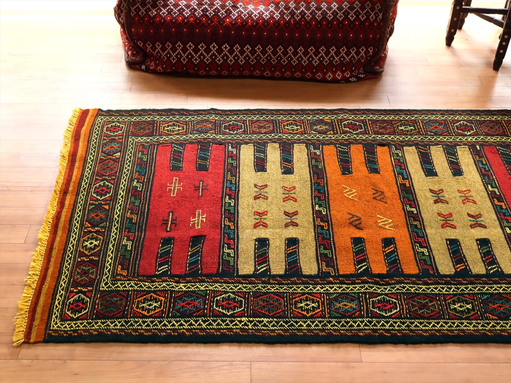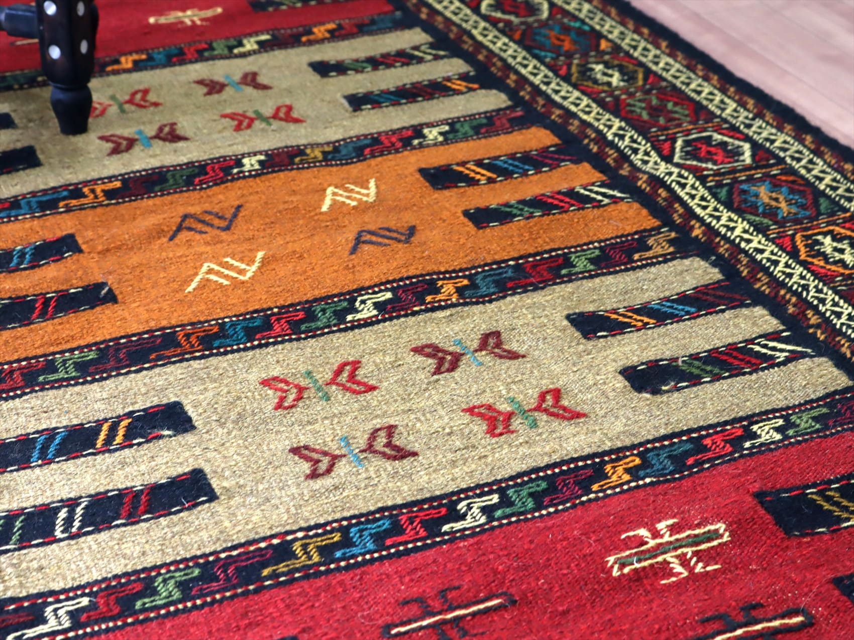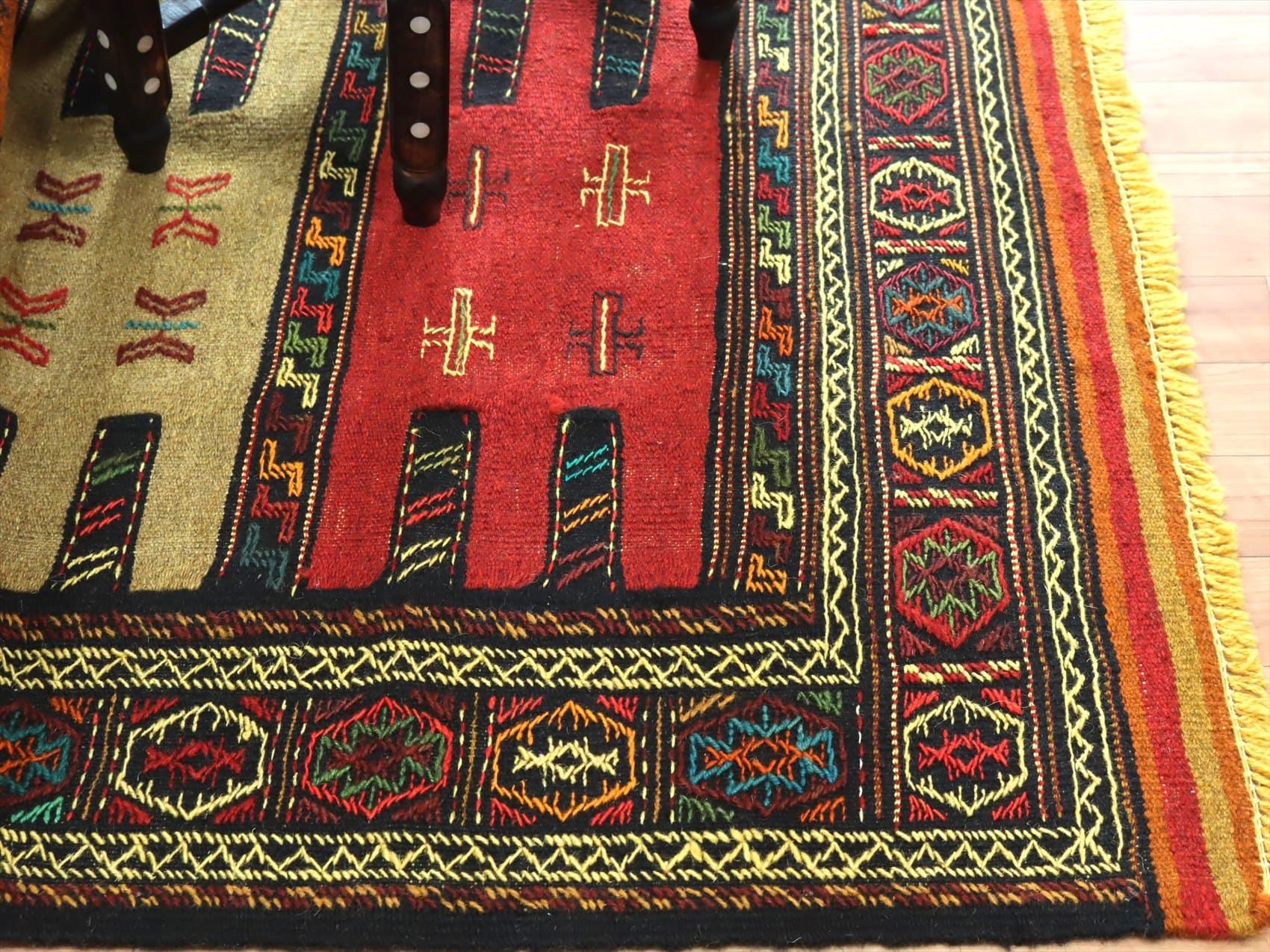 | イラン東北部、アフガニスタンに近い山間部のグチャンエリアのキリム。素朴で力強いイメージで、シンプルな織りのキリムをベースに、様々なモチーフが立体的なジジム織りで、織り込まれています。 |