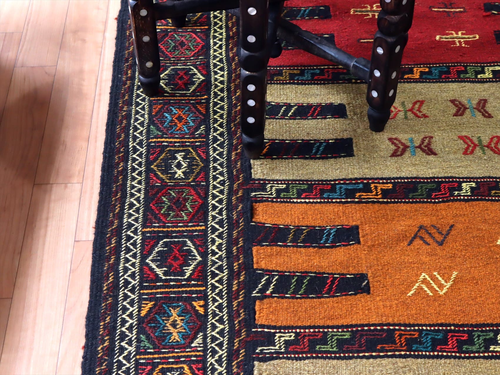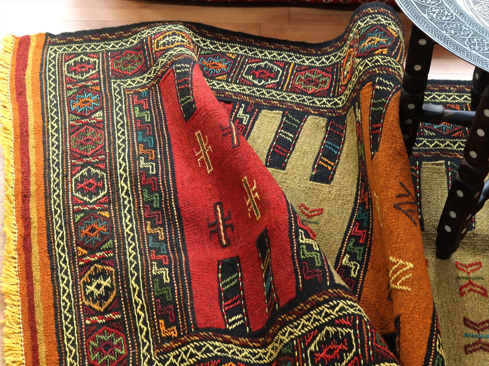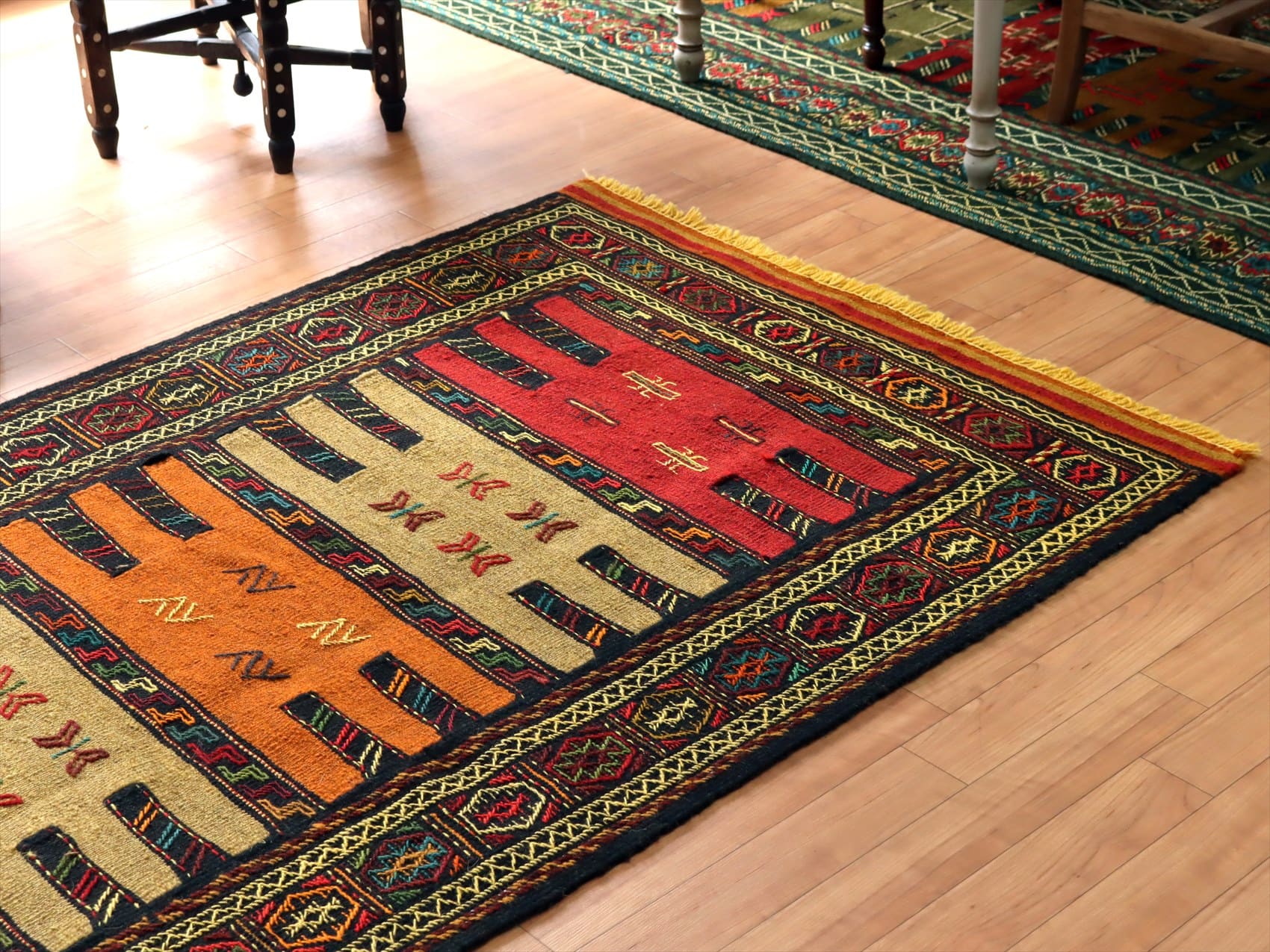 | イラン東北部、アフガニスタンに近い山間部のグチャンエリアのキリム。素朴で力強いイメージで、シンプルな織りのキリムをベースに、様々なモチーフが立体的なジジム織りで、織り込まれています。 |
