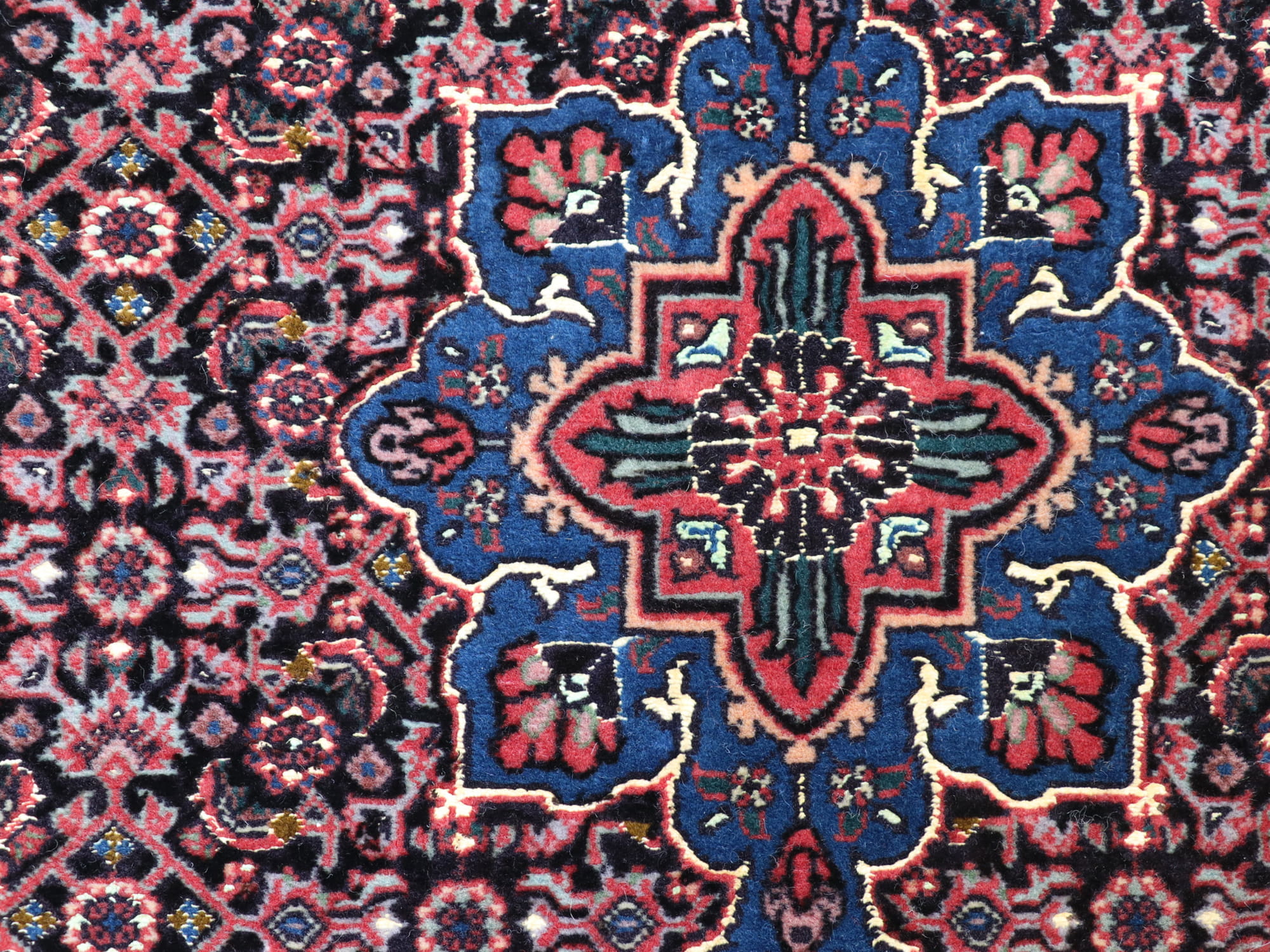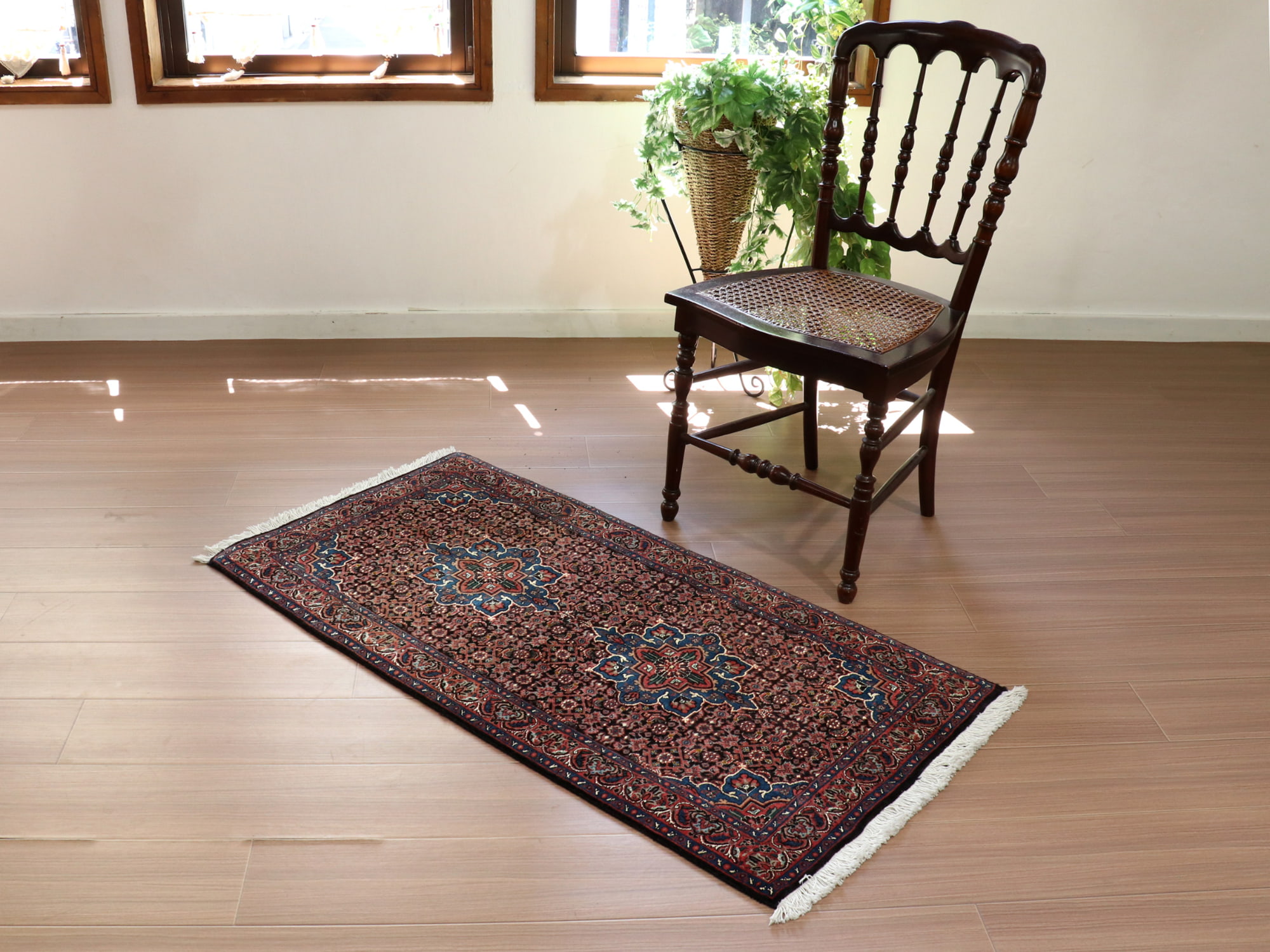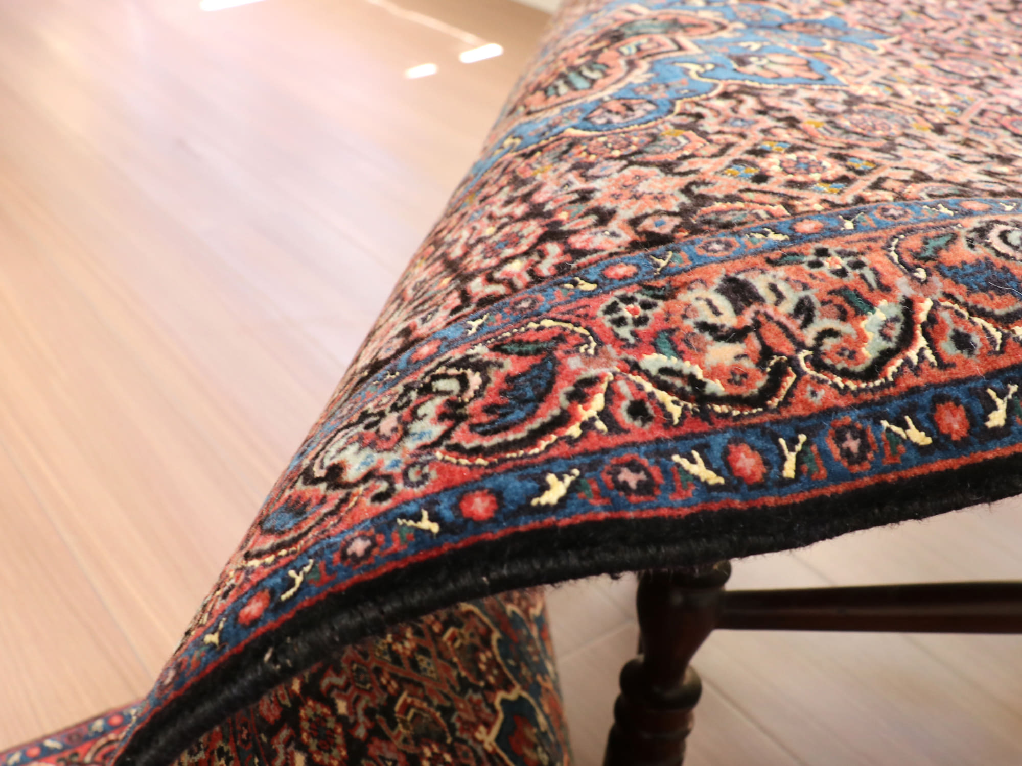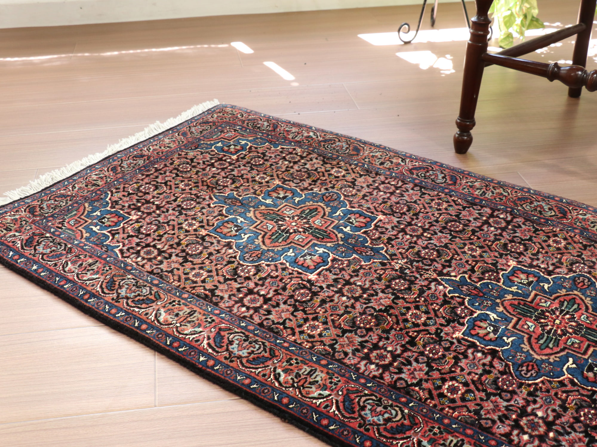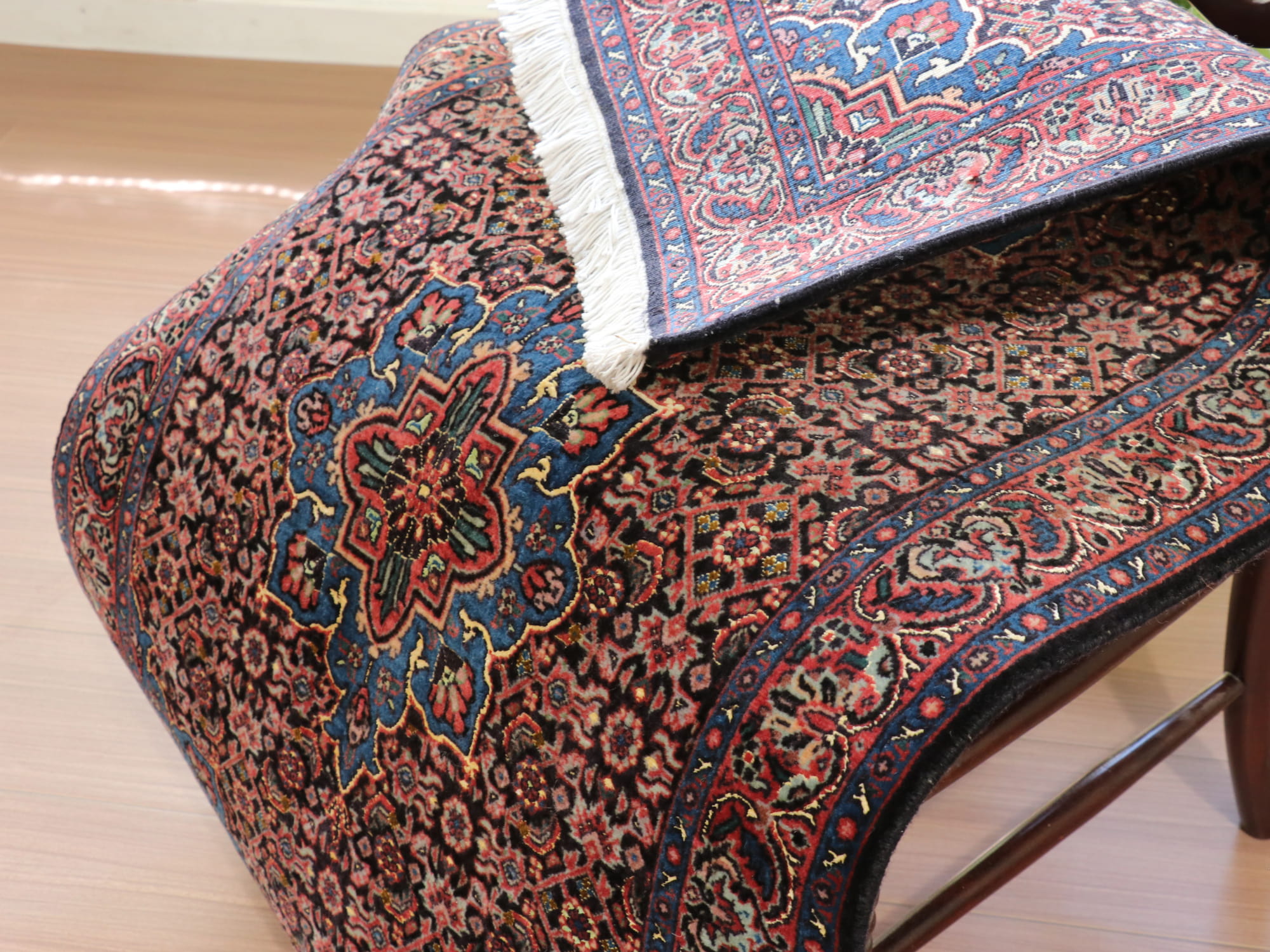 | 細かな織りで中央に青い花のようなメダリオンが2つ、そのまわりには小花のモチーフが連なるように織られた上品なデザイン。織り地の一部にシルクが使われており、この絨毯のデザインをより引き立てています。こちらはイラン北西にある都市ビジャールで織られた絨毯です。ビジャールの絨毯は織りの目が詰まっており、砂やほこりが入りにくいため耐久性に優れていると言われています。 |