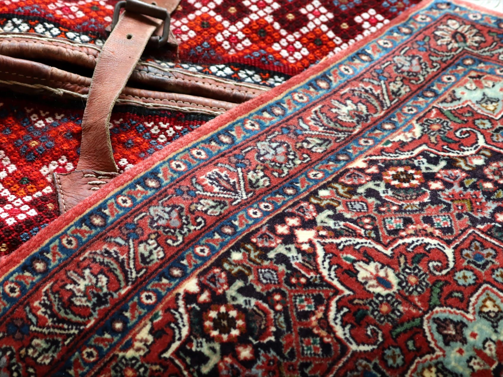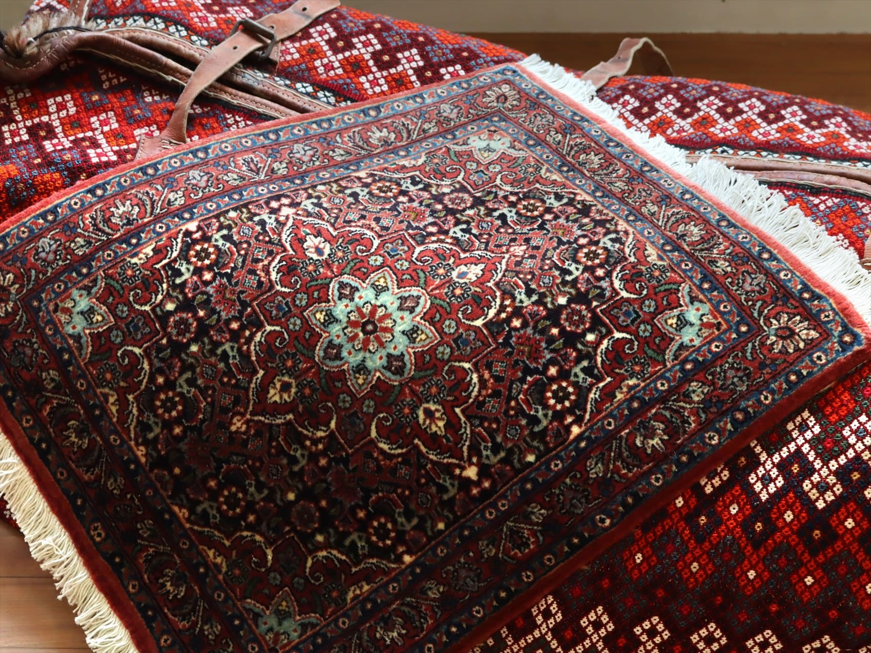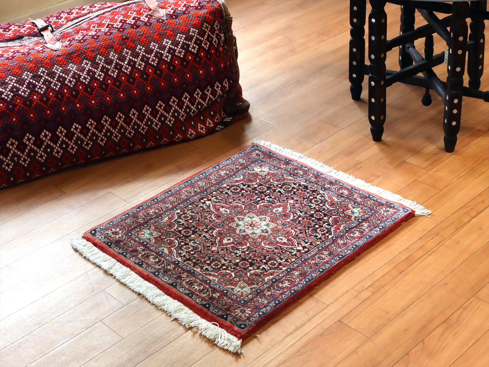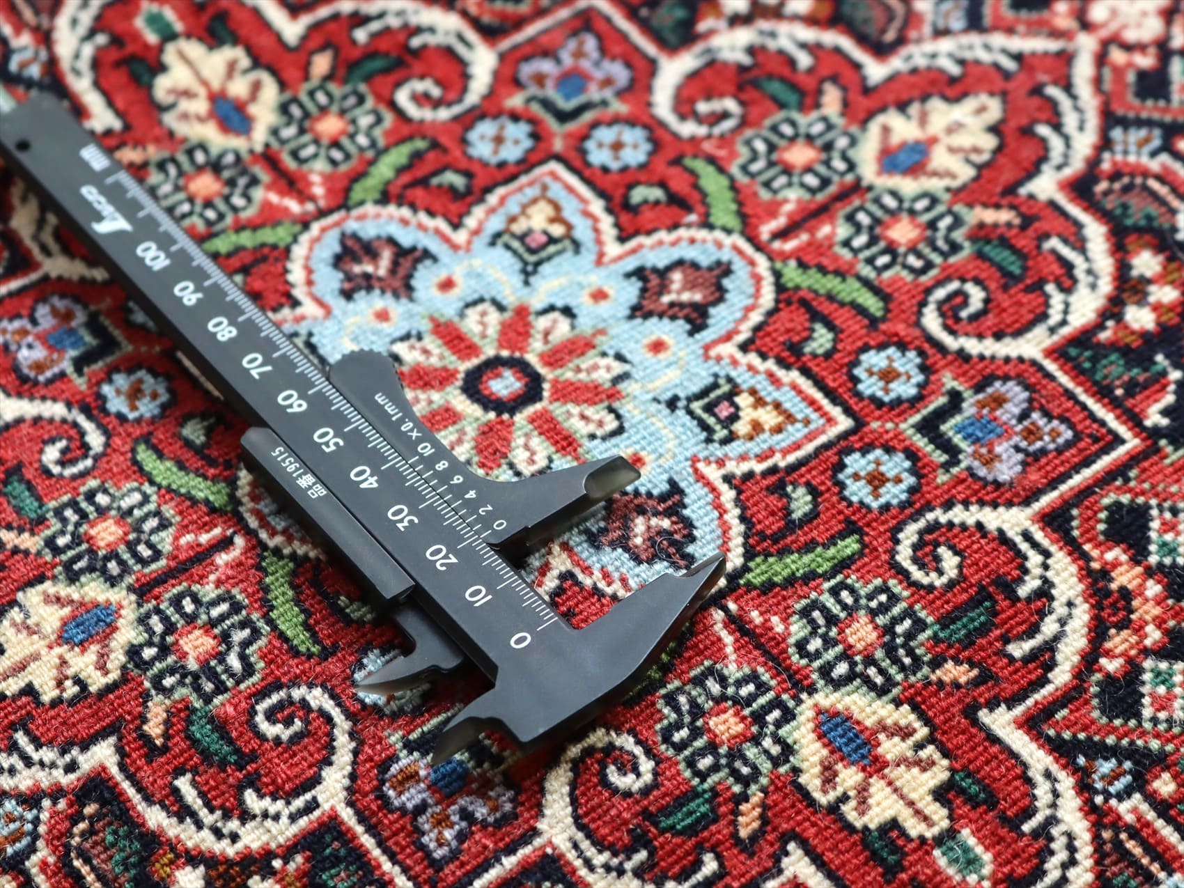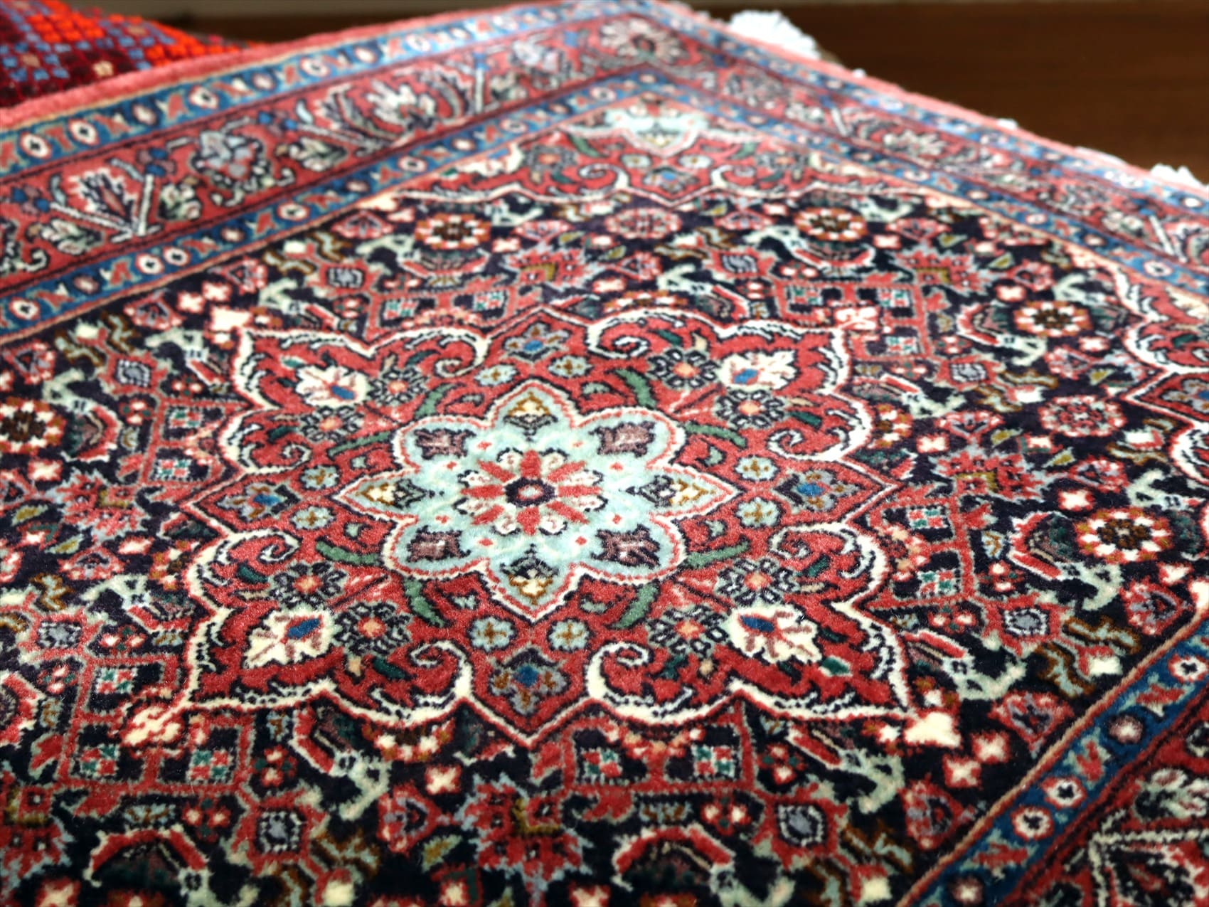 | 細かな織りで中央に赤い花のようなメダリオン、そのまわりには小花のモチーフが連なるように織られた上品なデザイン。こちらはイラン北西にある都市ビジャールで織られた絨毯です。ビジャールの絨毯は織りの目が詰まっており、砂やほこりが入りにくいため耐久性に優れていると言われています。 |