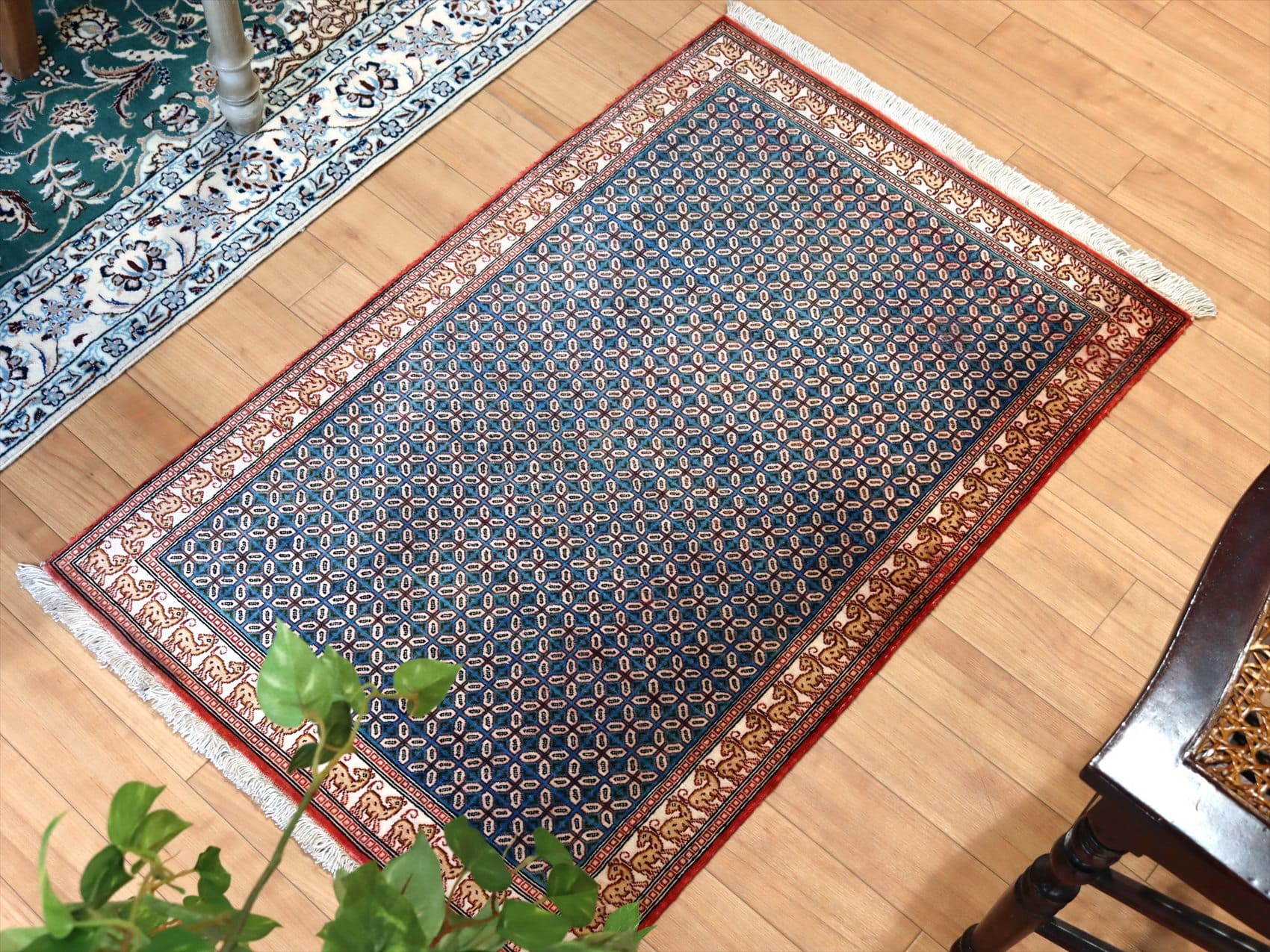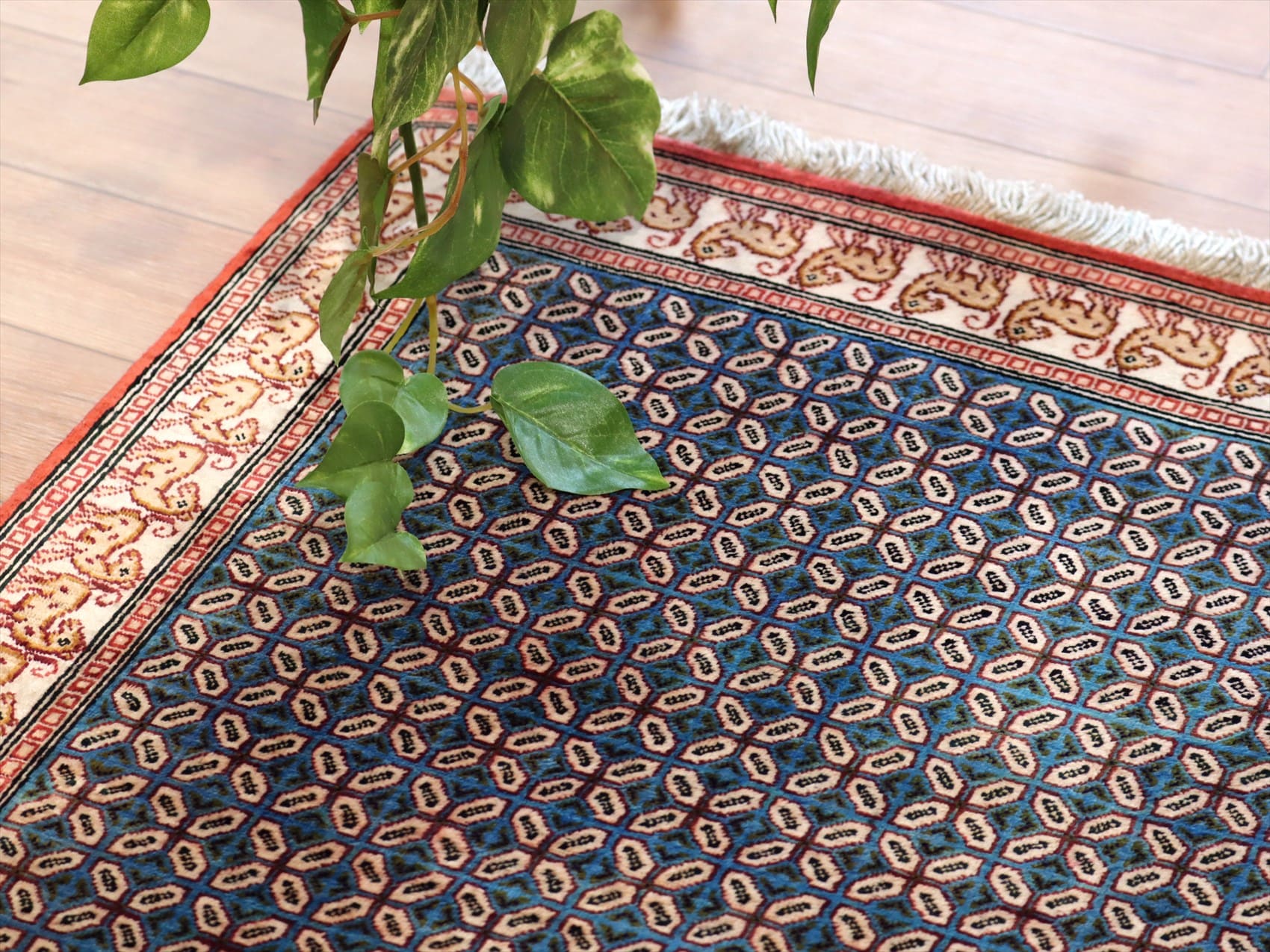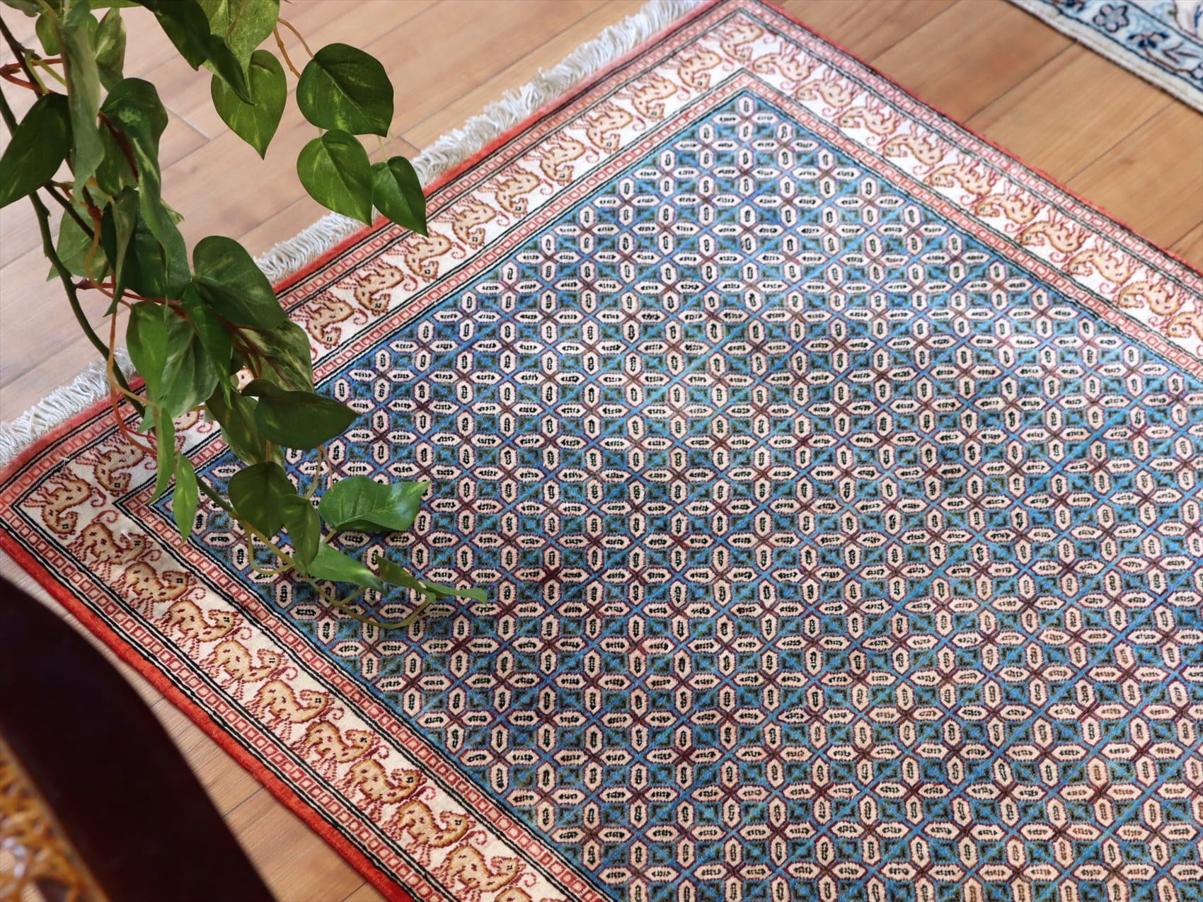 ペルシャ絨毯 クム産90×58cm ターコイズ アイボリー
